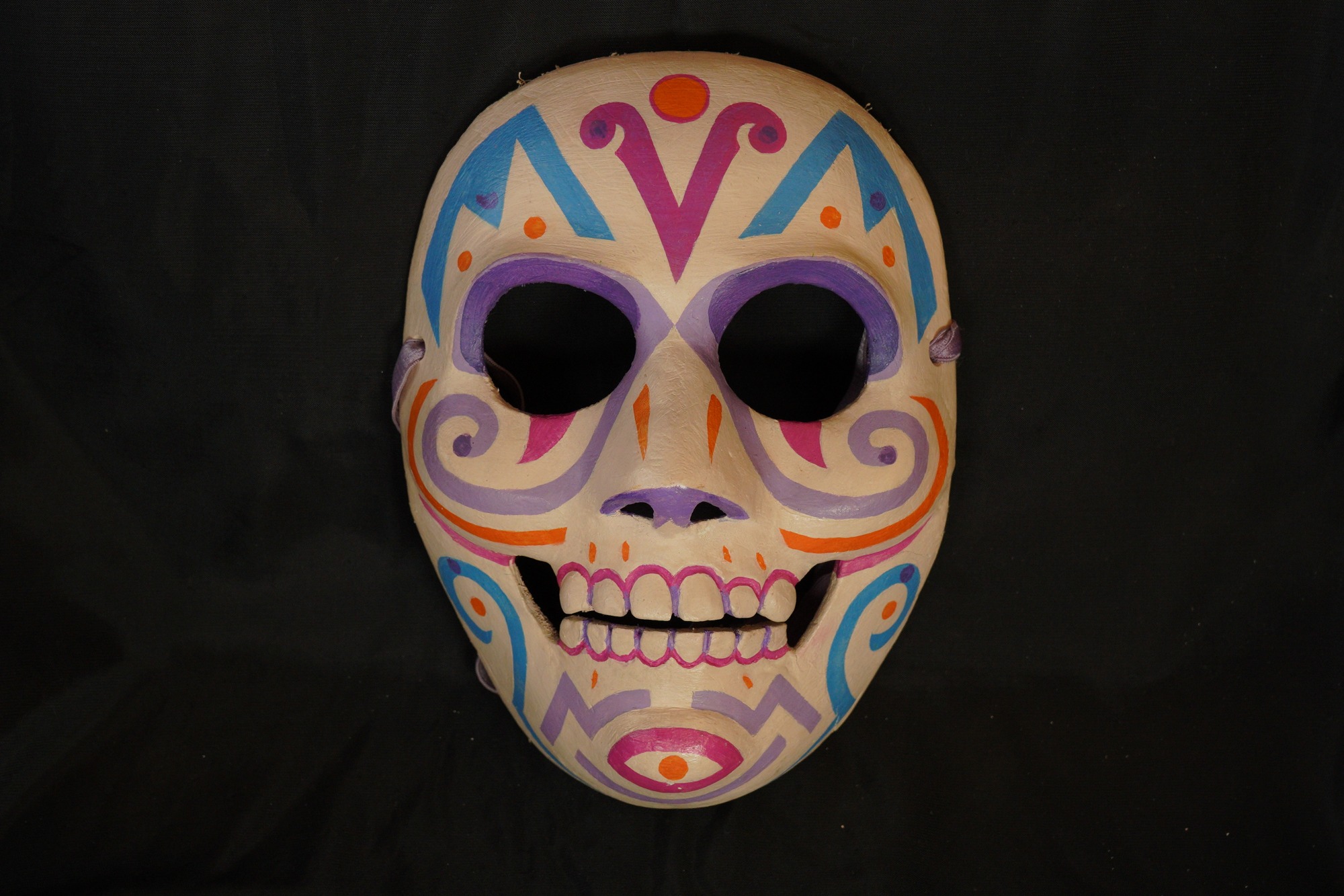 Calaca mask with off-white painted base. Pink, blue, purple, and orange color scheme. Top borders of eyes painted in light and dark purple. Light purple swirls starting at eyes and extending to cheeks on both sides. Orange and yellow lines on each side of the cheek, underneath the purple swirl. Blue swirls on each side of the jaw. Pink eye-shaped outline on chin with an orange dot in the center. Orange dot on the center of forehead outlined in pink. Purple nose tip. Outer border of teeth outlined in pink, inner border outlined in purple.