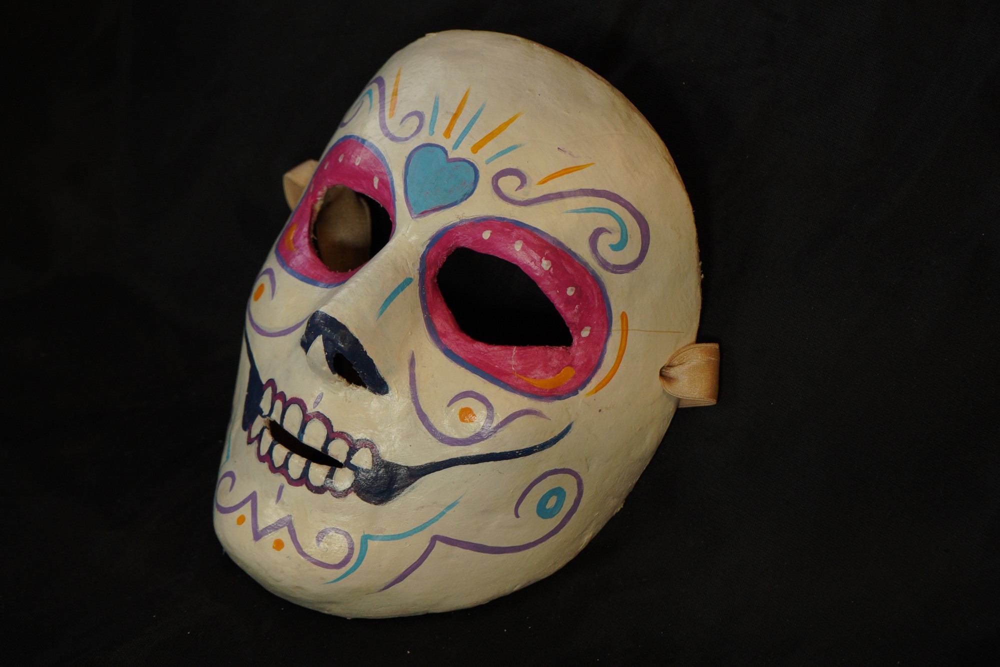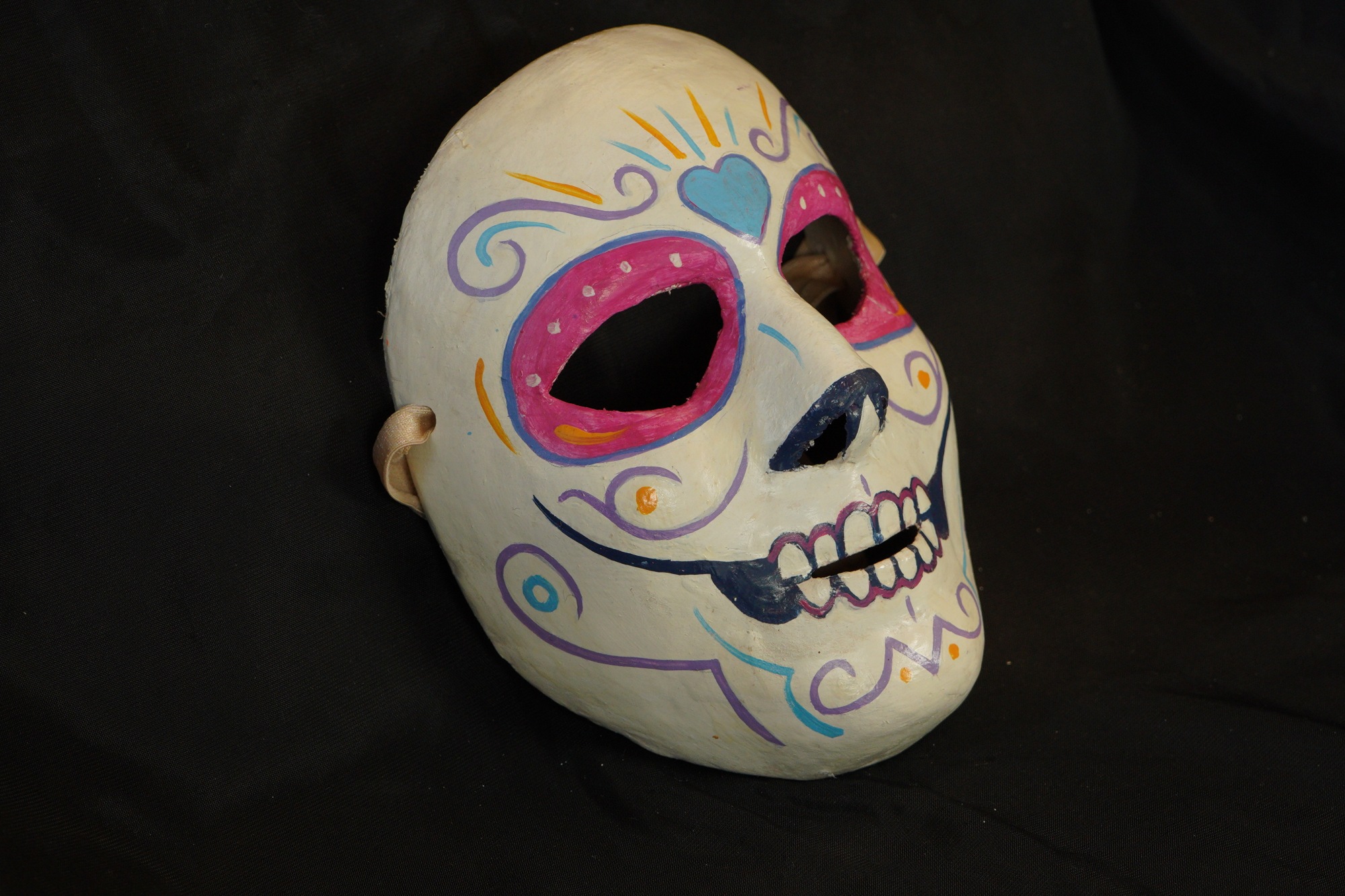 Calaca mask with off-white painted base. Blue heard in between the eyebrows, outlined in purple. Border of eyes painted in pink and outlined in blue with white dots inside. Black nose tips. Outer border of teeth painted in red, inner border painted in black. Purple swirls on each side of the forehead, cheeks, jaw, and chin. Blue and orange brush stroke lines on the forehead.