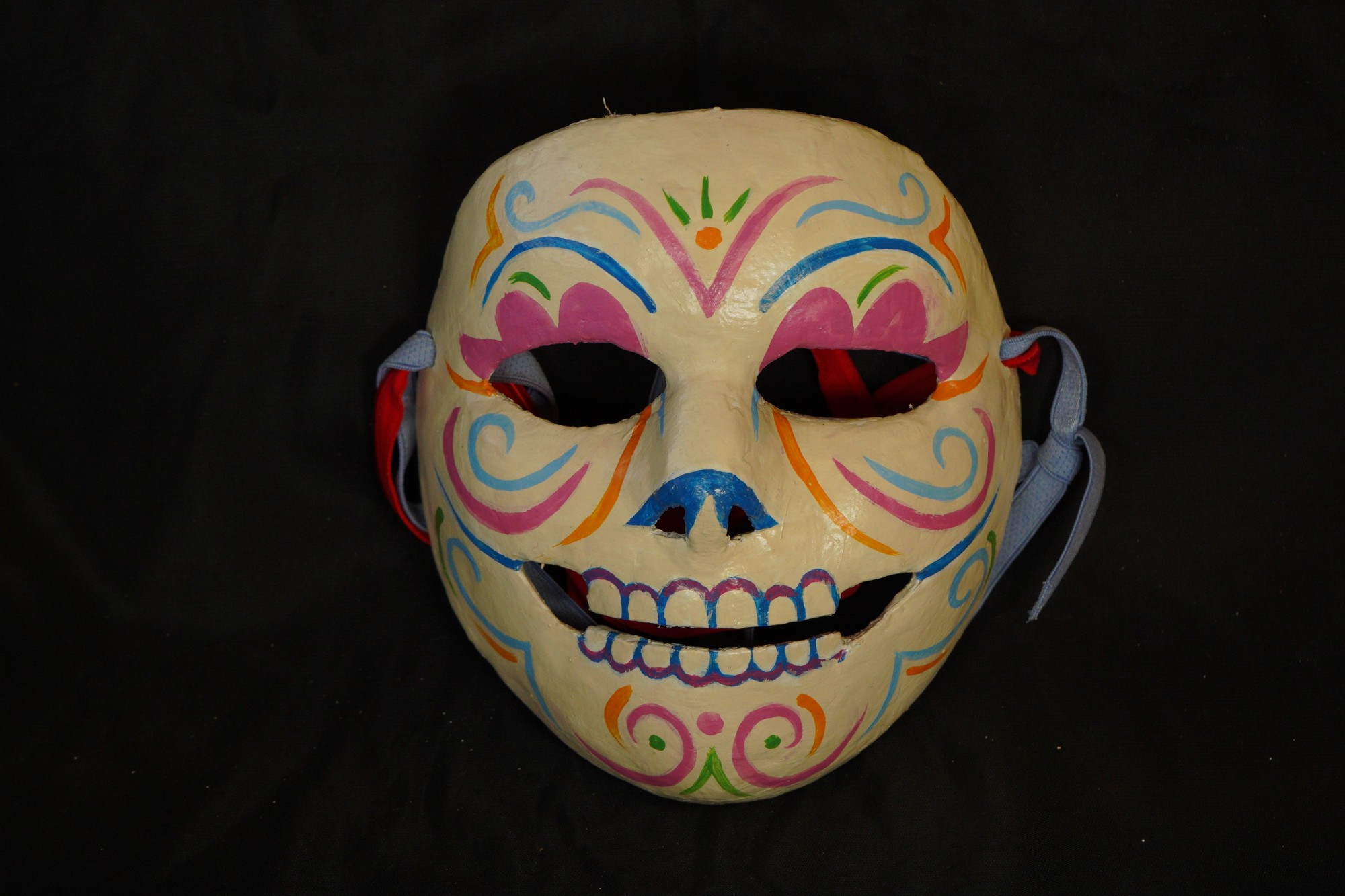 Calaca mask with off-white painted base. Top border of eyes painted in pink flower shape with three petals. Blue nose tip. Light blue and pink swirls on the cheeks. Dark blue eyebrows. Pink swirls on the chin, with a pink dot in the center. Two green dots on chin along with a triangular-shaped line. Orange dot at the center of forehead with three green brush stroke marks above. Upside down, triangular-shaped pink line below the orange dot.