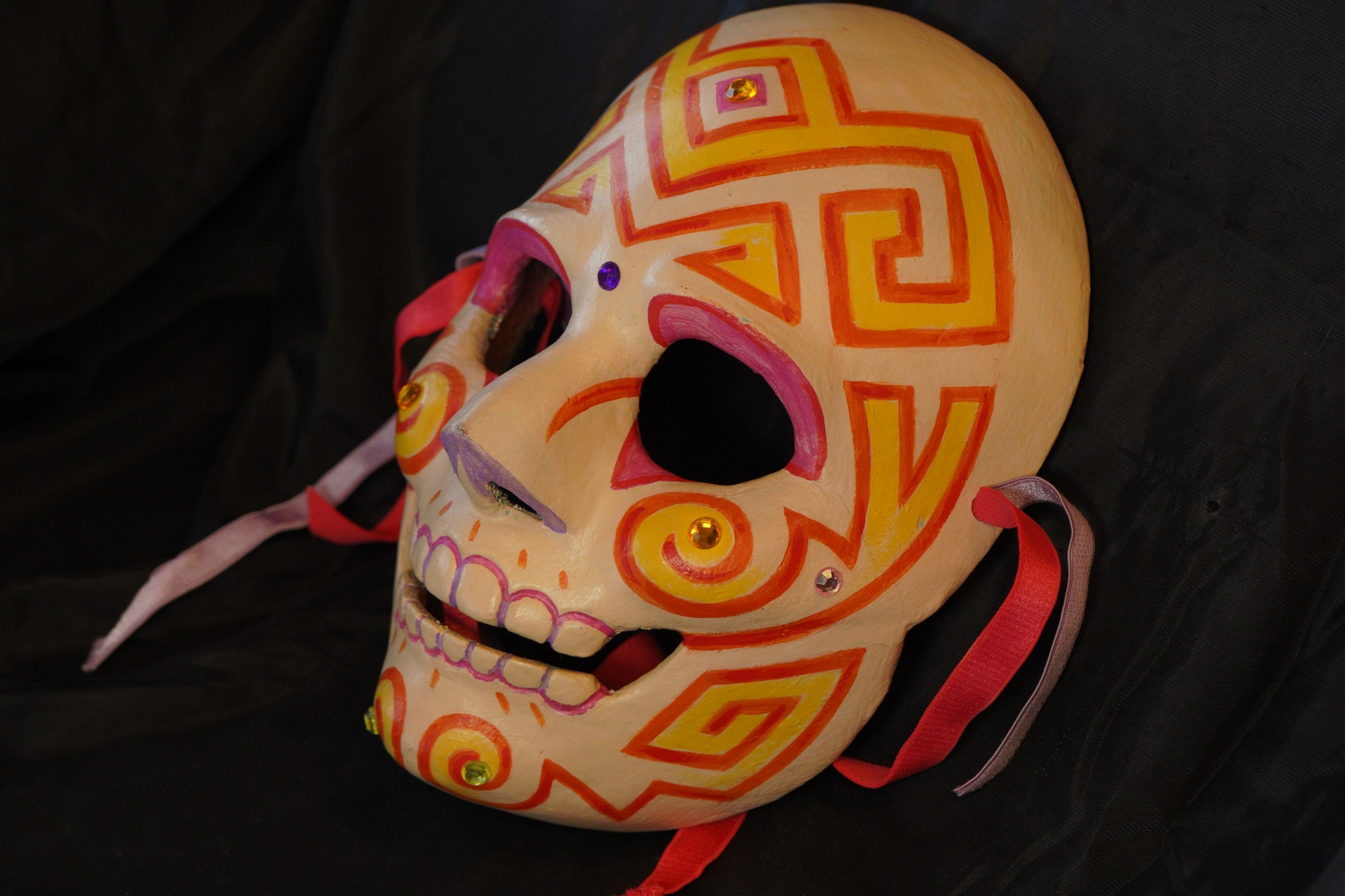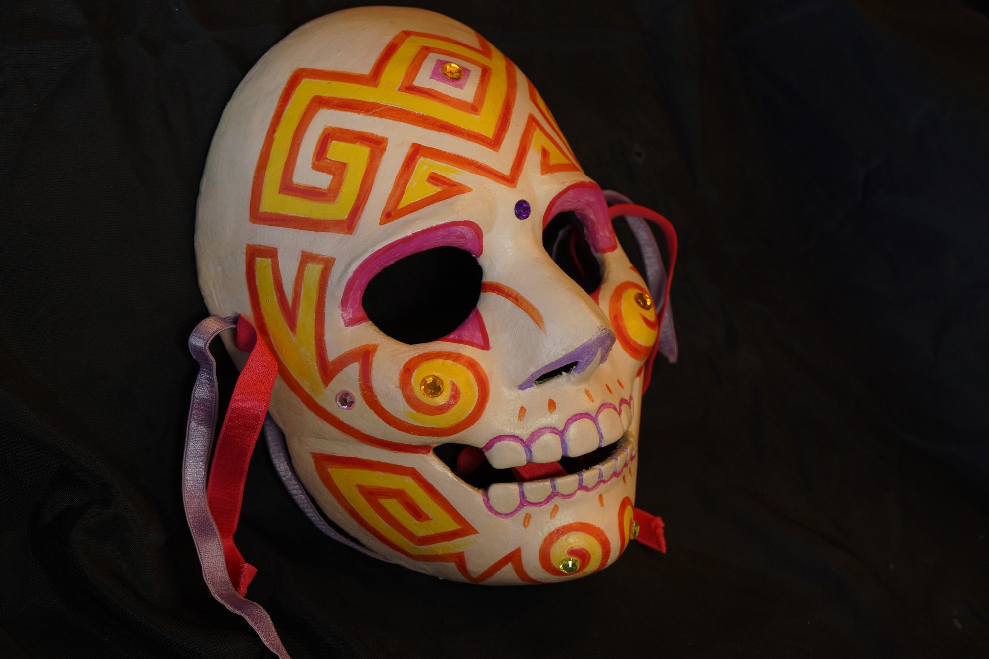 Calaca mask with off-white painted base. Designs painted primarily in an orange and yellow southwest-like pattern with small pink and purple details near the eyes and the teeth. Two gem embellishments on the cheeks; one yellow and the other pink. Additional yellow gems on the center of the forehead and on the chin. Final purple gem in between the eyebrows.