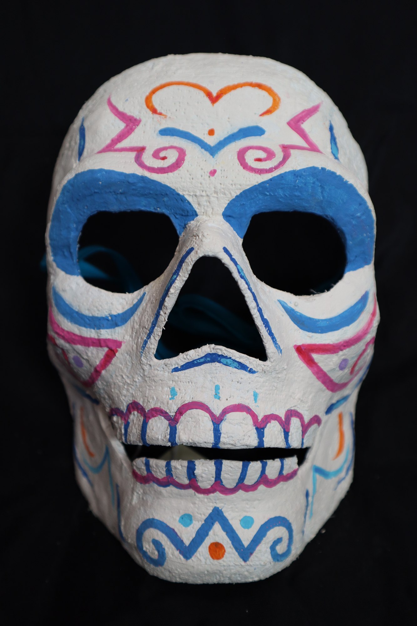 Artist considers these his quintessential Calaca. They are all individual but part of the same family style. Created on a mold to disseminate the mask art form and make them available and more affordable to collectors. They are also wearable, best of all.