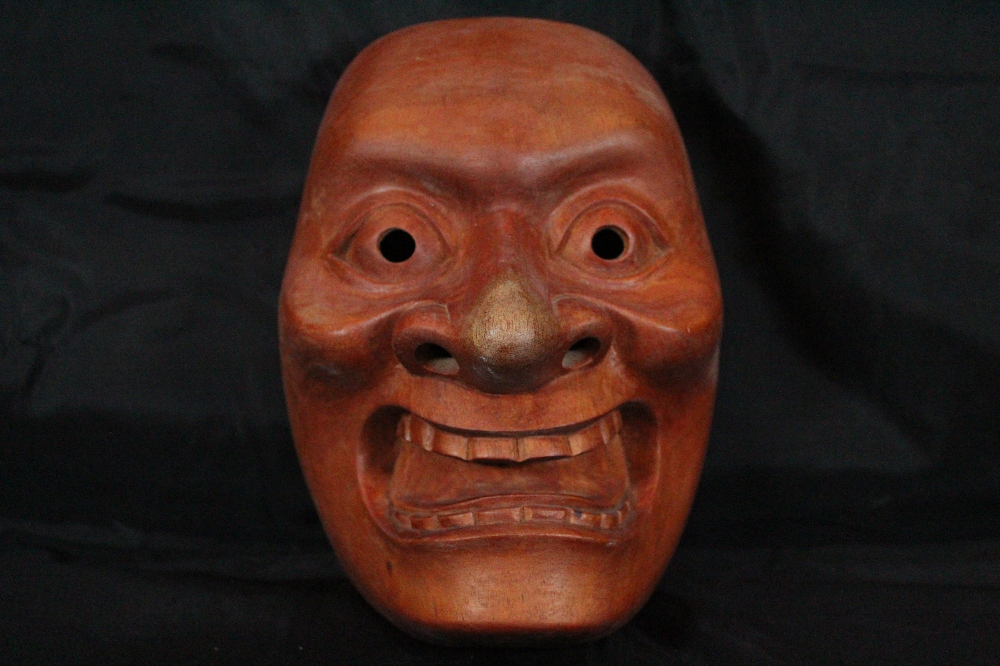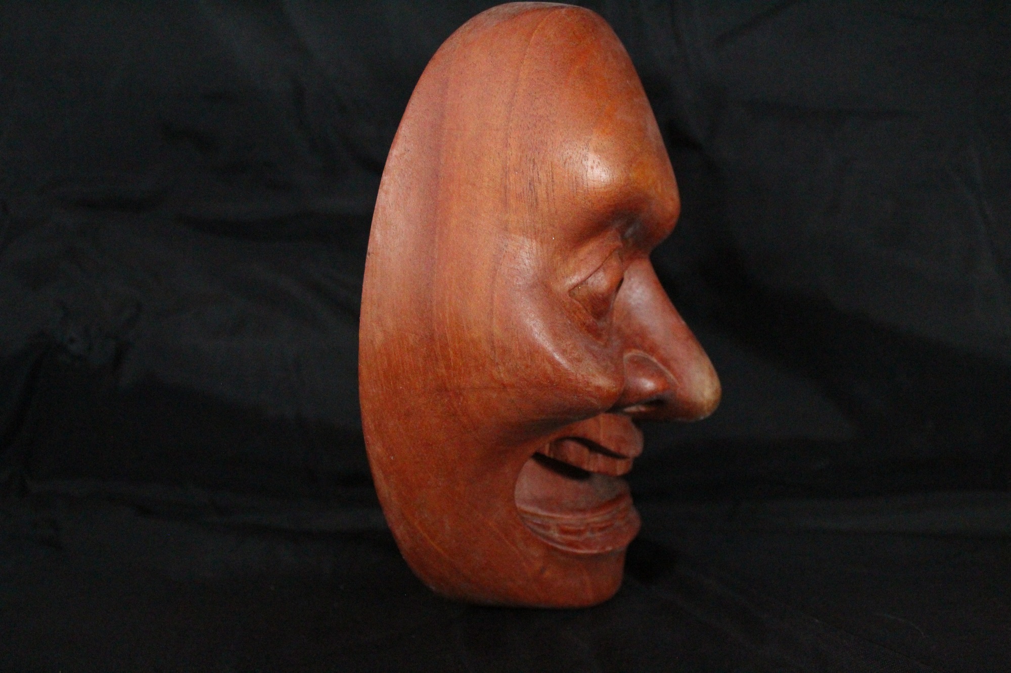 Mask carved with matte finish. Round eyes with circle shaped pupils carved and punched out. Lighter wood splotch on the tip of the nose. Narrow, defined cheeks with indentations between the inner cheeks and nose. Mouth opened wide with both rows of teeth showing; eight on each row. Dark wood grain dot on the left side of the chin.