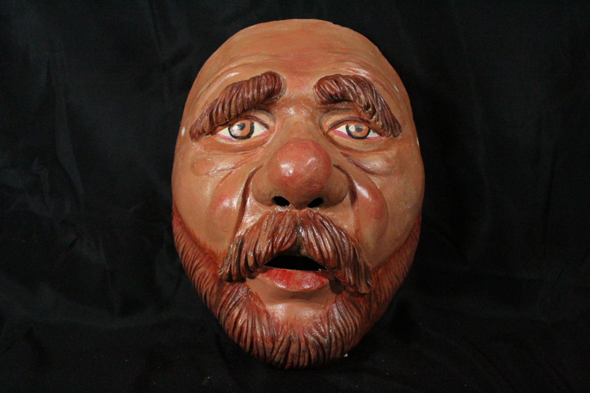 Full face male figure handheld mask. Face has slightly sad expression with eyebrows curved down on the sides, slightly covering the eyes. Eyebrows, mustache and full beard raised sculpted with carved hairlines are all painted a dark brown with red highlights. Eyes have light brown iris, black outlines, and white on either side. Slightly sculpted bags under the eyes, and deep wrinkle crease in either side of nostrils, painted brown to add depth. Nose is large and rounded on the end, tinted red. Mouth is parted open with bottom lip painted red.