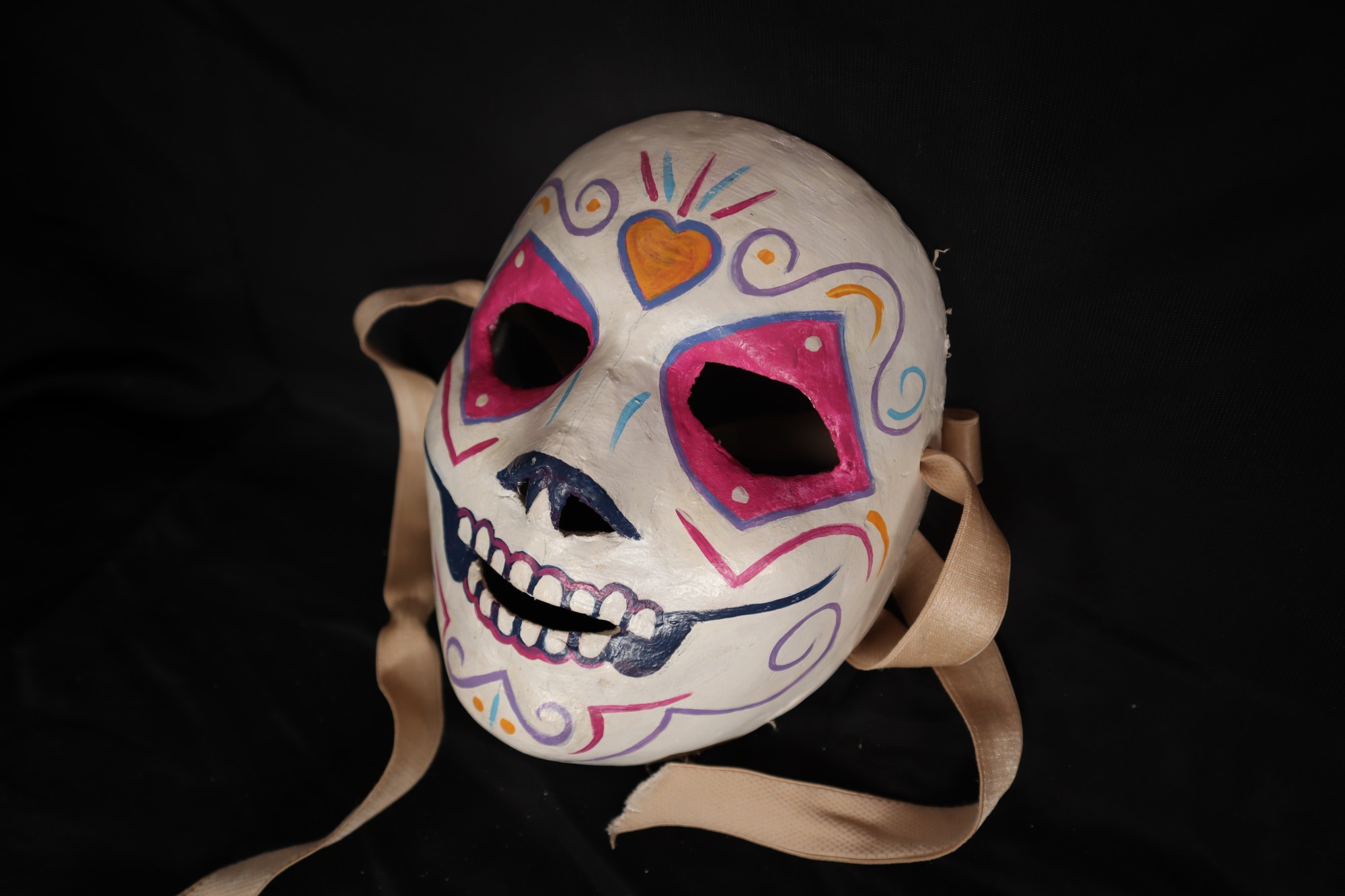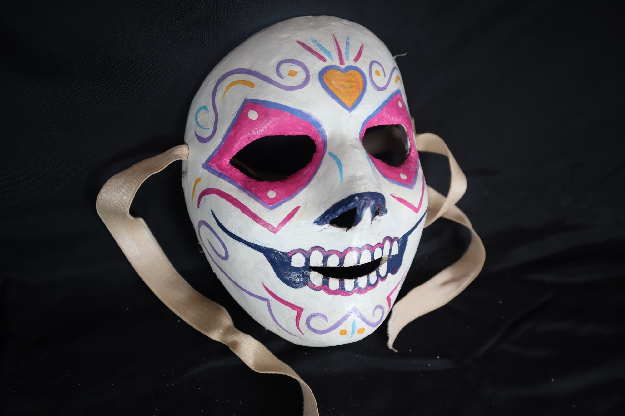 Shelda. Full face mask used in performances by Arizona theater and dance companies. It has tan ribbons attached to the sides. At the center of the forehead is a burning heart in orange with light rays in pink and blue on either side of the heart-shaped swirls. The eyes are outlined in a bright pink diamond-like design. The nose is dark blue the teeth and mouth are outlined in dark blue, creating a large smile on the chin is pink and blue triangular shapes.