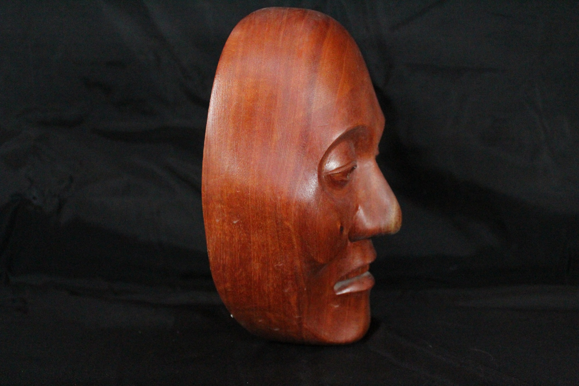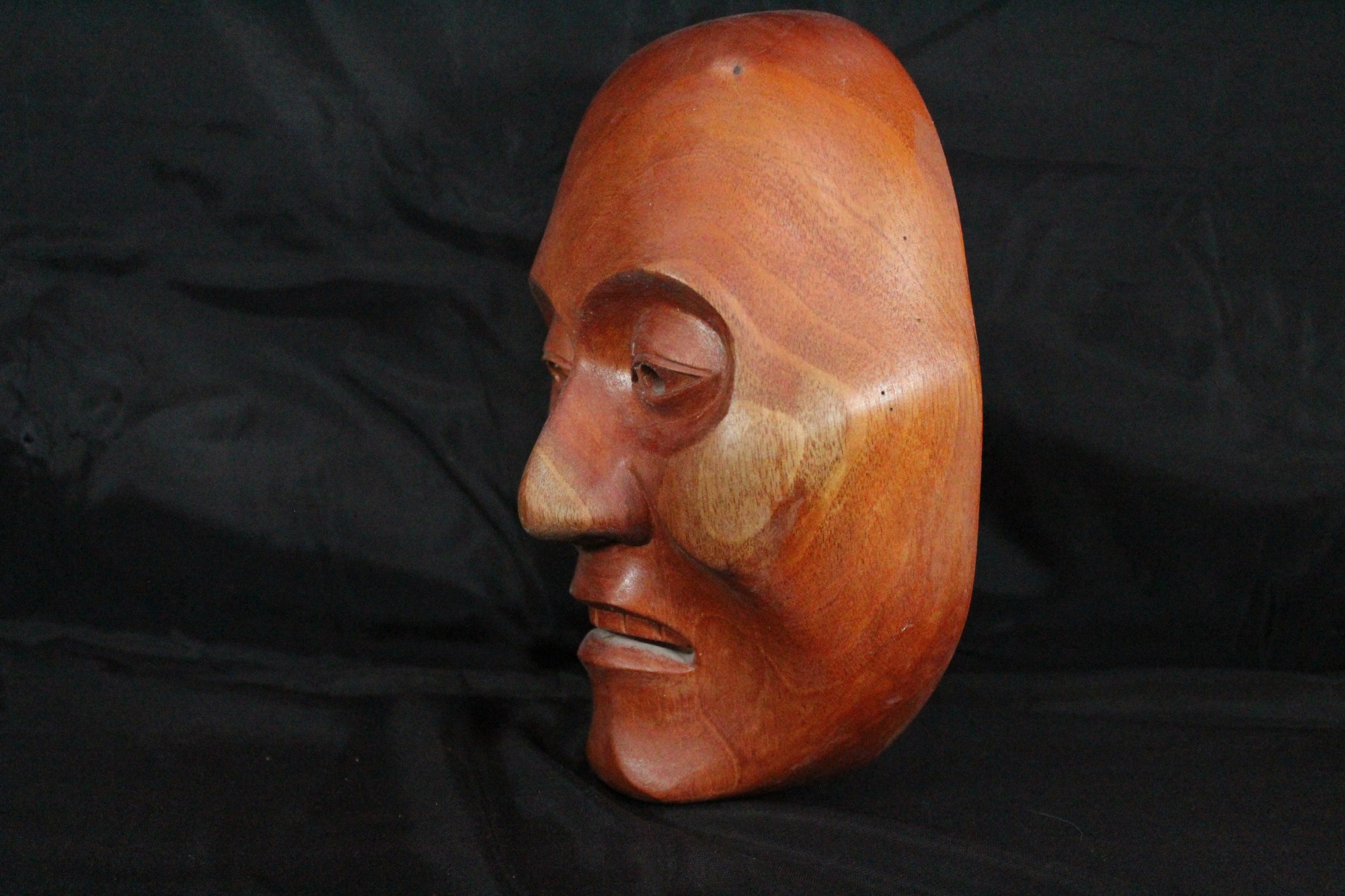 Almond shaped eyes with circle shaped pupils carved and punched out. Shallow line carved on both eyelids. Shallow circles carved around both eyes. Lighter wood splotches on the tip of nose and the right cheek. Dark wood grain dot on the left cheek. Small mouth slightly opened and downturned. Top row of six teeth is visible.
