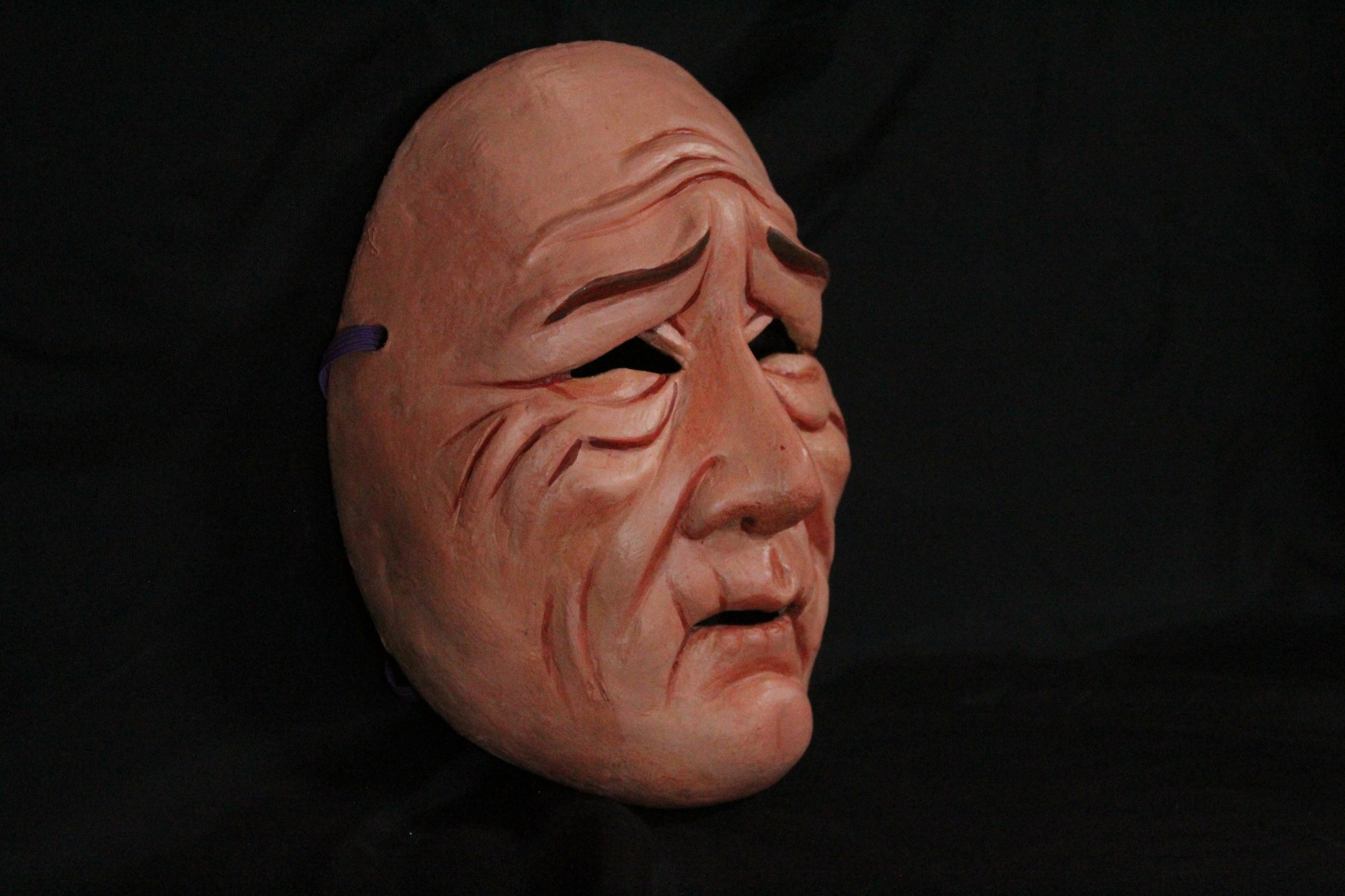 Shoko. Plaster bandage, paper clay decorated with acrylic paint. Old person face mask in a slightly sad or worried expression. Has many lines/wrinkles on the forehead, around the eyes, nose, and mouth and on lips. Eyebrows are thick and droopy over eyes, with bags under eyes as well. Mouth is open with thin pursed lips. Mask is painted in flesh tones with dark brown eyebrows. Lines and wrinkles painted with red/brown clay color.