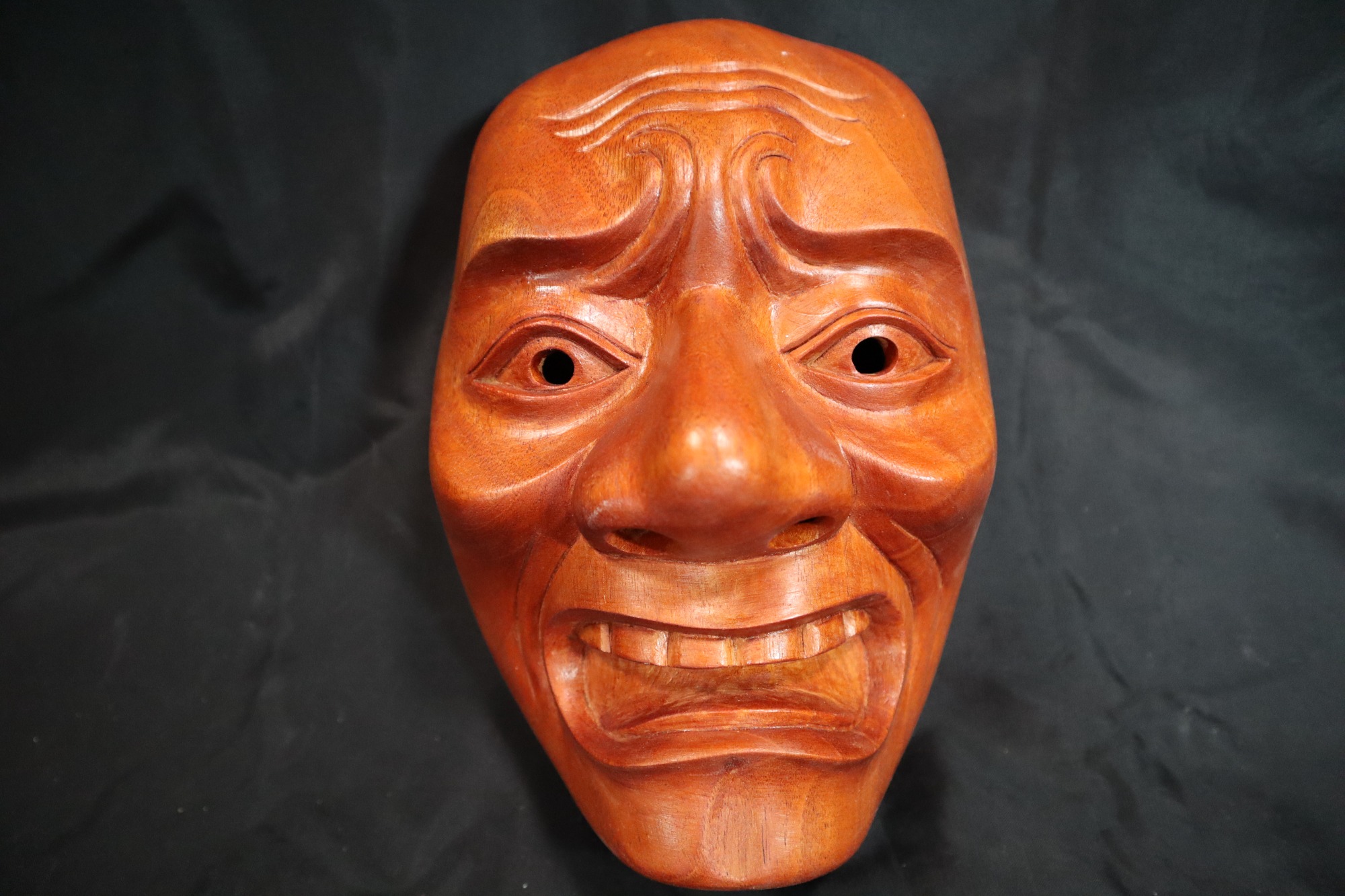 Take. Full face mask carved mahogany wood. Part of Japanese Not Mask Mahon Series. Inspired by the Now mask tradition.