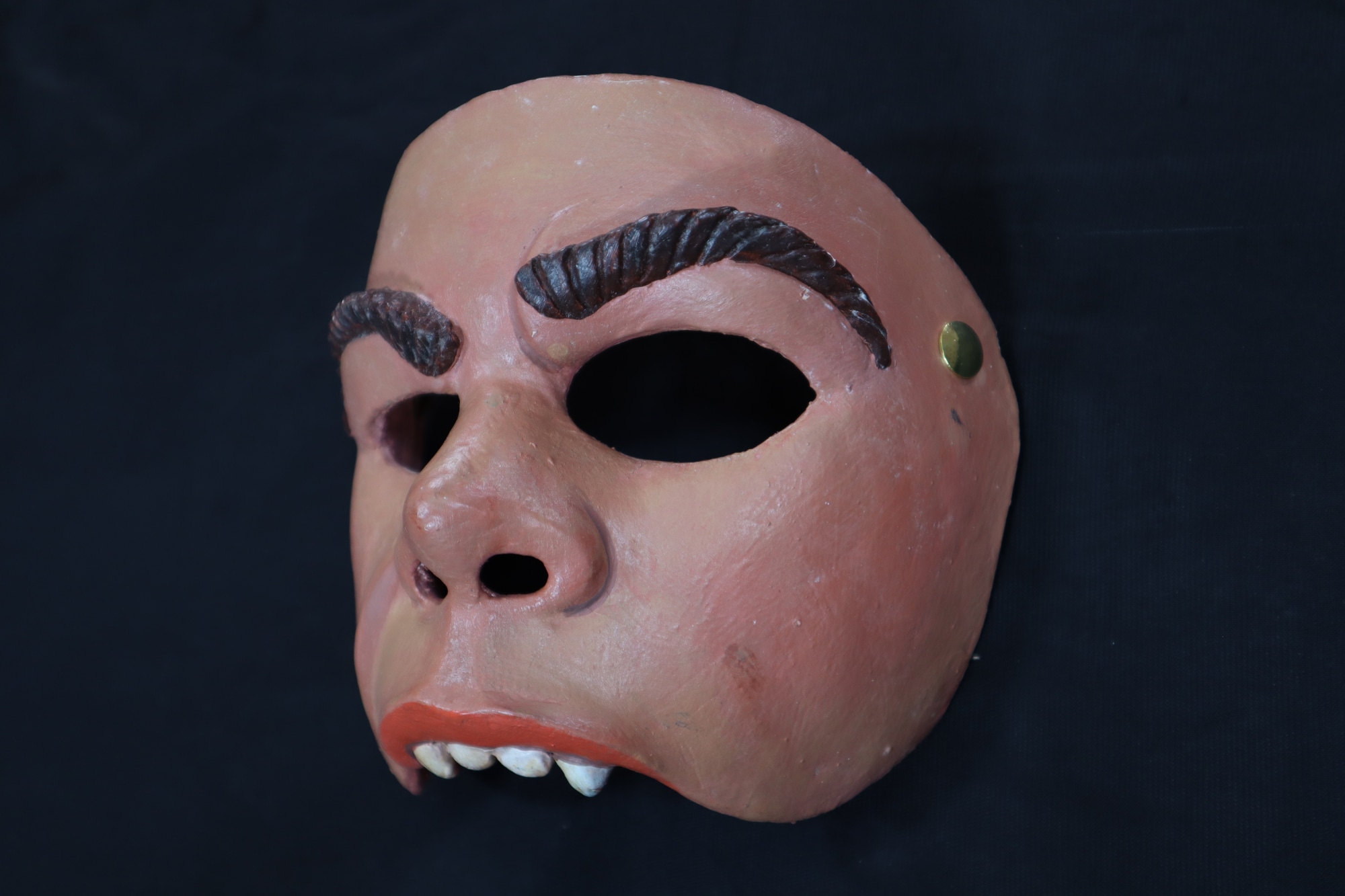 Half mask of artists' son, Tizoc for antismoking campaign. Half mask of male figure. Painted brown eyebrows, one raised. Painted upper lip pink, with 4 white teeth.