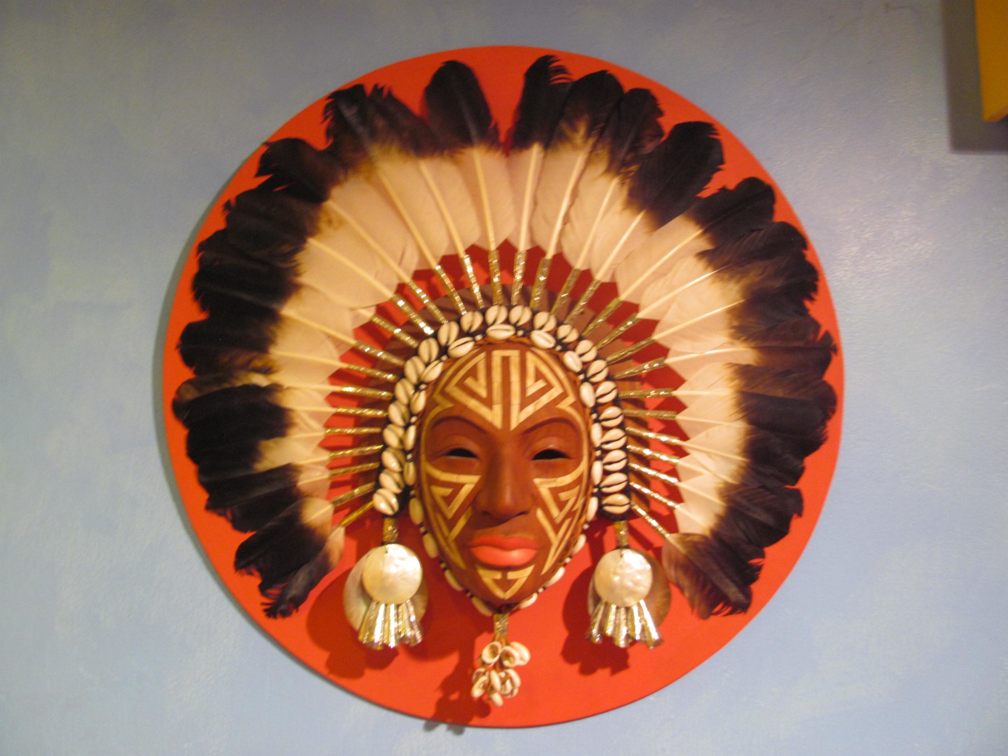 Tolteca. Full face mask with geometric design made of fossilized ivory inlay on entire face and full two-toned feathered headdress, cowrie shells around base of headdress and entire perimeter of mask, cowrie shells hanging from chin, larger shells hanging in an earring-like detail - mounted on wooden orange circle display.
