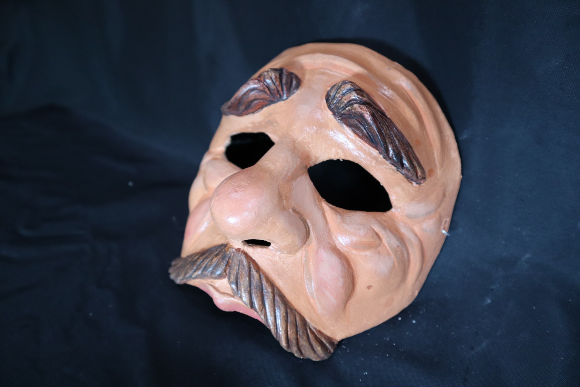 Tony. Half mask of male figure, plaster bandage and paper clay, painted with acrylic paints. Very wrinkled and bumpy look. Frowning or worried expression, with lines on forehead and eyebrows curved down. Raised eyebrows and mustache painted dark brown. Bags under eyes and on cheek areas, tinted pink. Mustache covers sides of upper lip, with middle of lip exposed and painted pink.