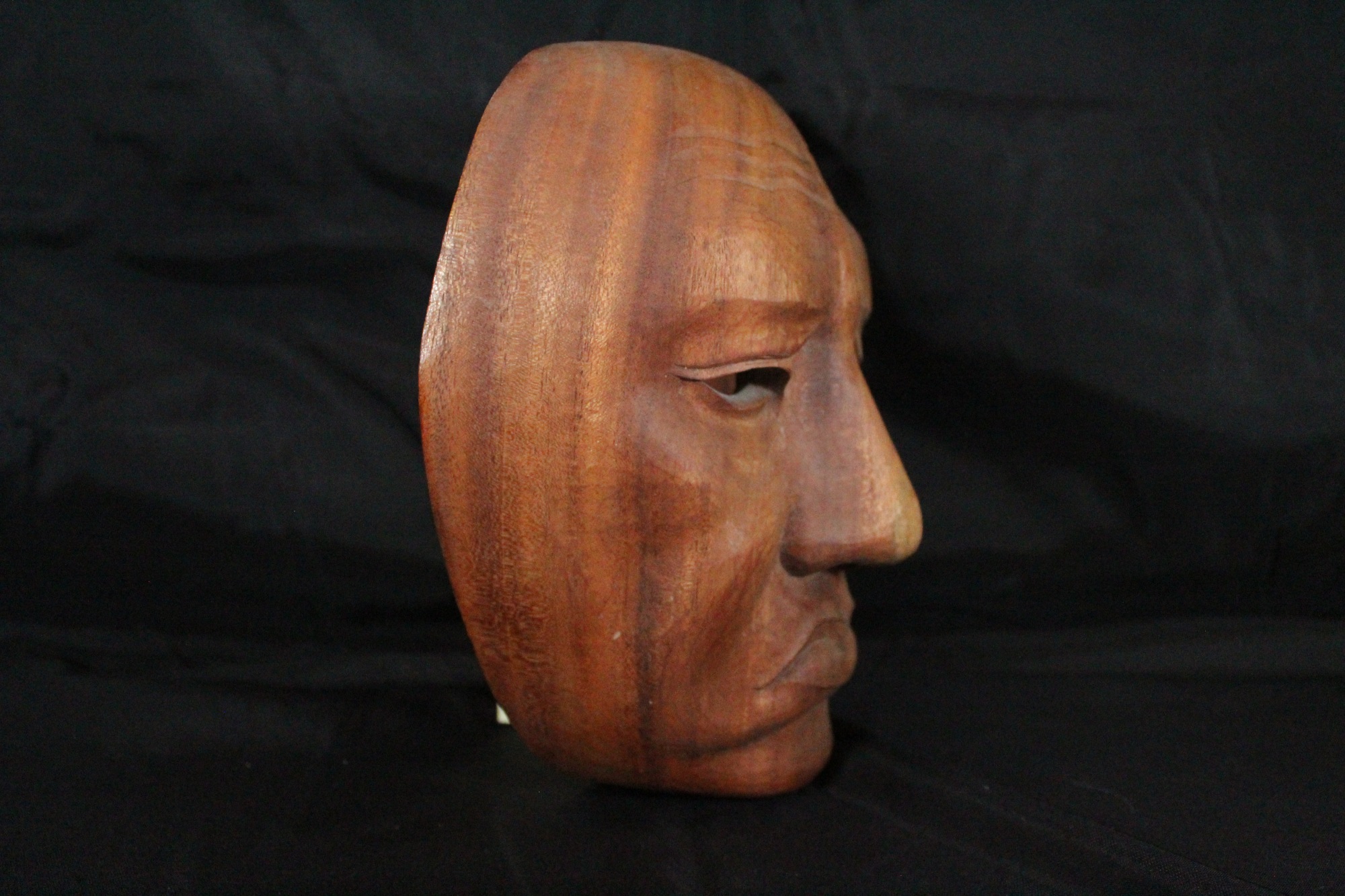 Sad expression carved with matte finish. Three slightly wavy lines across the forehead. Small, almond shaped eyes carved and punched out. Short eyebrows with fold on the eyelid. Downturned mouth with thin top lip and a thicker bottom lip. Front of nose covered with a light wood grain area.