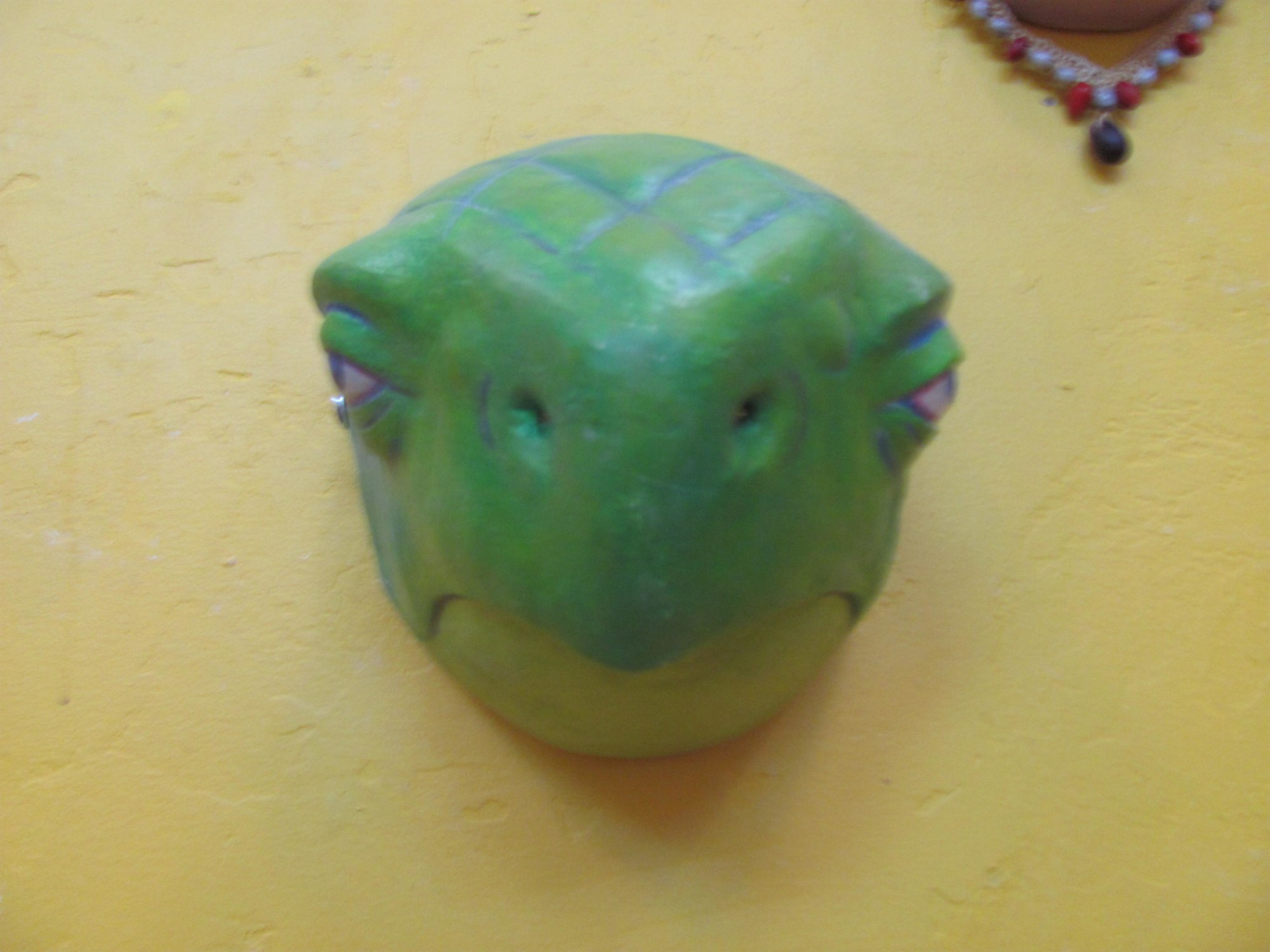 This sculpture is a full-face turtle mask. It is made of wood and has a painted face in dark green with a light green chin, blue eyes, a slit nose, and a closed mouth.