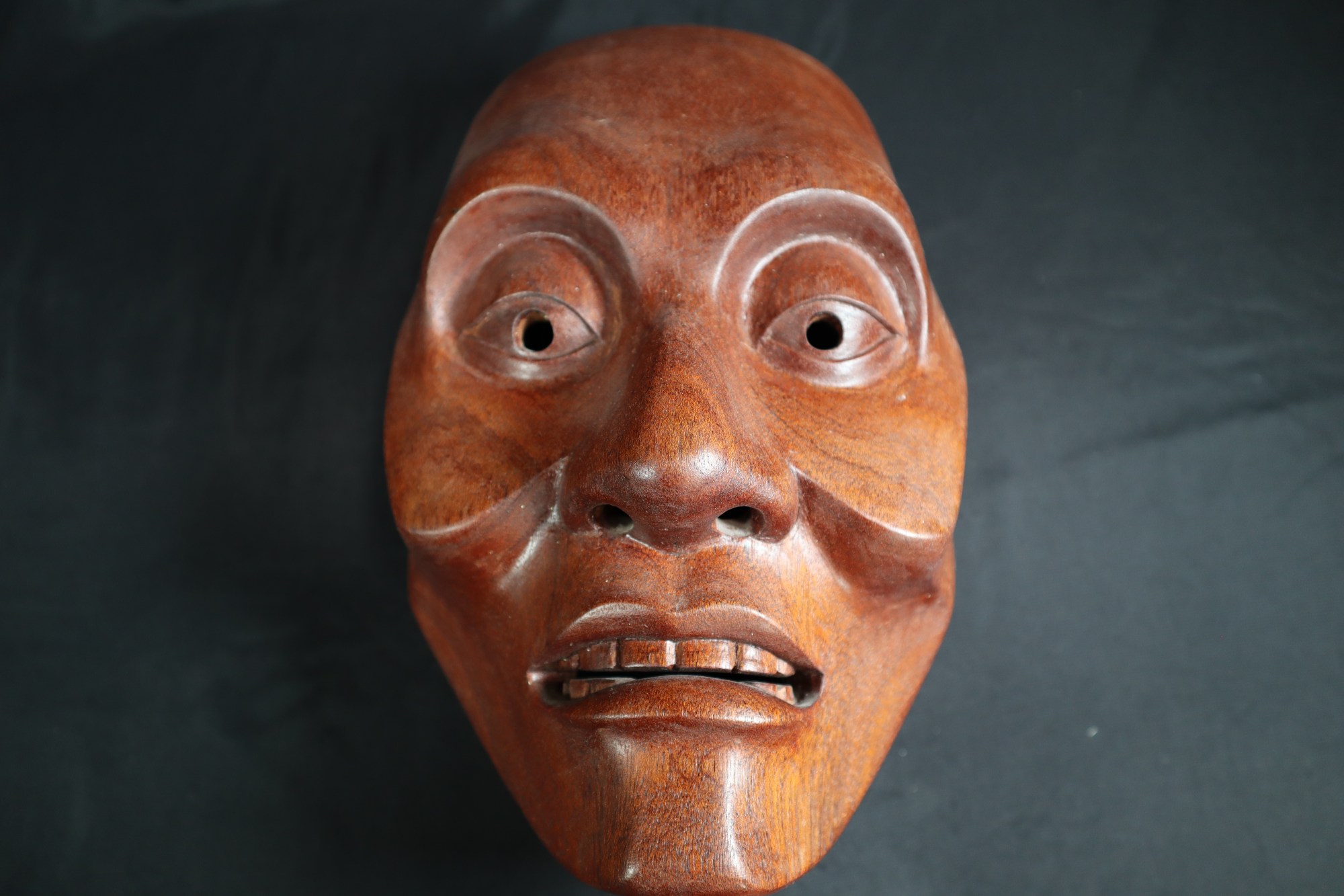 Untitled. Carved wood full face mask, human figure. Represents how Noh masks can become abstract in exaggeration of features. Eye brow, cheek bones, and chin are carved to be sticking out and sharp in lines. Eyes have circle cut outs for pupils. Mouth is slightly open, with upper teeth shown, but lower teeth partially covered by lower lip. Part of Noh Mask Series carved between the years 1986-1990 during artists residency in Japan.