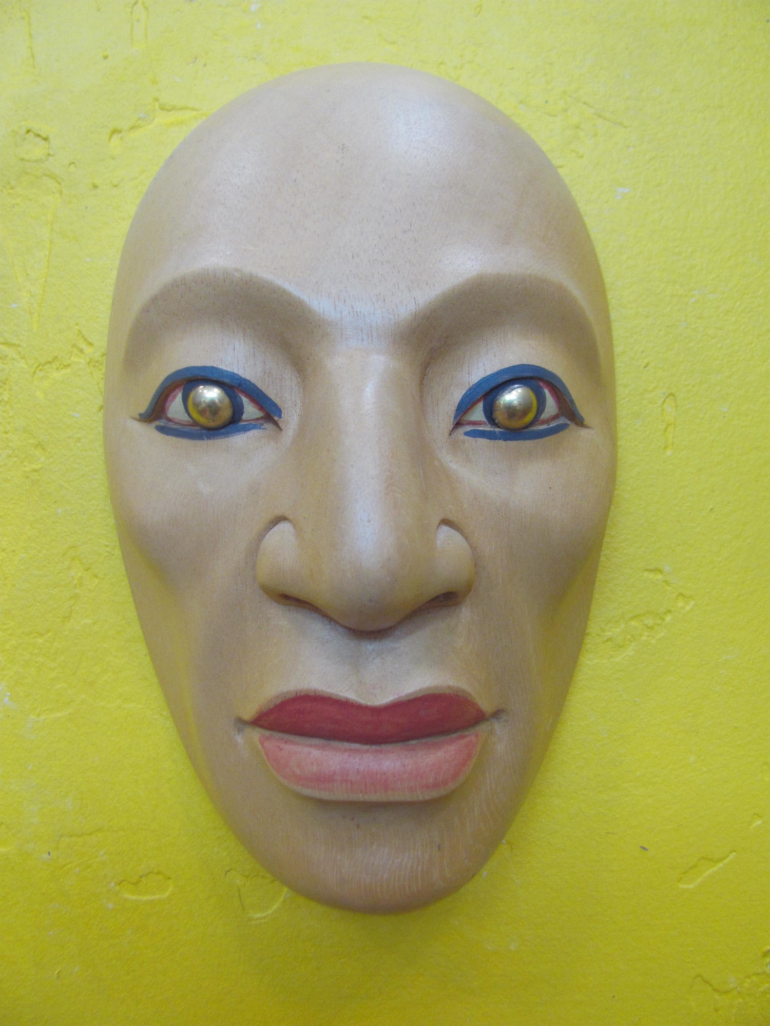 This is a carved wood mask with inlaid copper eyes and lips painted pink.