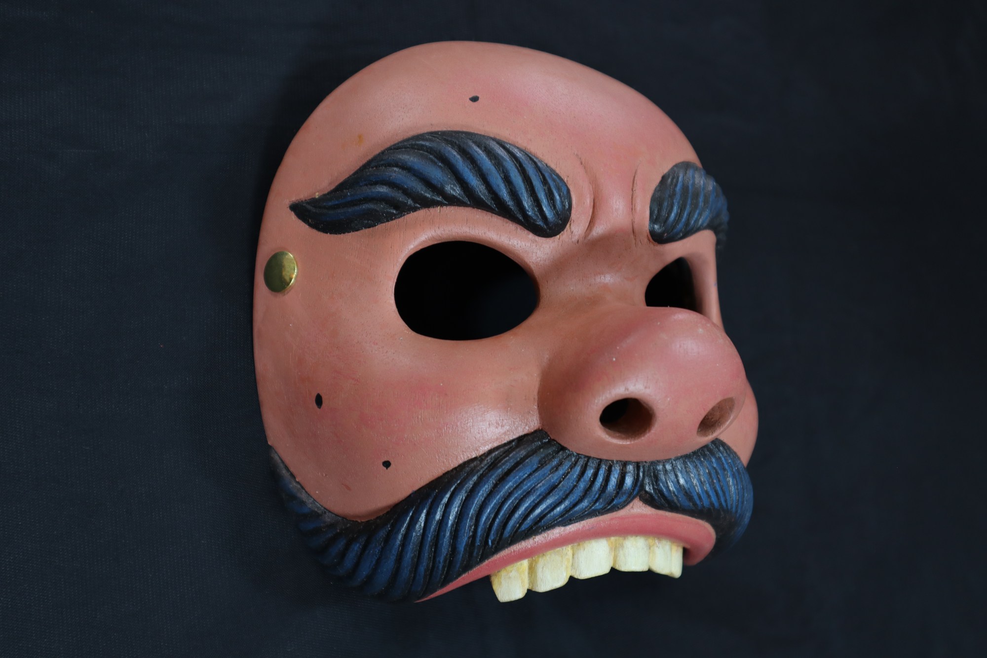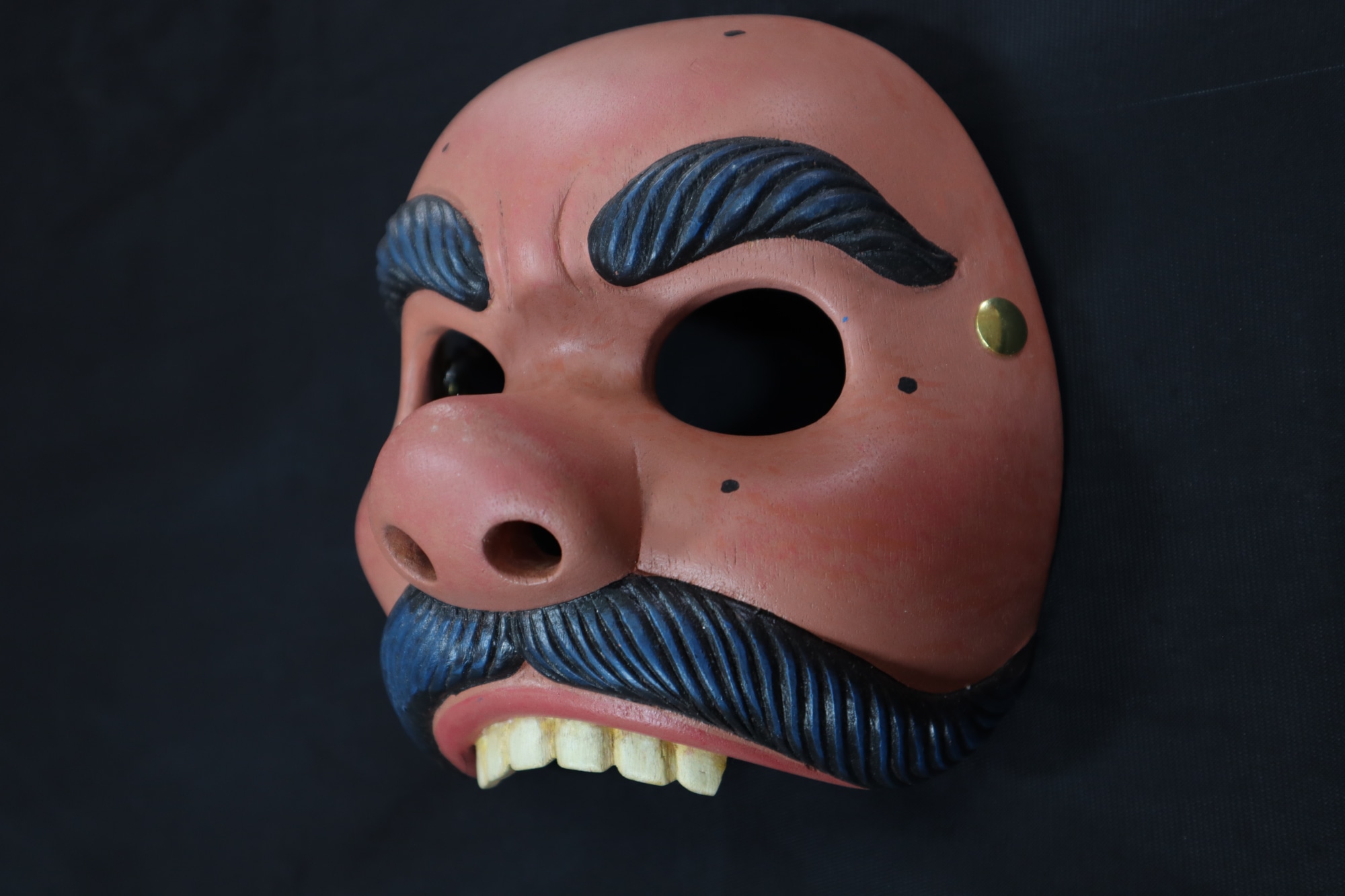 Carved wooden half mask, created as a model and study. Not used. Male face, with painted dark black, thick eyebrows, and handlebar mustache. Pig type nose, and full set of white upper teeth.