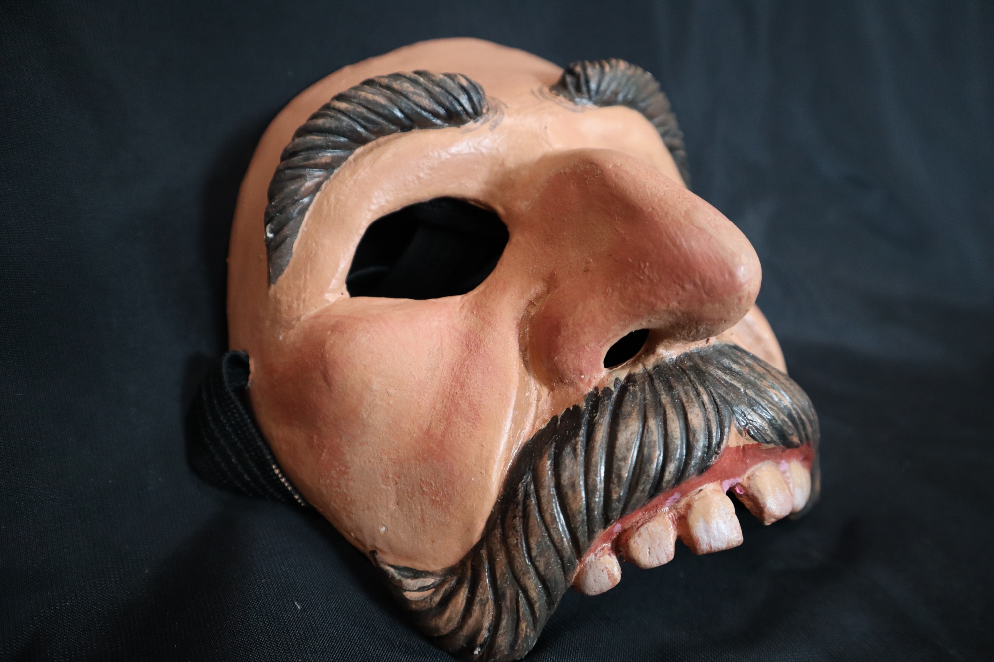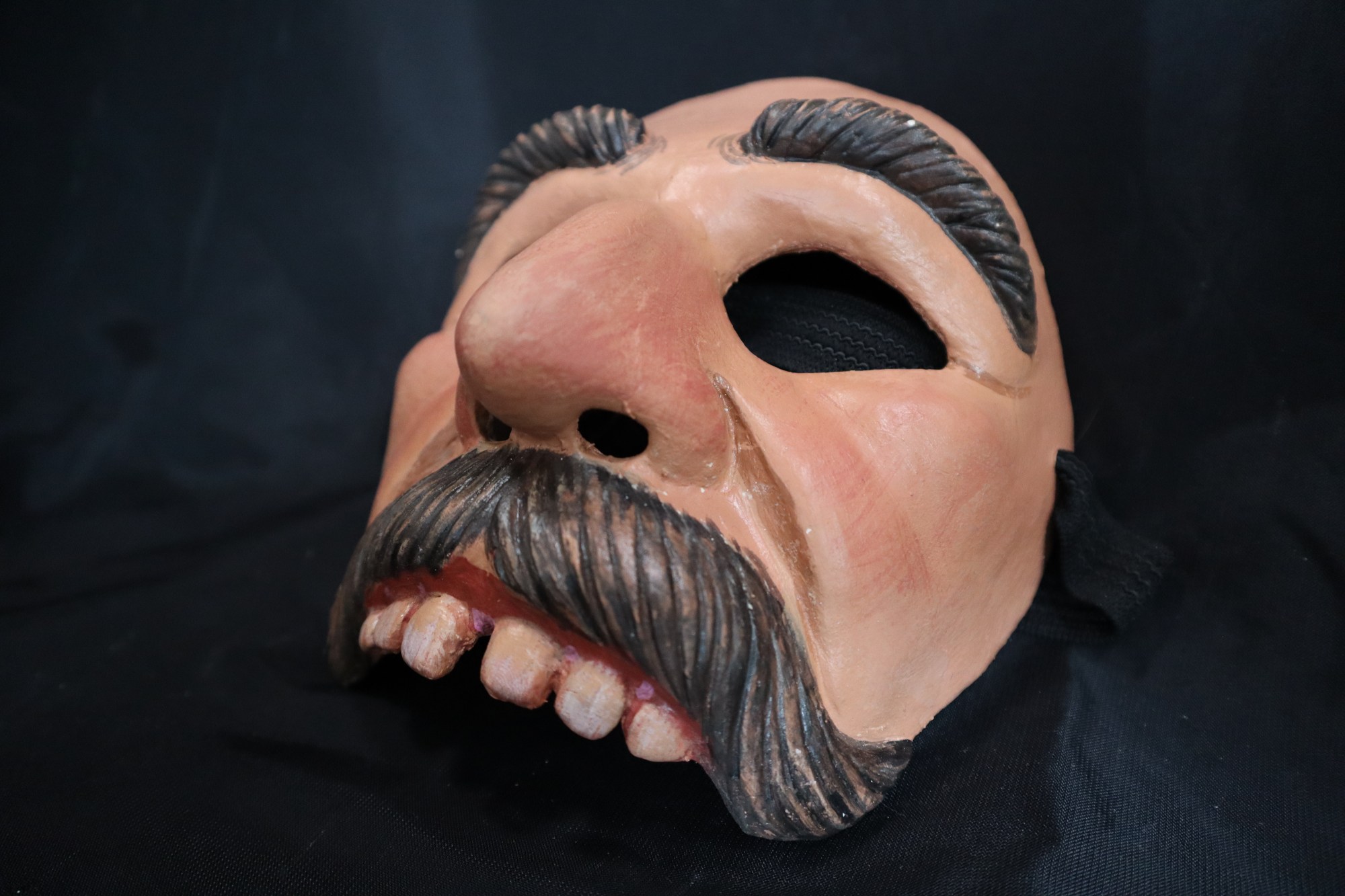 Vato Poeta. Plaster bandage, paper clay, reinforced with fiberglass decorated with acrylic paints. Half mask molded onto the artists' (Zarco) face. Used for many performances. Big molded eyebrows and mustache, painted brown with carved lines. Mustache hangs down past the mouth on the side. Large nose with lines one either side along the cheeks. Six white square teeth protruding from top lip with gap btween two front teeth.
