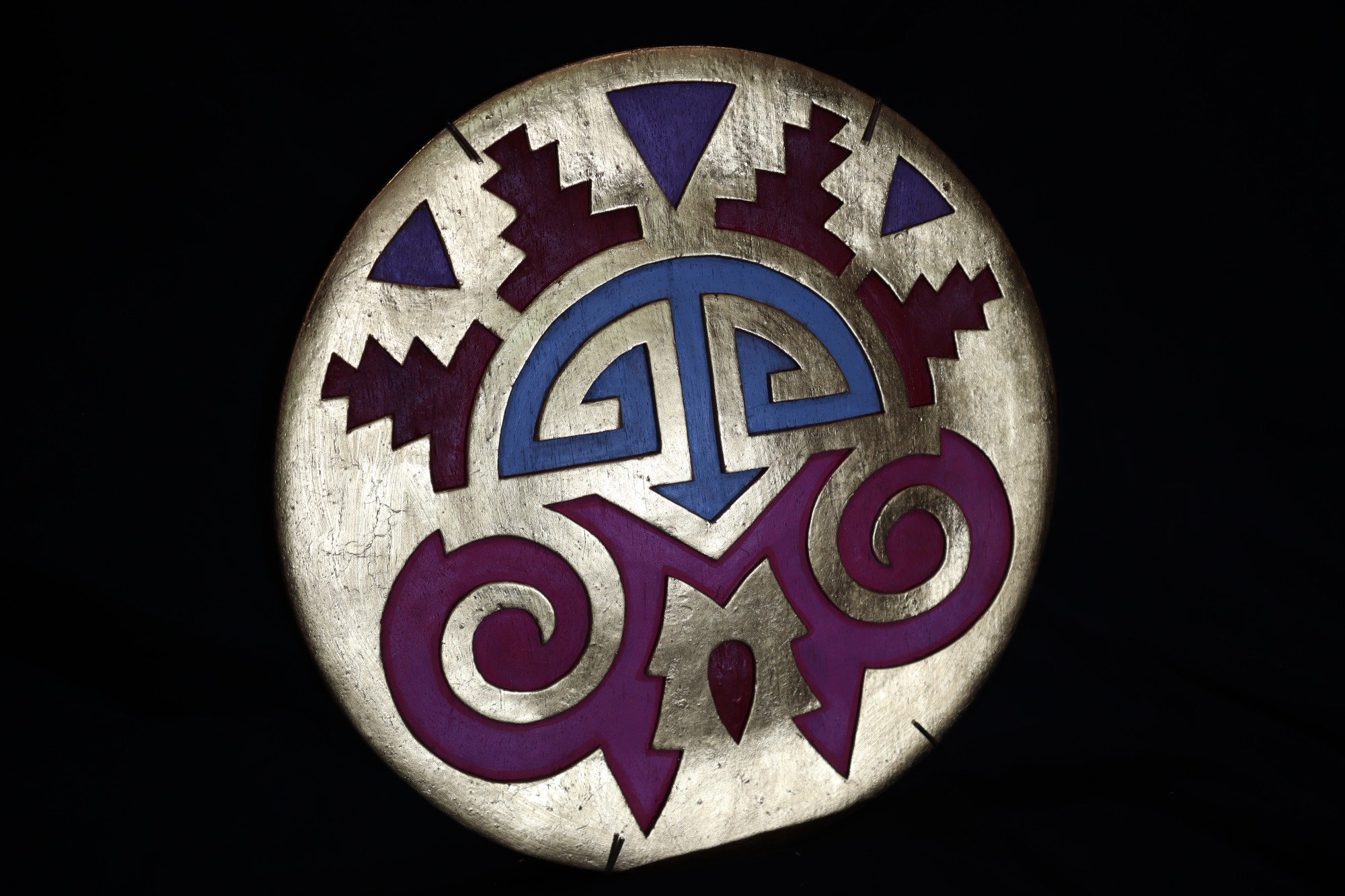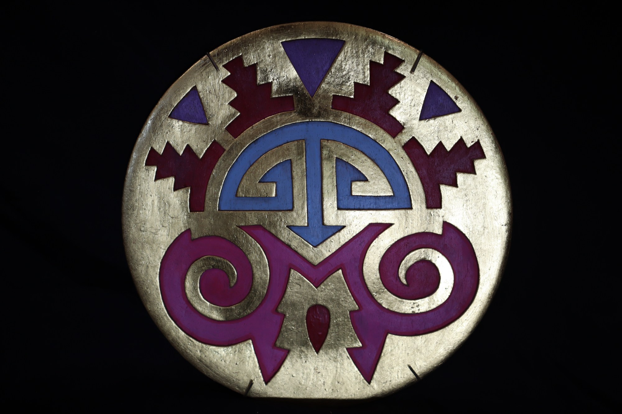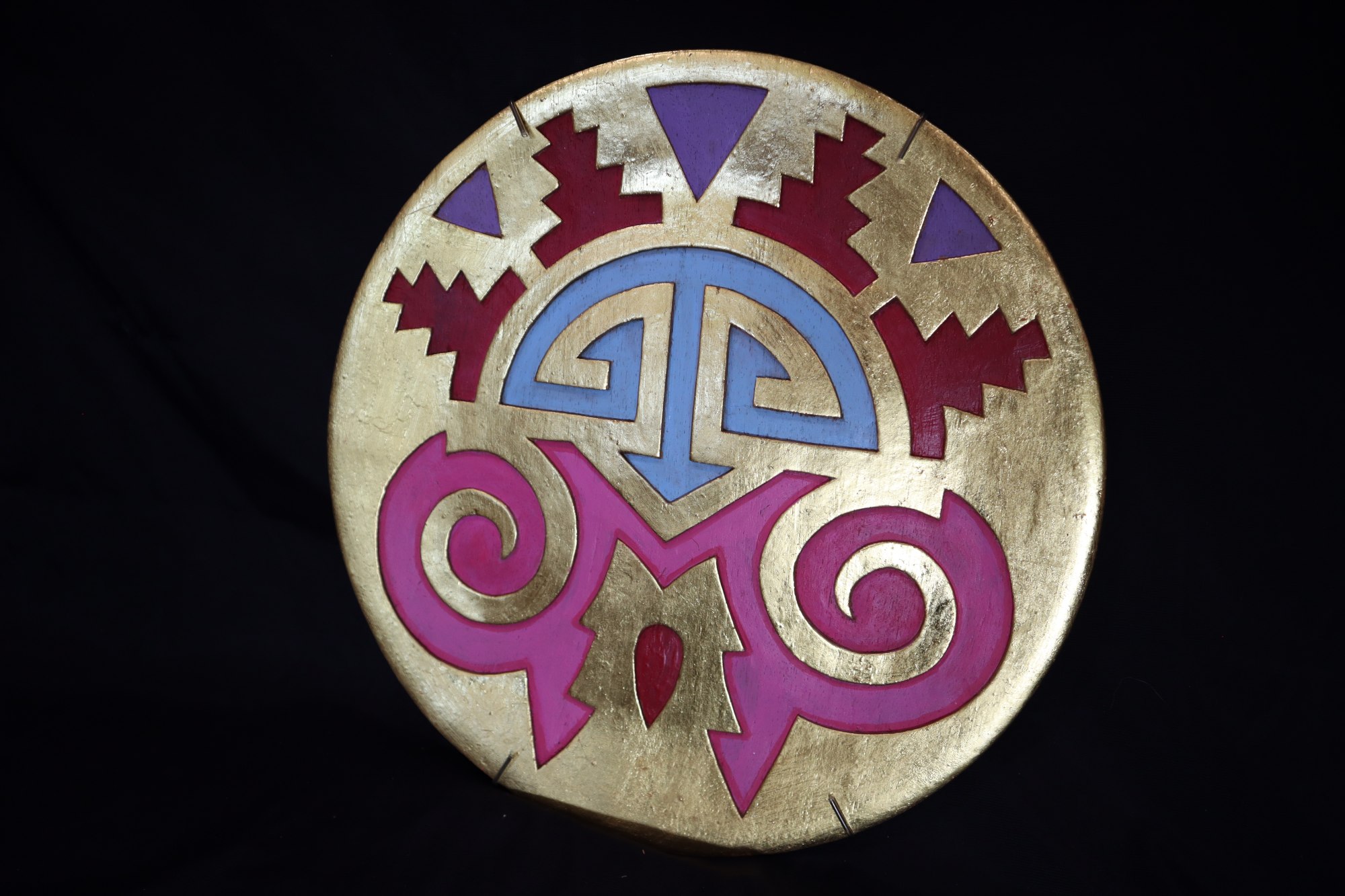 Circle mandala. Entire background painted gold. Designs carved and painted in pink, dark red, blue, and purple. Three purple triangles near the top outer border. Four, dark red, southwest tribal shapes in between the triangles. Blue and pink tribal lines towards the center of mandala. Dark red raindrop shape in between the pink designs.