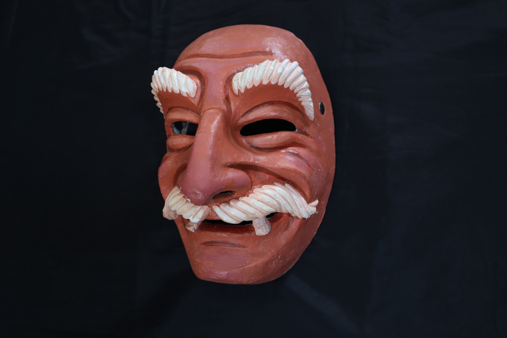 Dance mask made for ballet folklorico los viejitos performances. Old man mask, with bushy white eyebrows and mustache, and two white teeth.