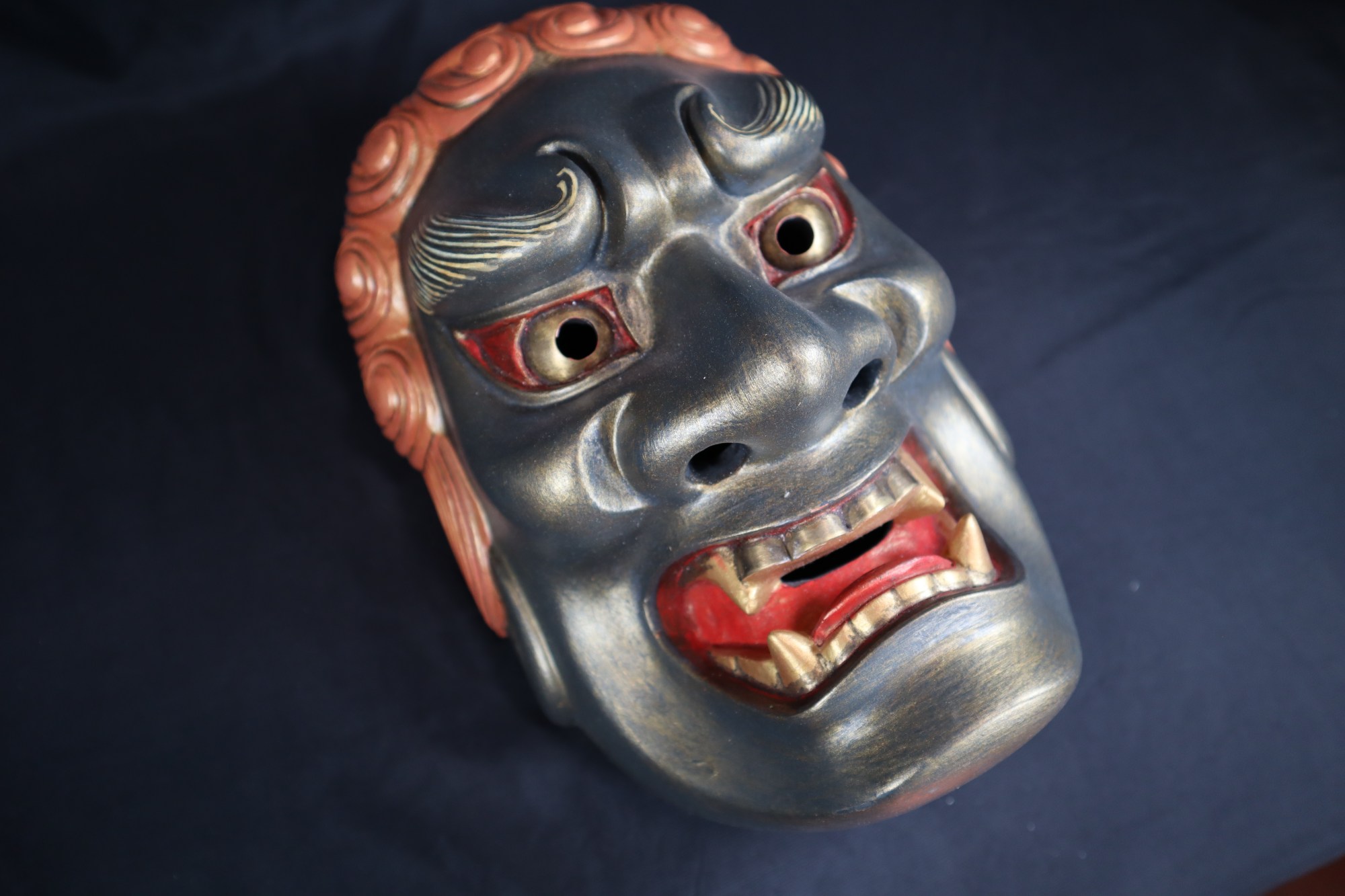 Fudō. Carved wood full face mask of demon. Painted with acrylic paints. Painted a metallic black. Hair carved in scrolls painted reddish brown. Scroll carved eyebrows with gold accents. Gilted copper eyes with red painted accents. Inside of mouth and tongue painted red with gold painted teeth. Temple Guardian, samurai, warrior character. Part of Noh Mask Series .