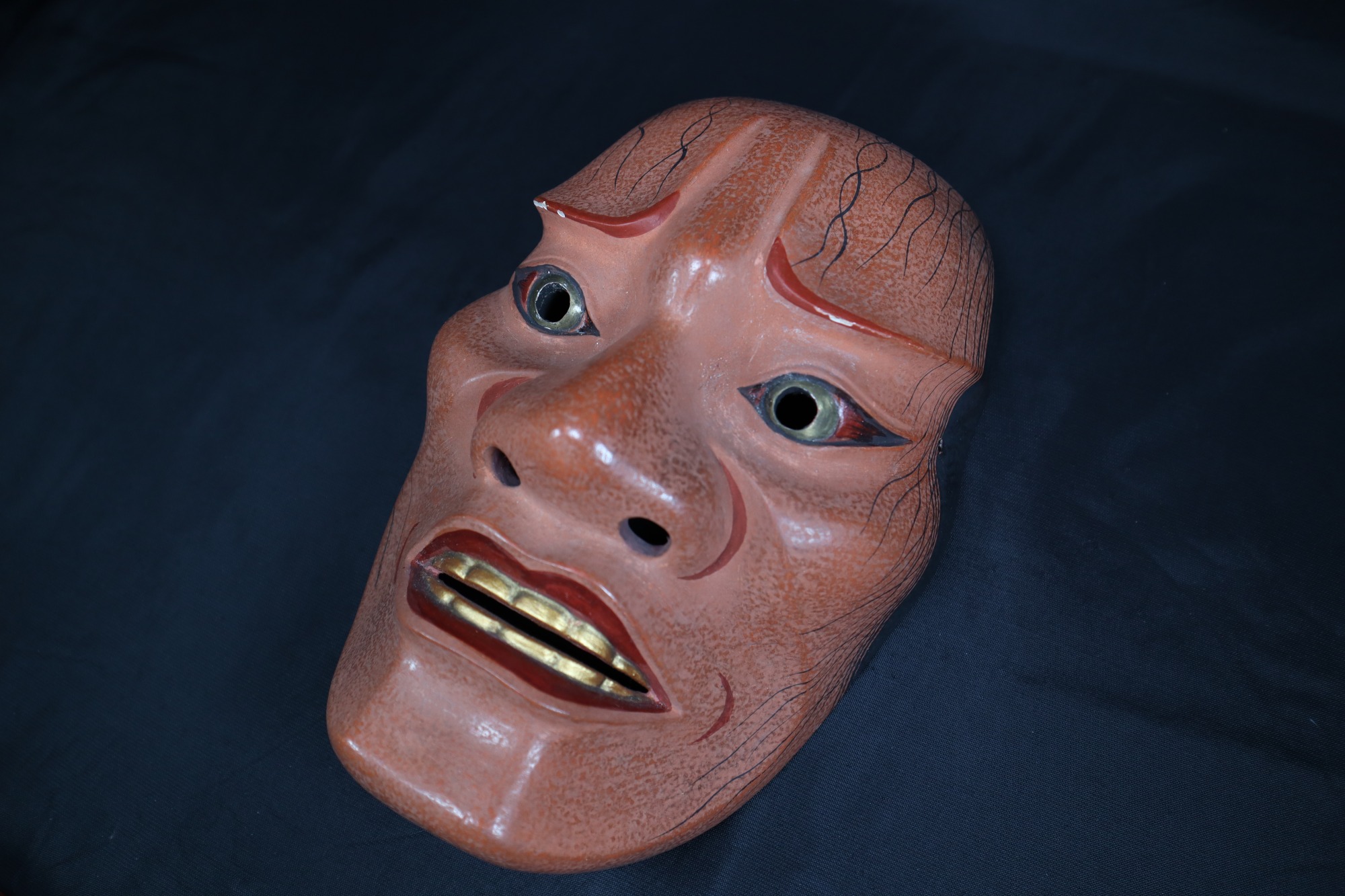 Mara. Carved wood full face mask with gilted copper eyes, and painted details. Black hair painted around edges of mask, with strands painted on forehead. Red, rust color painted eyebrows, eyes, nose creases, and lips. Teeth painted gold. Part of Noh Mask Series carved between the year os 1986-1990 during artists residency in Japan.