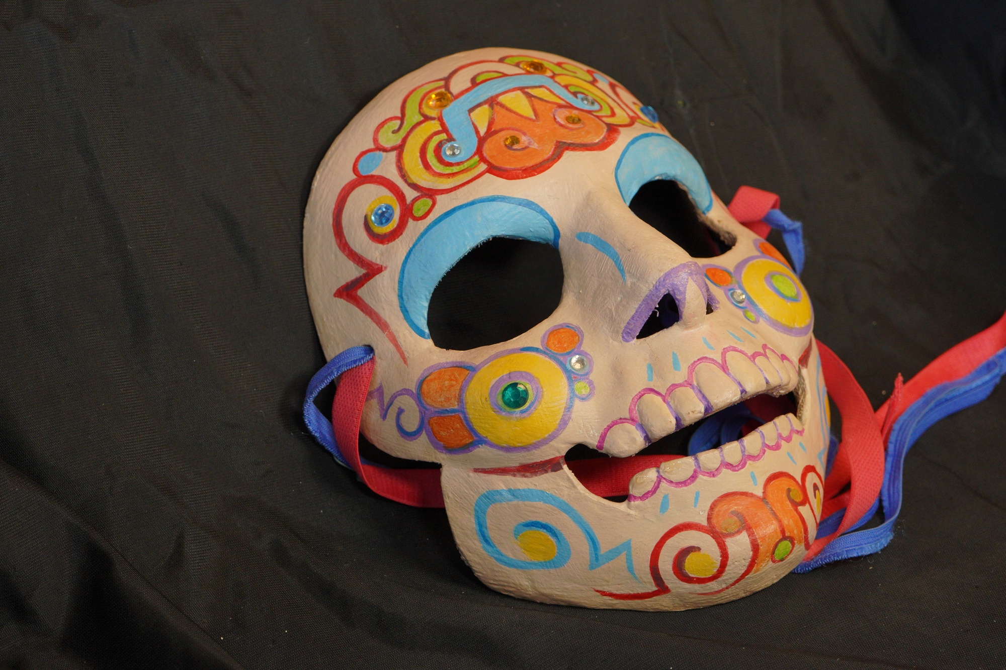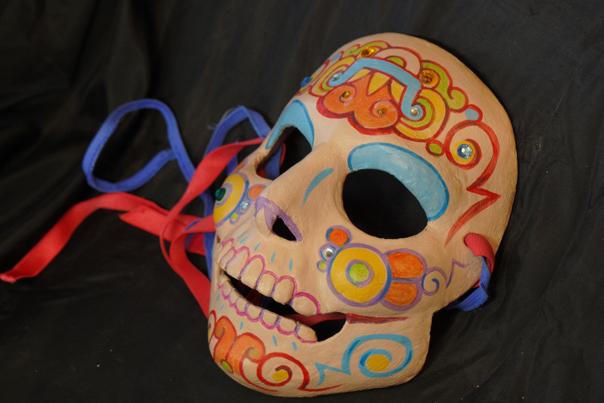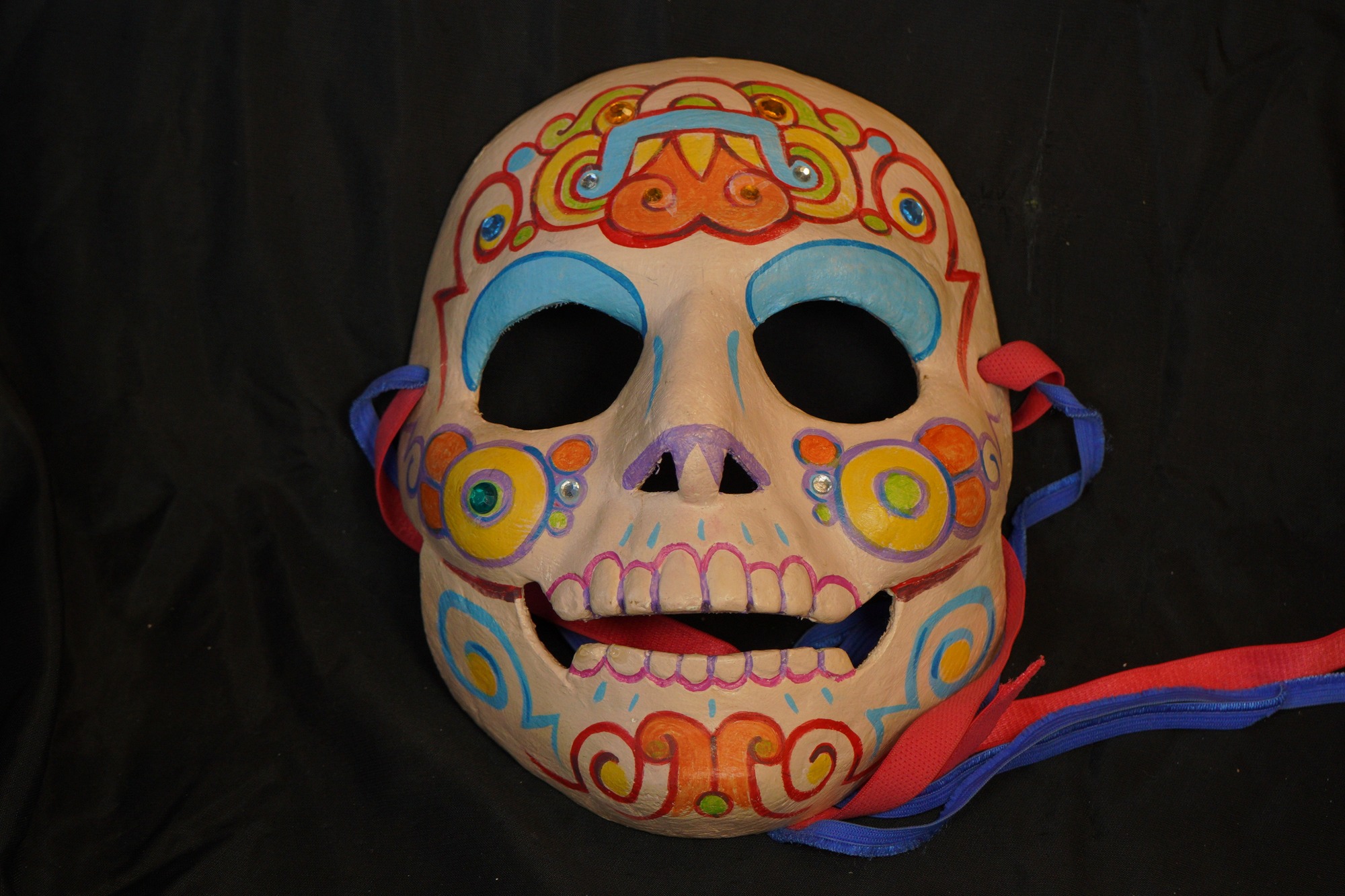 Calaca mask with off-white painted base. Painted with orange, green, yellow, red, and light blue color scheme. Cluster design on the forehead in all five colors. Red swirl on each side of temples, extending towards the cheeks. Top border of eyes painted in light blue with dark blue outline. Circle clusters on each cheek painted in yellow, orange, and green, outlined in purple. Nose painted purple. Outer border of teeth outlined in pink, inner border outlined in purple. Light blue, swirly lines below each side of the mouth. Red and orange swirl shaped designs on chin.