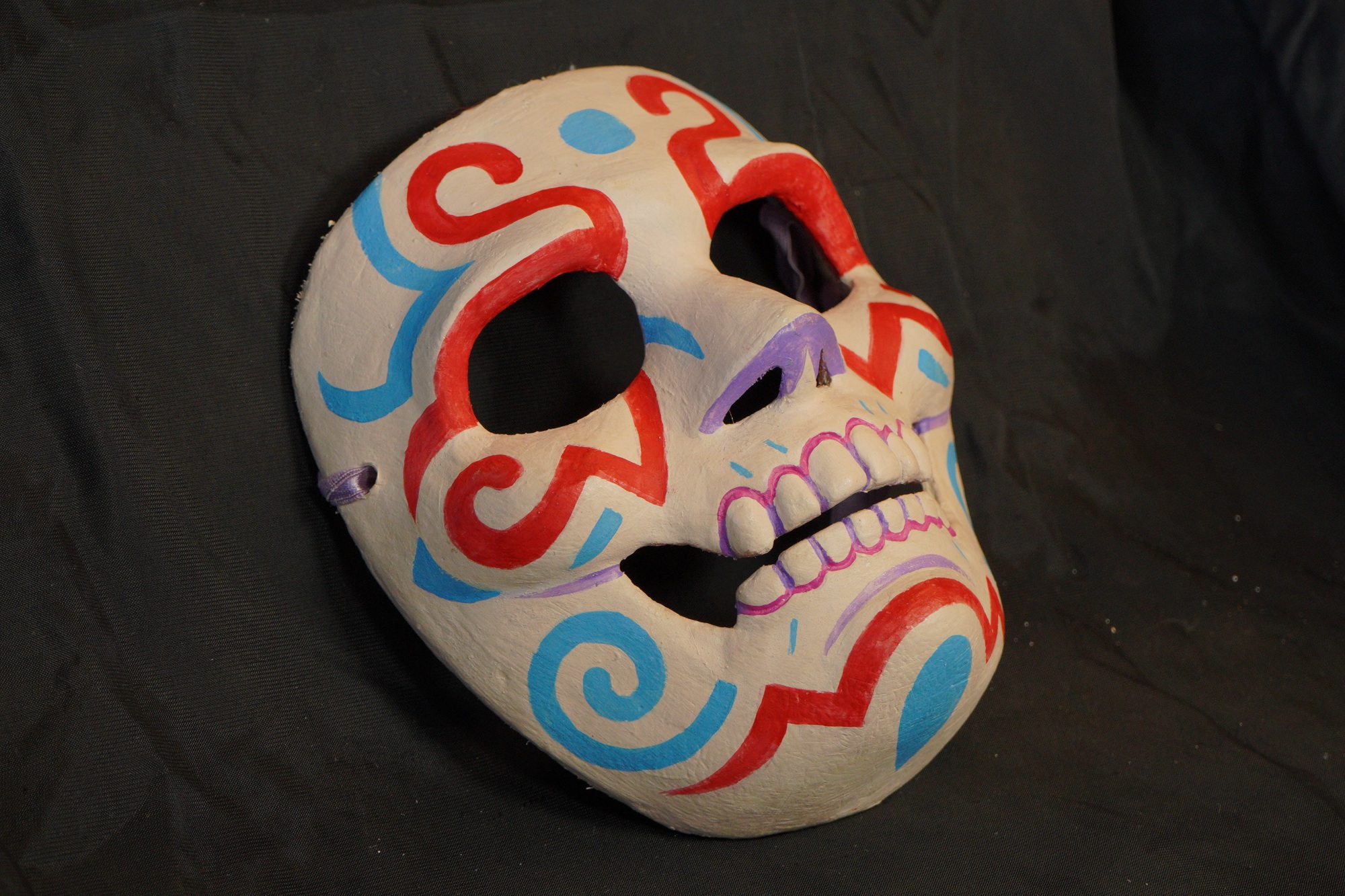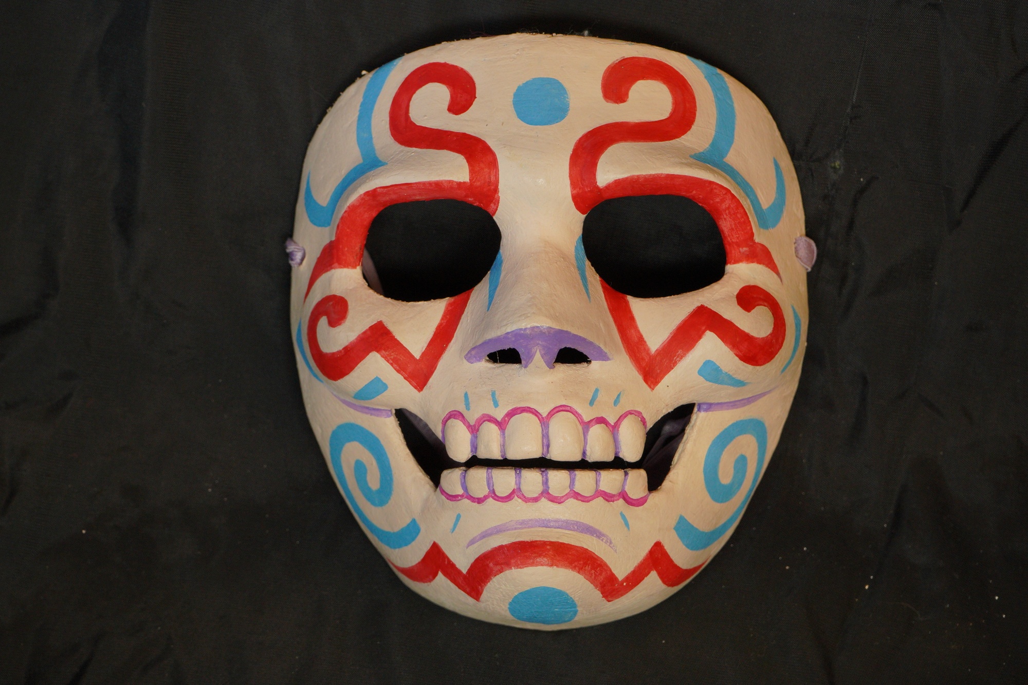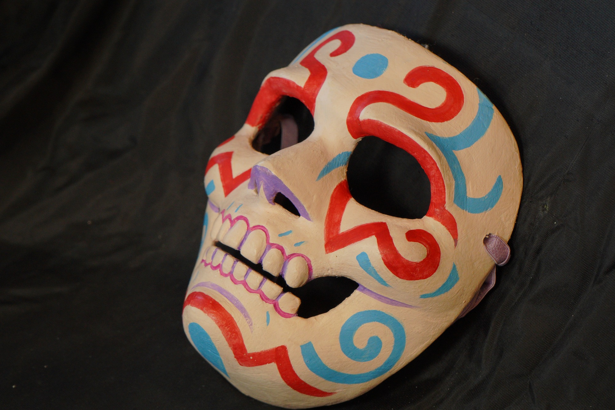 Calaca mask with off-white painted base. Red and light blue color scheme, with small purple and pink details. Top border of eyes painted in red with swirly lines extending to the forehead. Red zig-zag, swirly lines painted on the cheeks and on the chin. Light blue, swirly lines painted on the sides of the forehead and on the side of the mouth. One blue dot on the center of the forehead and the chin. Outer border of teeth painted in pink, inner border painted in purple. Nose tip painted purple. Small, light blue strokes above and below the mouth.