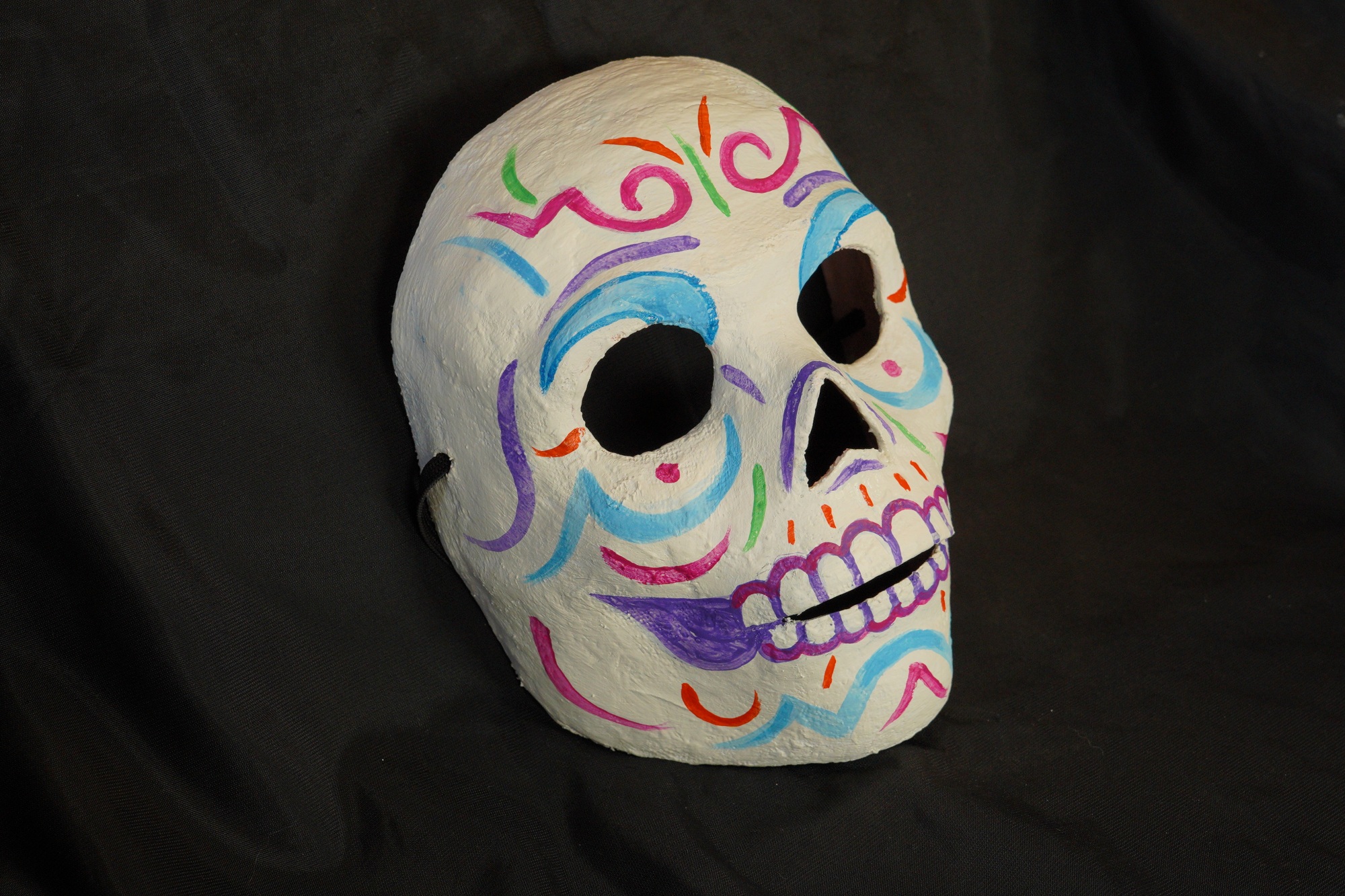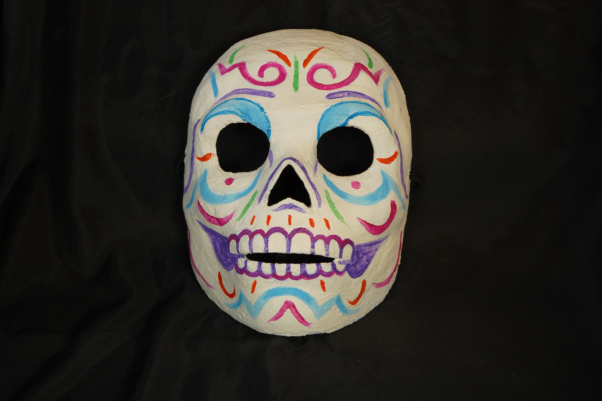 Calaca mask with off-white painted base. Short, thin lines painted all over in blue, pink, orange, and purple. Purple eyebrows. Thicker blue lines painted above the eyes. Nose outlined in purple in addition to the teeth. Outer border of teeth repainted over in pink. Short, thin, orange brush strokes above and below the teeth.