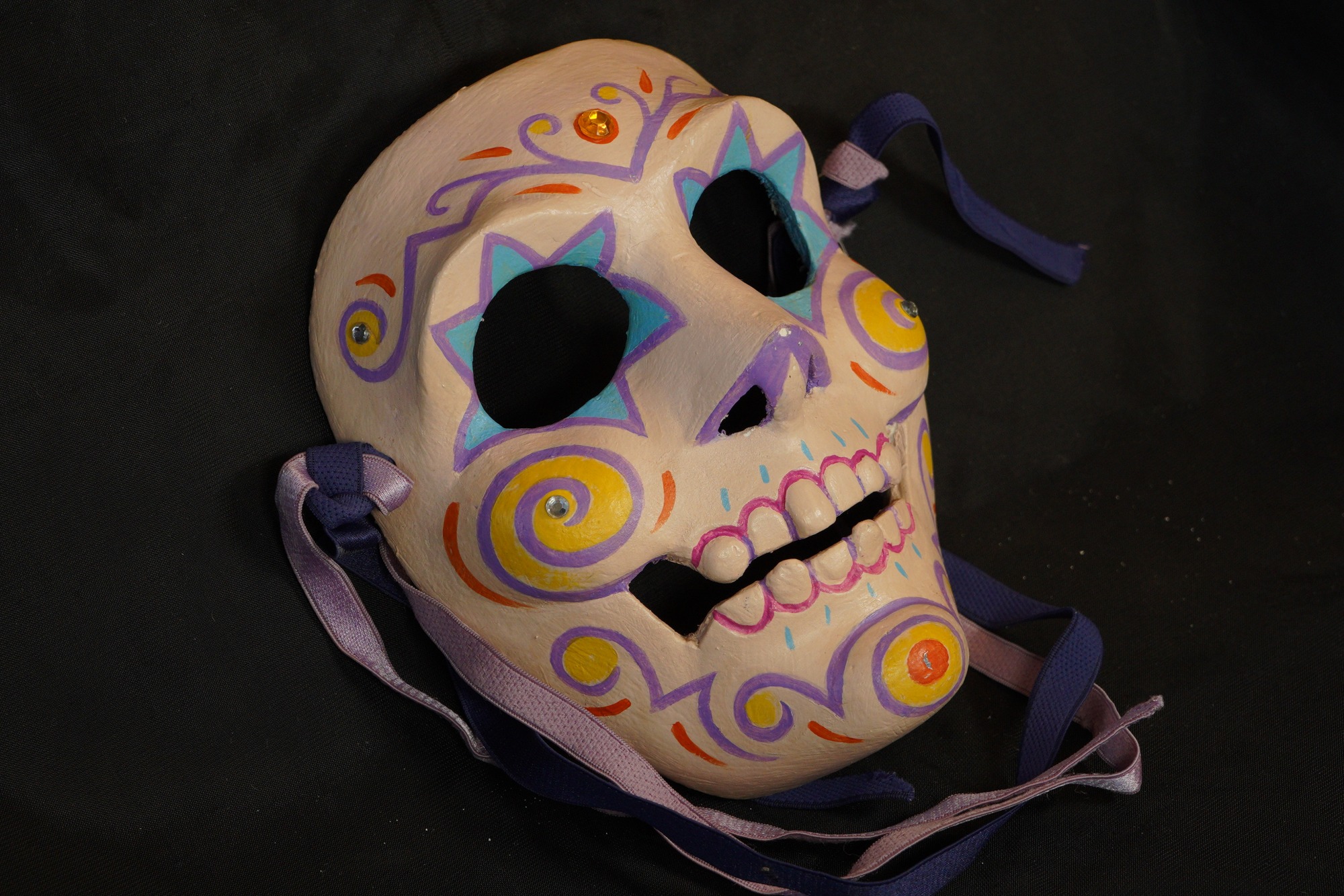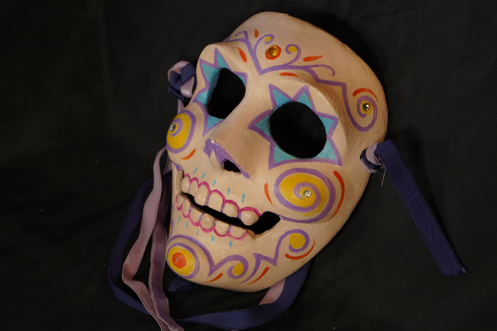 Mask base painted in off-white. Purple, yellow, blue, and orange color scheme. Blue star shaped border around the eyes, outlined in purple. Purple swirly lines on the forehead, cheek, and chin, Inner swirls on forehead, cheeks, and chin painted yellow. Short, orange brush stroke marks on forehead, cheeks, and chin. Outer border of teeth outlined in pink, inner border outlined in purple. Silver gems on the the cheeks and sides of forehead. Orange gem on the center of forehead.