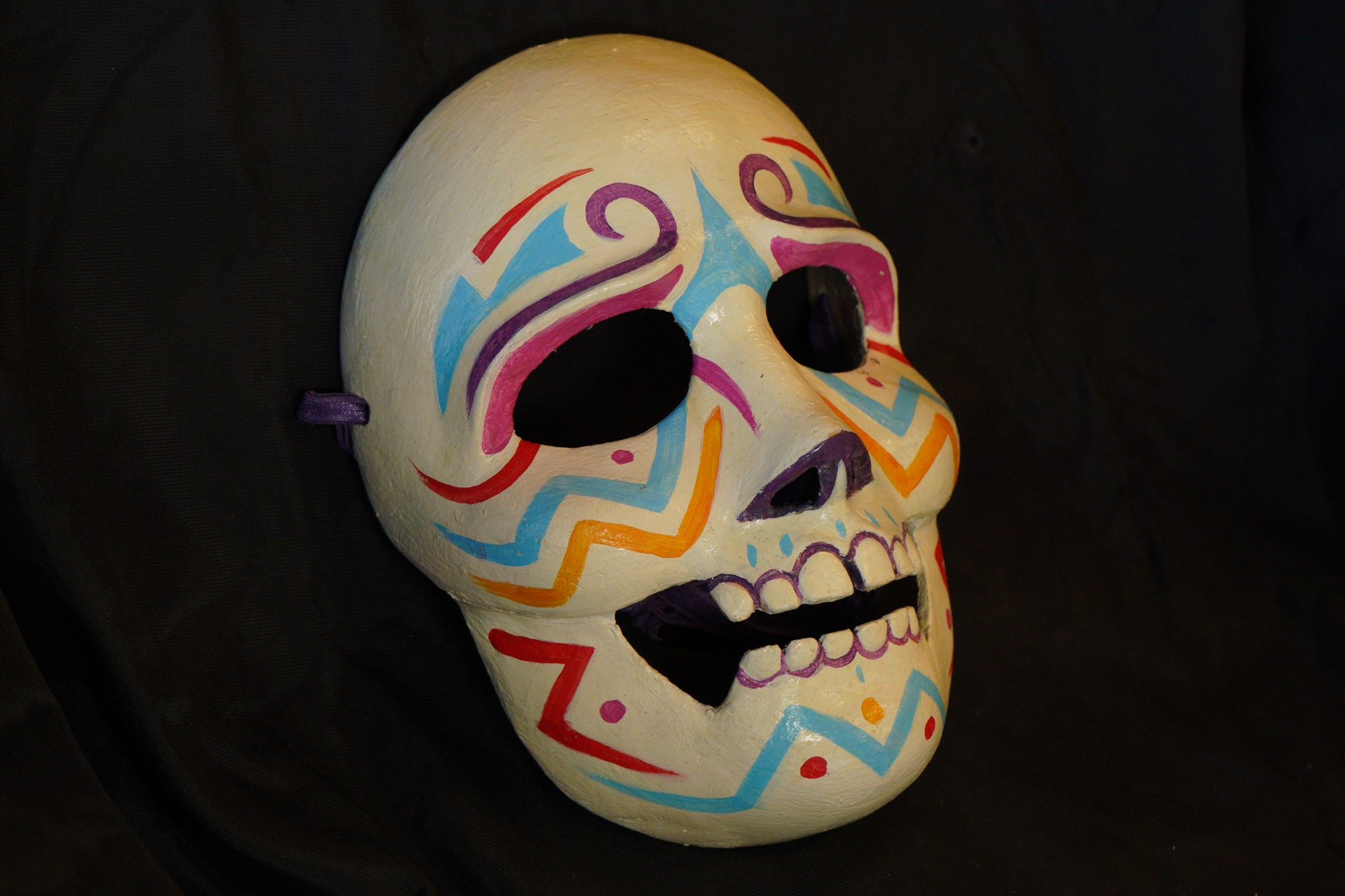Calaca mask with off-white painted base. Designs painted with blue, purple, orange, pink, and red color scheme. Lines painted in a zig-zag on the lower half of the face, below the eyes; blue and orange on the cheeks and chin and red near the mouth. Filigree shaped eyebrows painted in purple. Blue spear-shaped design painted between the eyebrows. Purple details on the nostrils and the outer border of teeth. Pink dots below each eye and on each side of the mouth. Three dots on the chin painted in red and orange.
