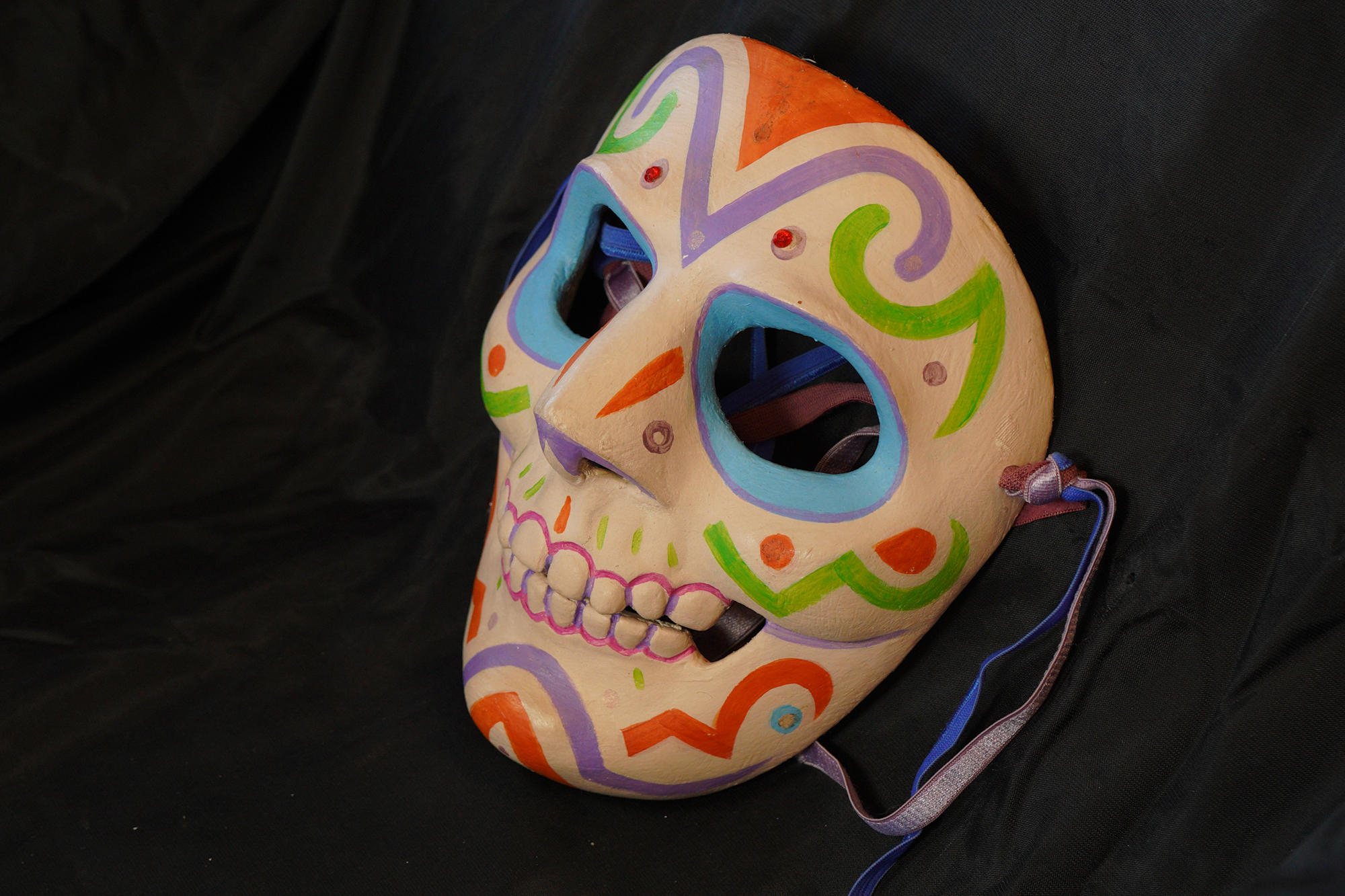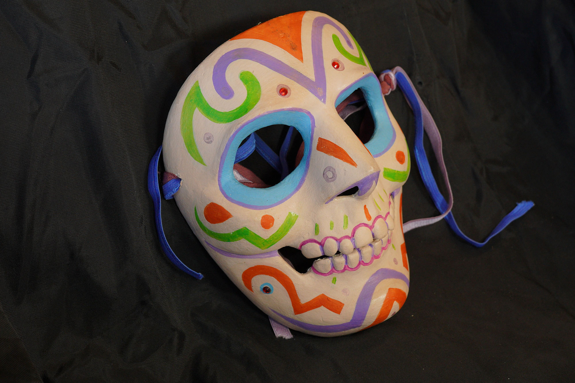 Calaca mask with off-white painted base. Designs painted primarily with purple, orange, and green color scheme. Border of eyes painted in blue and outlined in purple. Upside down triangle painted at the top center of the forehead. Purple, upside-down triangular line that curves in at the ends painted just below the orange triangle. Swirly green line on each side of the forehead. Green zig-zag line painted on the cheeks. Orange lines painted below the mouth, on the chin, and on the nose. Outer border of teeth outlined in pink, inner border outlined in purple. Small, green paint strokes above the mouth; the center one painted orange. Two orange dots on each cheek.