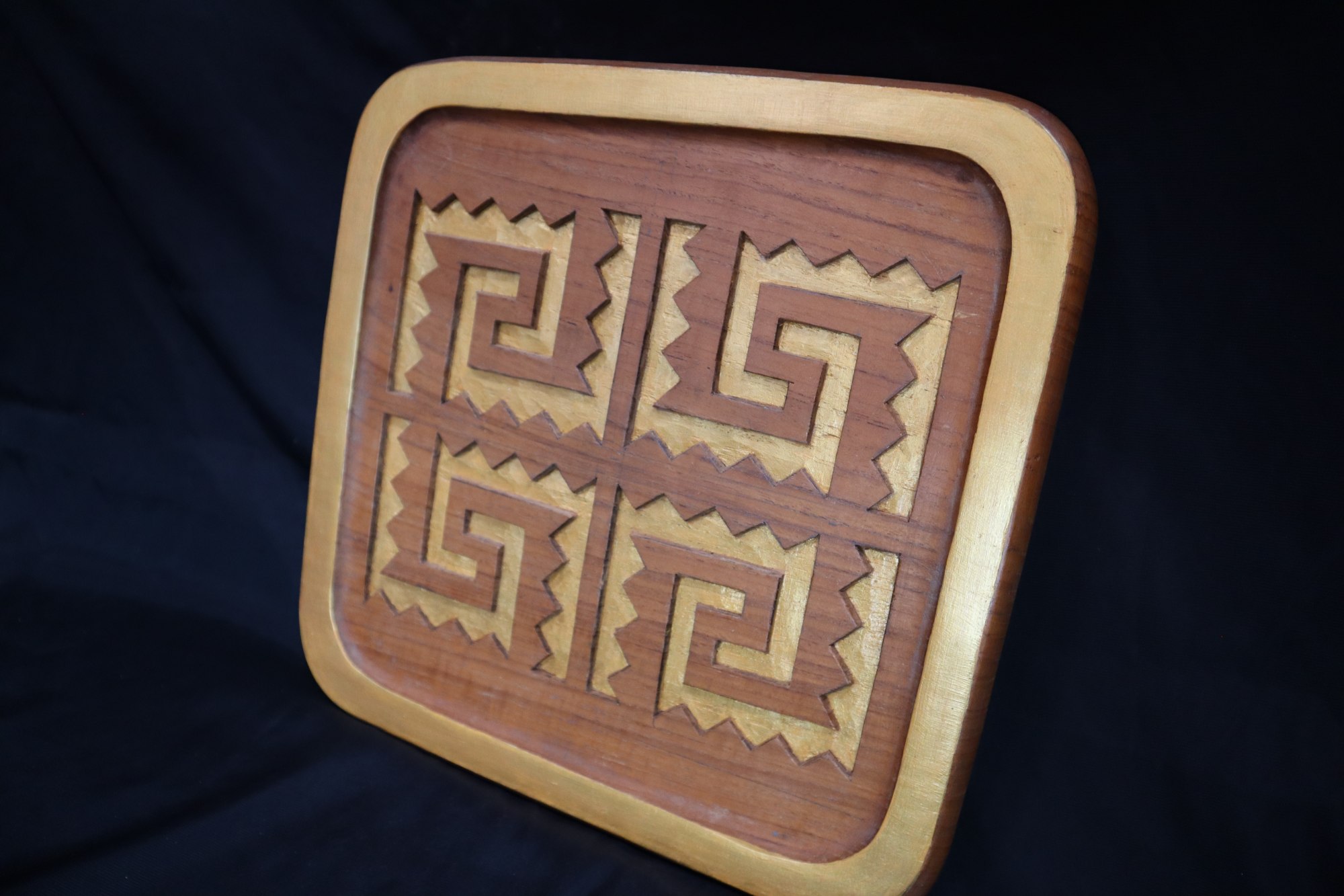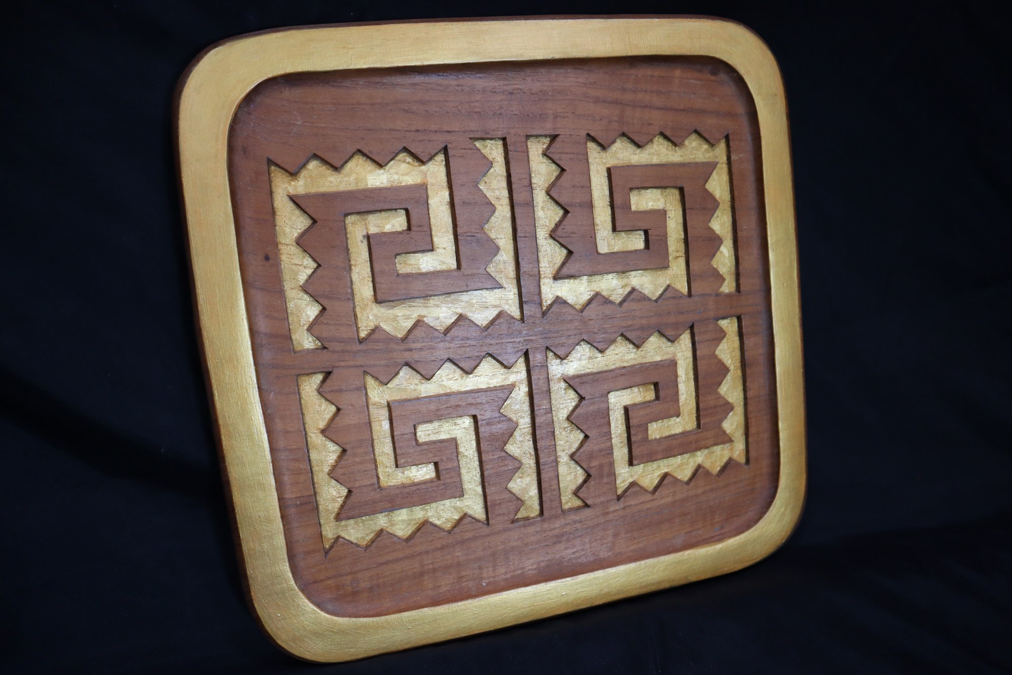 Mandala carved on wood. Four southwest line designs carved on each side of the square and cut out. Designs and border painted gold.