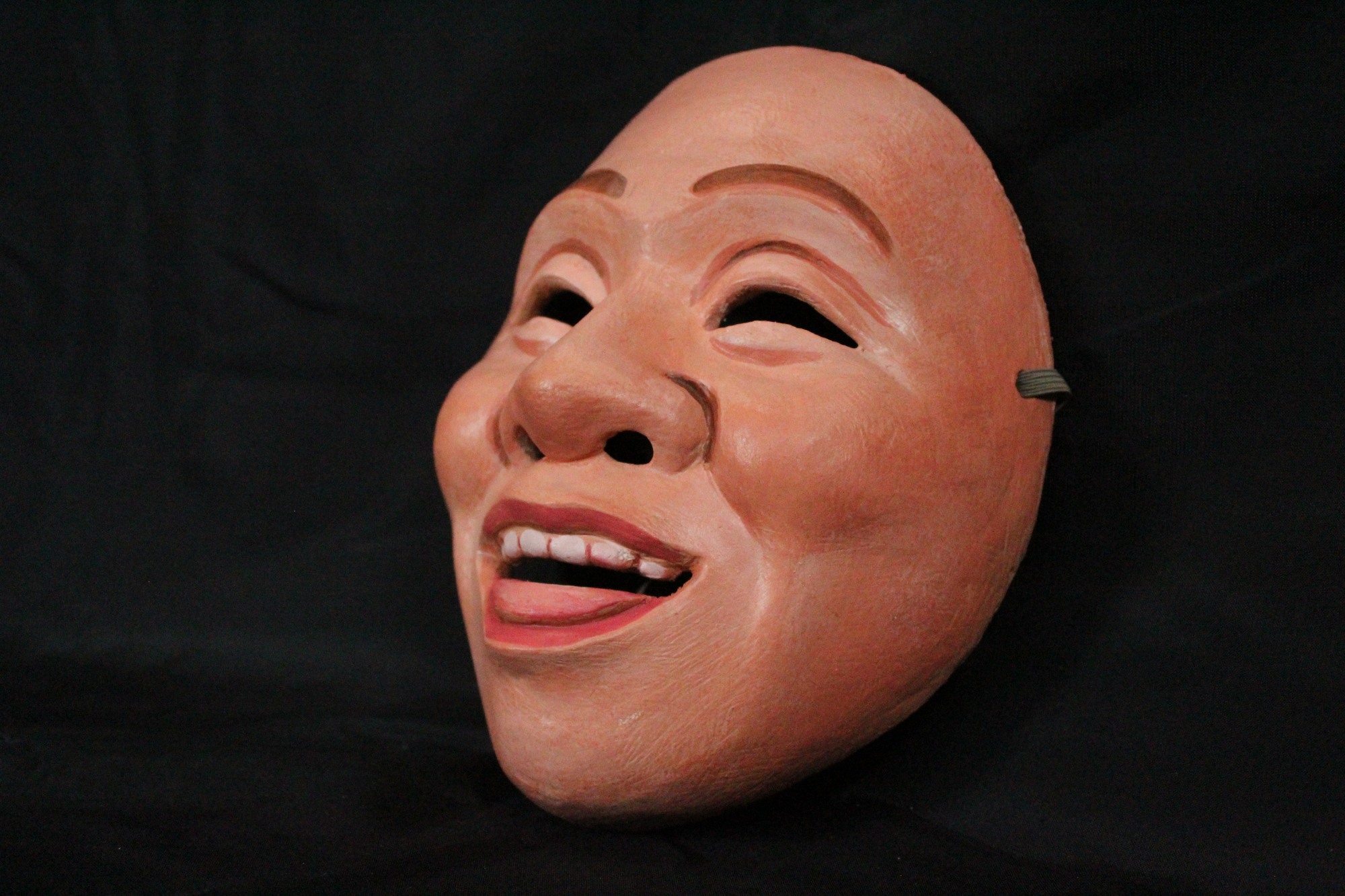 Smily. Plaster bandage, paper clay, decorated with acrylic paints. Smiling face in a happy expression. Eyes and brows raised, almost squinting from smiling. Mouth wide and open with top teeth showing, and tongue sticking out. Mask painted in flesh tones with eyebrows painted brown, lines around eyes and nose painted light brown/reddish, and teeth painted white with lips and tongue painted a deep pink/rose color.