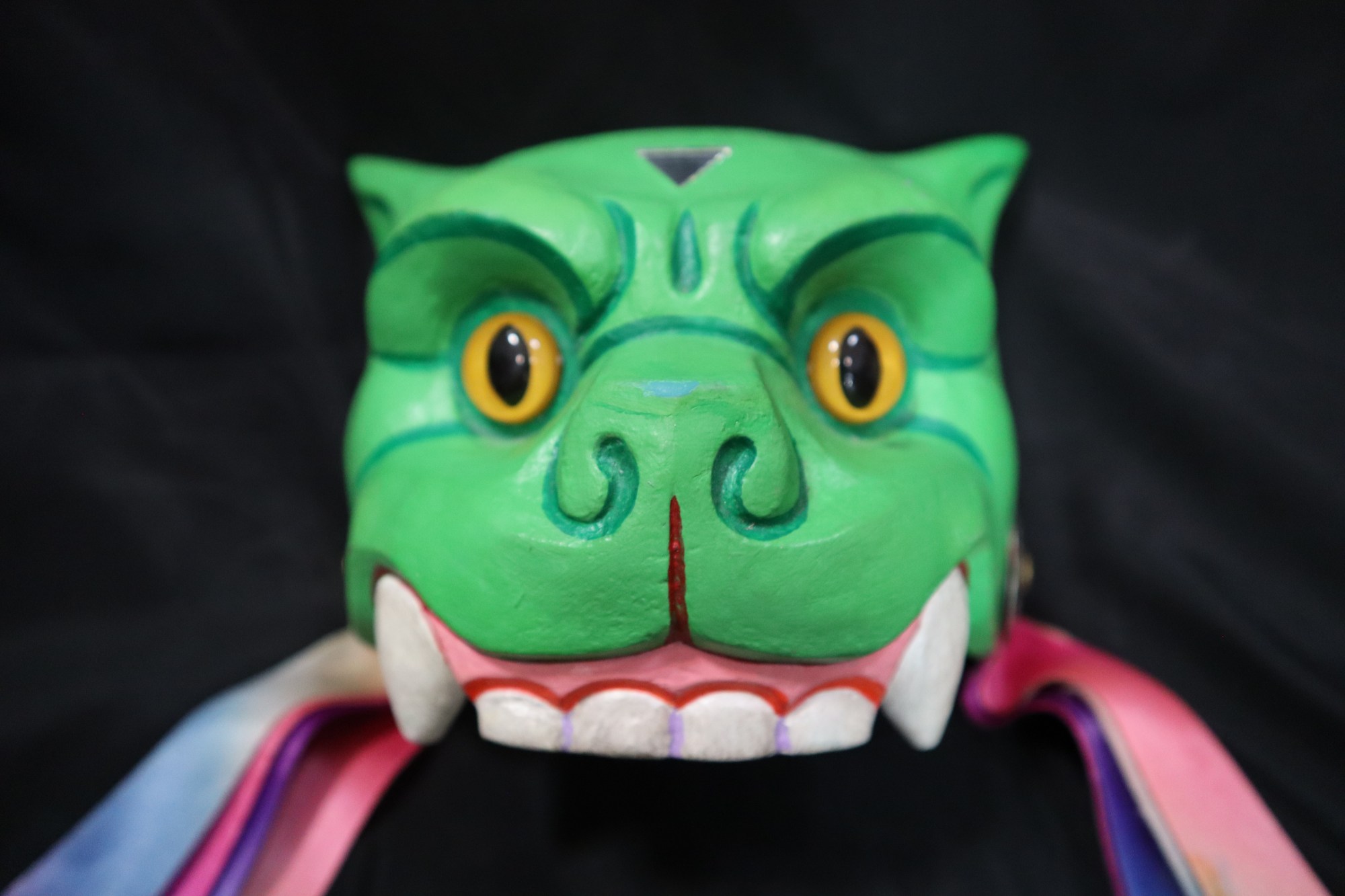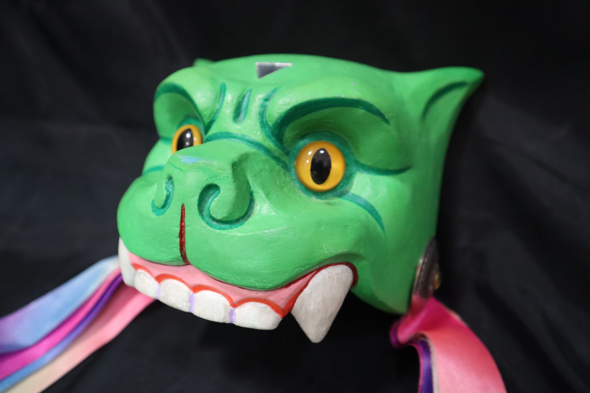 Jaguar Verde. Cast fiberglass, ribbons, metals, plastic, and acrylic paints. Bright green colored jaguar face, with an inverted triangle mirror on its forehead. Yellow plastic eyes and multi-colored ribbons on both sides of headdress with metal decorations on the sides