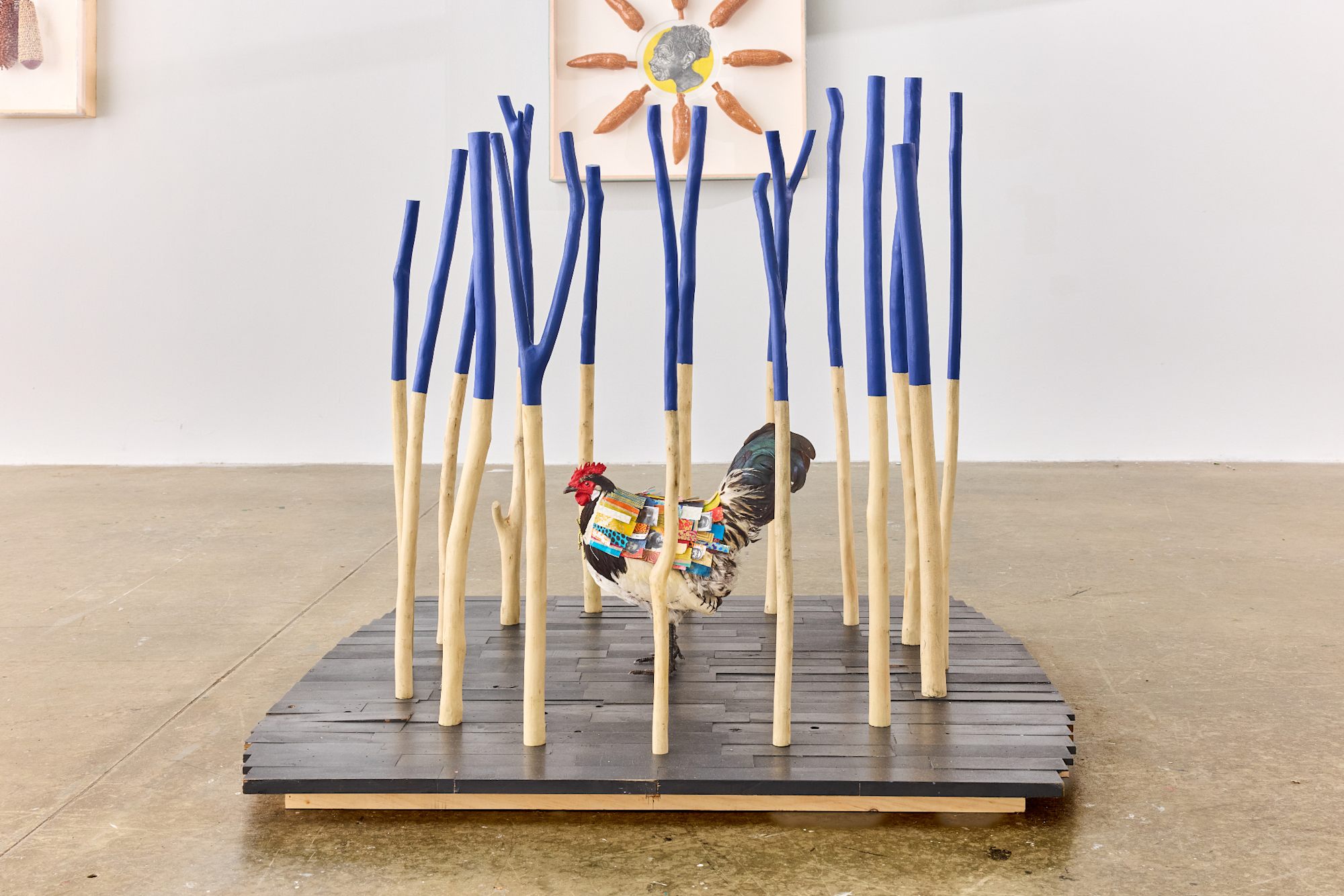 created in response to the carceral system that disproportionately ensnares Black men and women, this work references the qualities of survival and adaptation associated with the chicken in African culture as a way to inspire resiliency in the face of unjust circumstances . In this context, to strut is not merely a performative act of heightened self-regard, it is a cultivated state of being–a sign of the implacable nature of the human spirit.