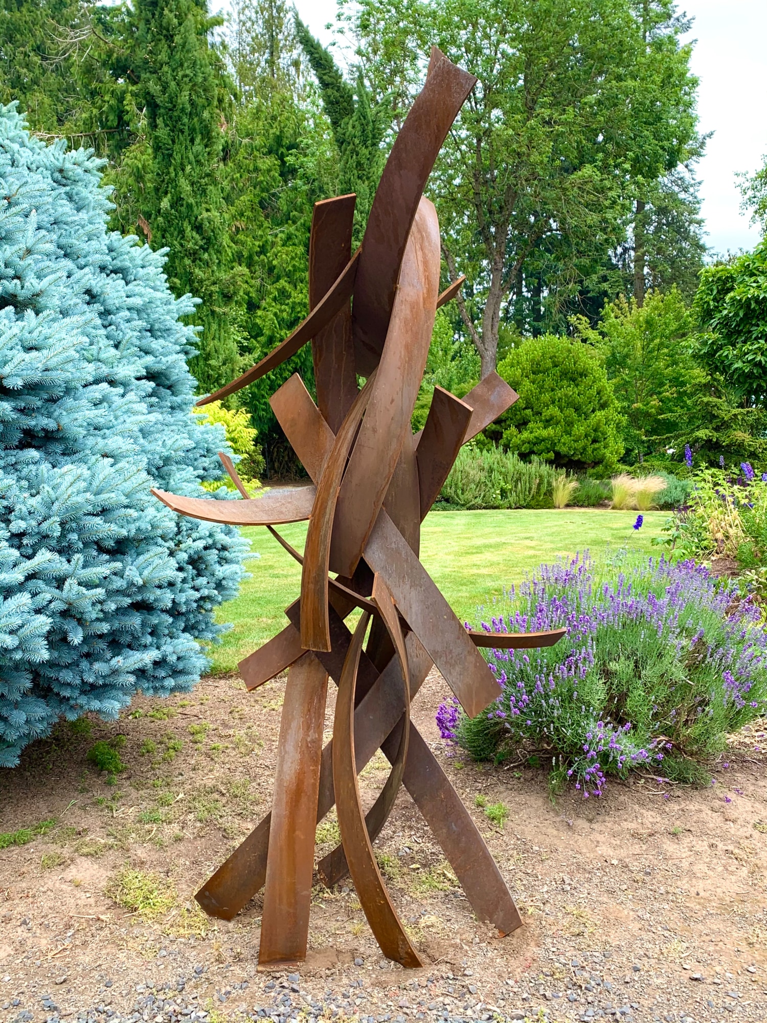 The weathered texture of the cor-ten steel mimics the scorched yet fertile aftermath of fire, embodying both destruction and regeneration. The arched forms suggest flames leaping skyward, their movement and rhythm reflecting fire’s dual role as both a destructive force and a catalyst for new growth.