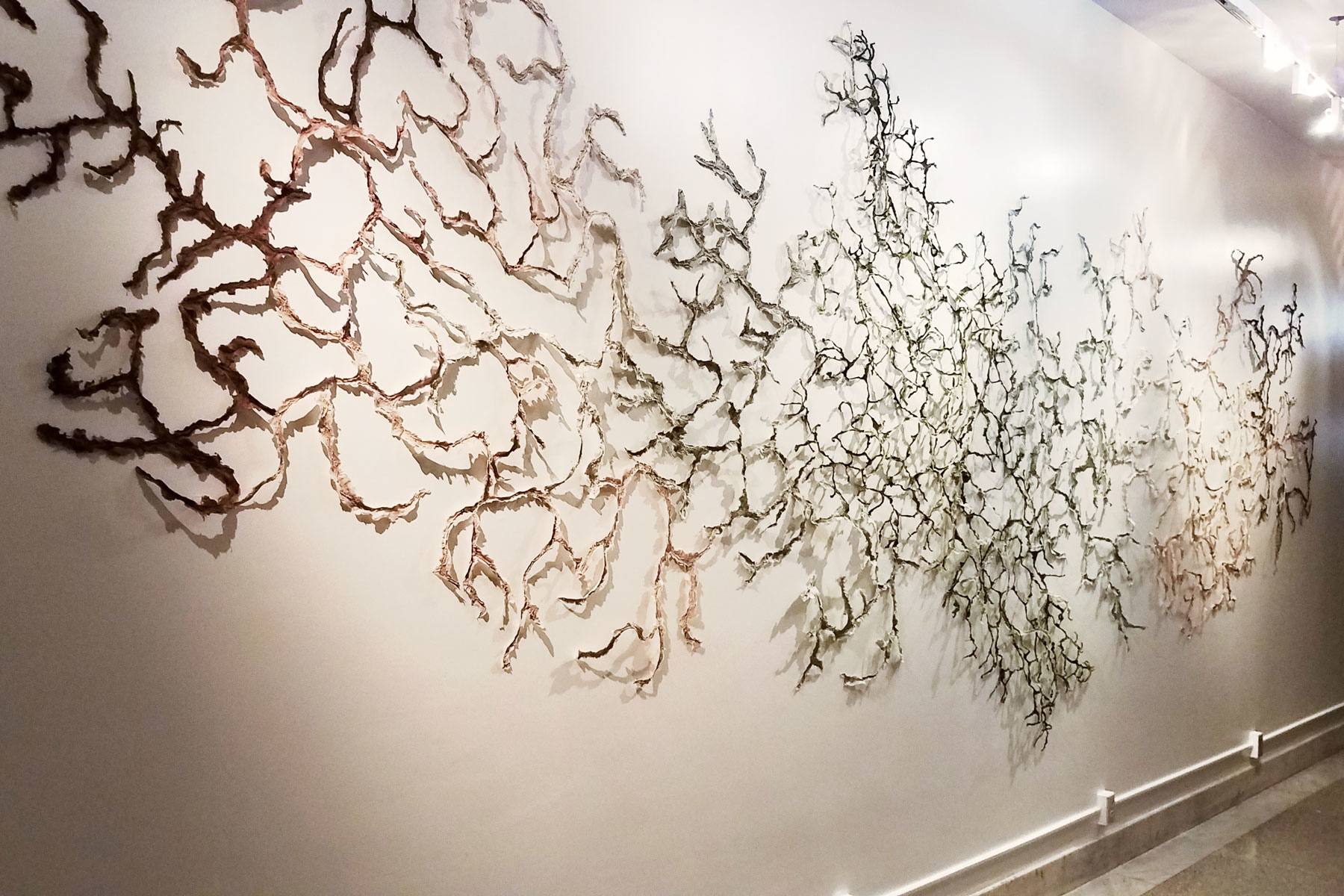MessagePart of the exhibition, ReSeeding the City and an attendant community forum, created to expose and explore a range of responses to the often contending forces of people and plants in the urban setting. Ebb and Flow VII is made from handmade paper crafted of local waste plant fibers, expressing the changing nature of Providence’s rivers, by collaborating artists May Babcock and Megan Singleton. Newly created for this exhibition, this dramatic installation is a nearly 25-foot long wall relief of handmade paper pulp harvested from local plant fibers, Woonasquatucket River mud, and wild urban plants. It wends its way across the entrance wall, following the dendritic paths of the Woonasquatucket River’s watershed map. The accompanying cyanotype diptych, Ebb and Flow VII: After Anna, uses plant pressing of wild urban plants to create the photogram silhouette. Over 40 species were documented along the road by the artist’s Providence studio.
