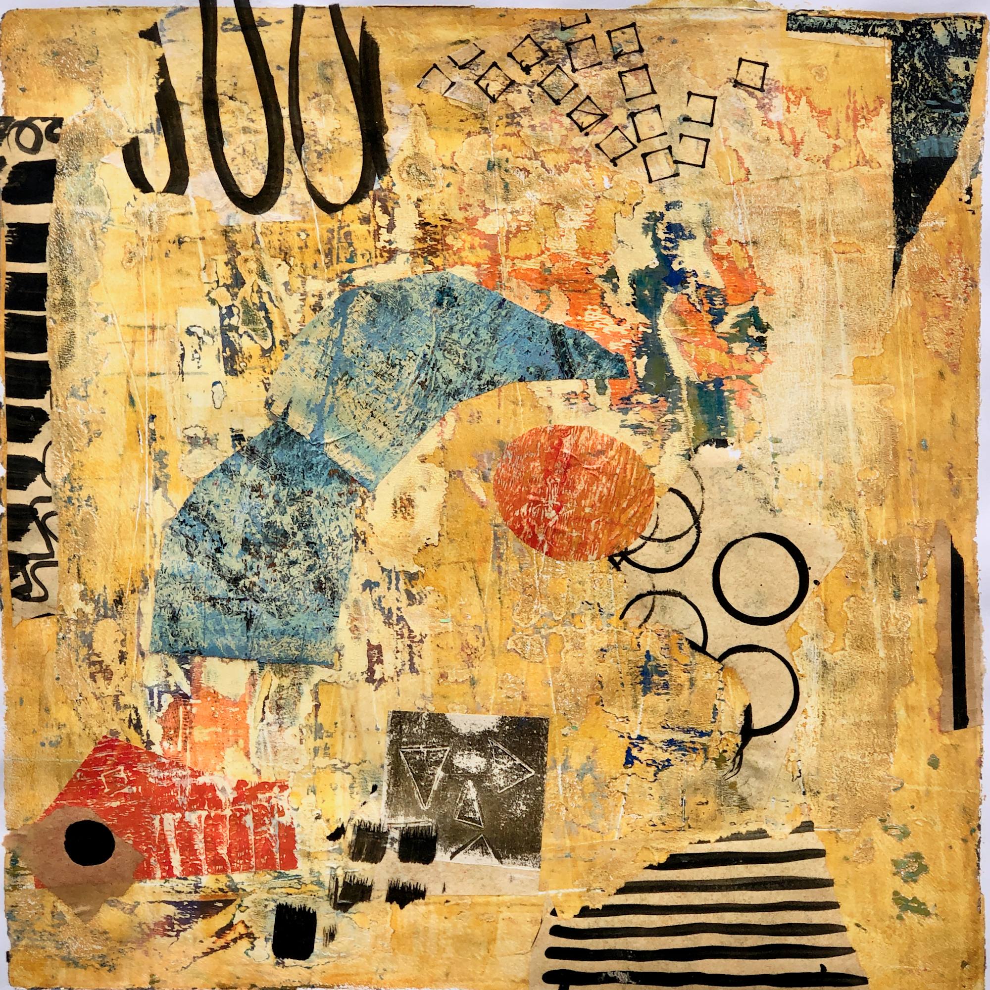 One-of-a-kind-type-of-artwork. Monotype from gelli plate. Collage added.