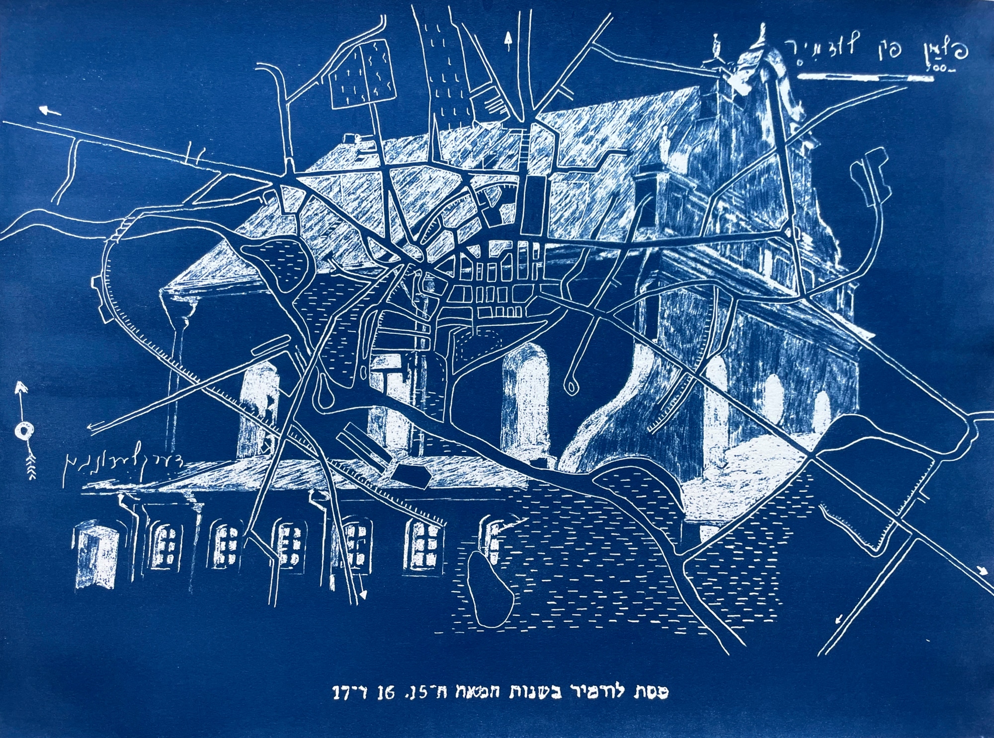 Rendering of the Great Synagogue of Slonim in Belarus overlaid with a shtetl map of Ludmir in Ukraine.