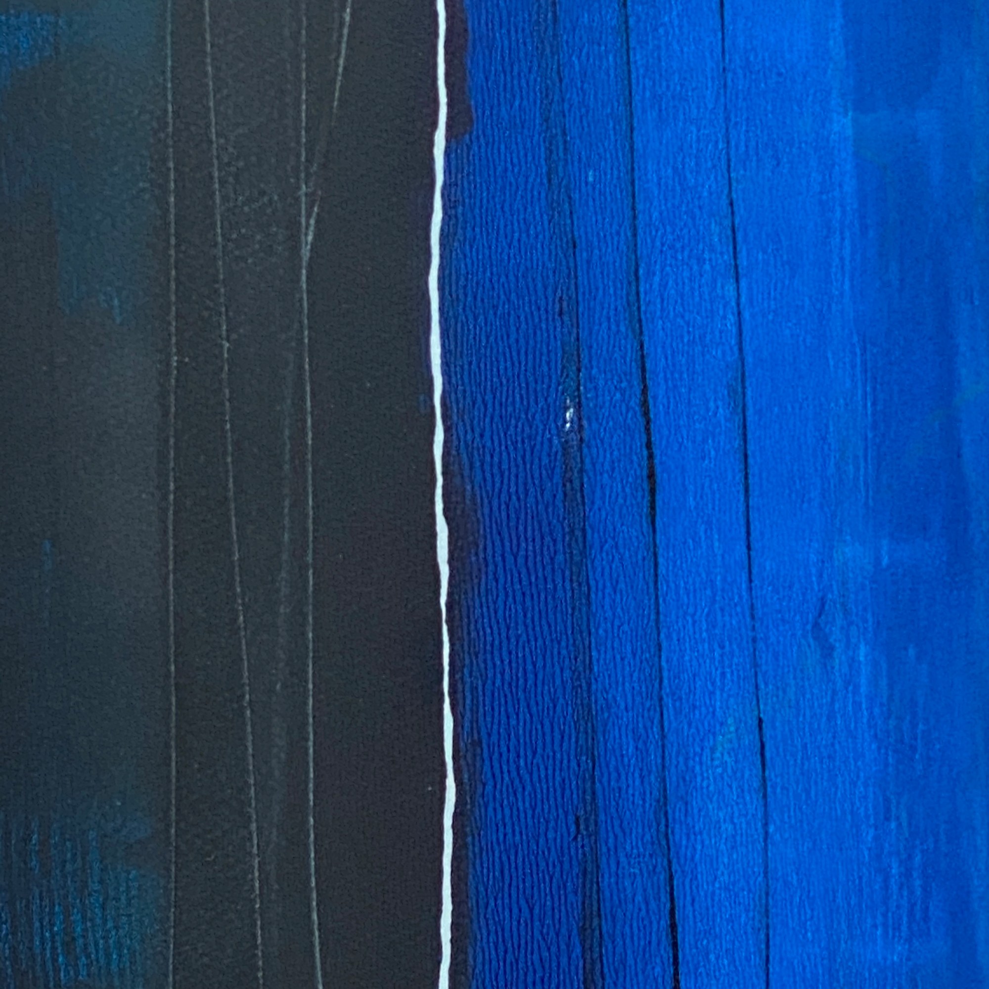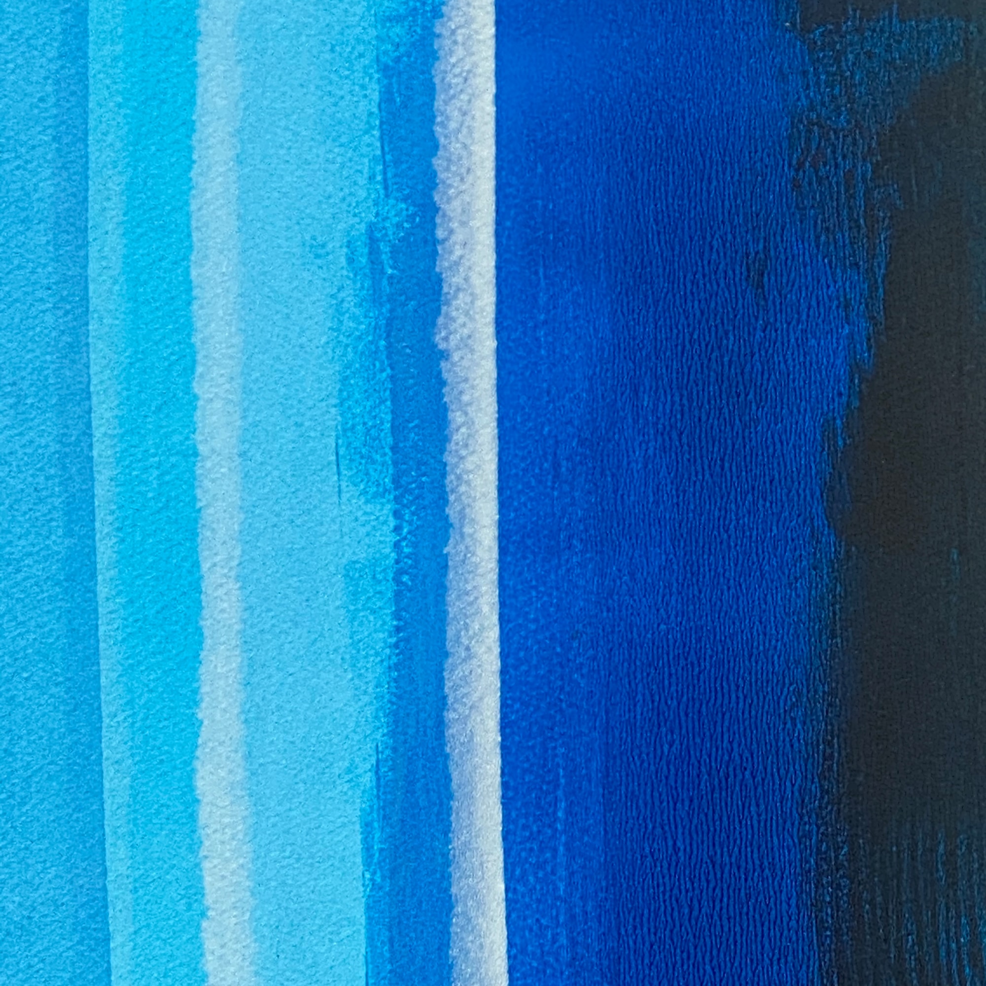 Evoking the colors of tropical seas, this work flows vertically with dark and lighter blues. The thinned viscous paint is applied with a hard roller to achieve the banding effect and to allow the wet paint to mix together on the surface.