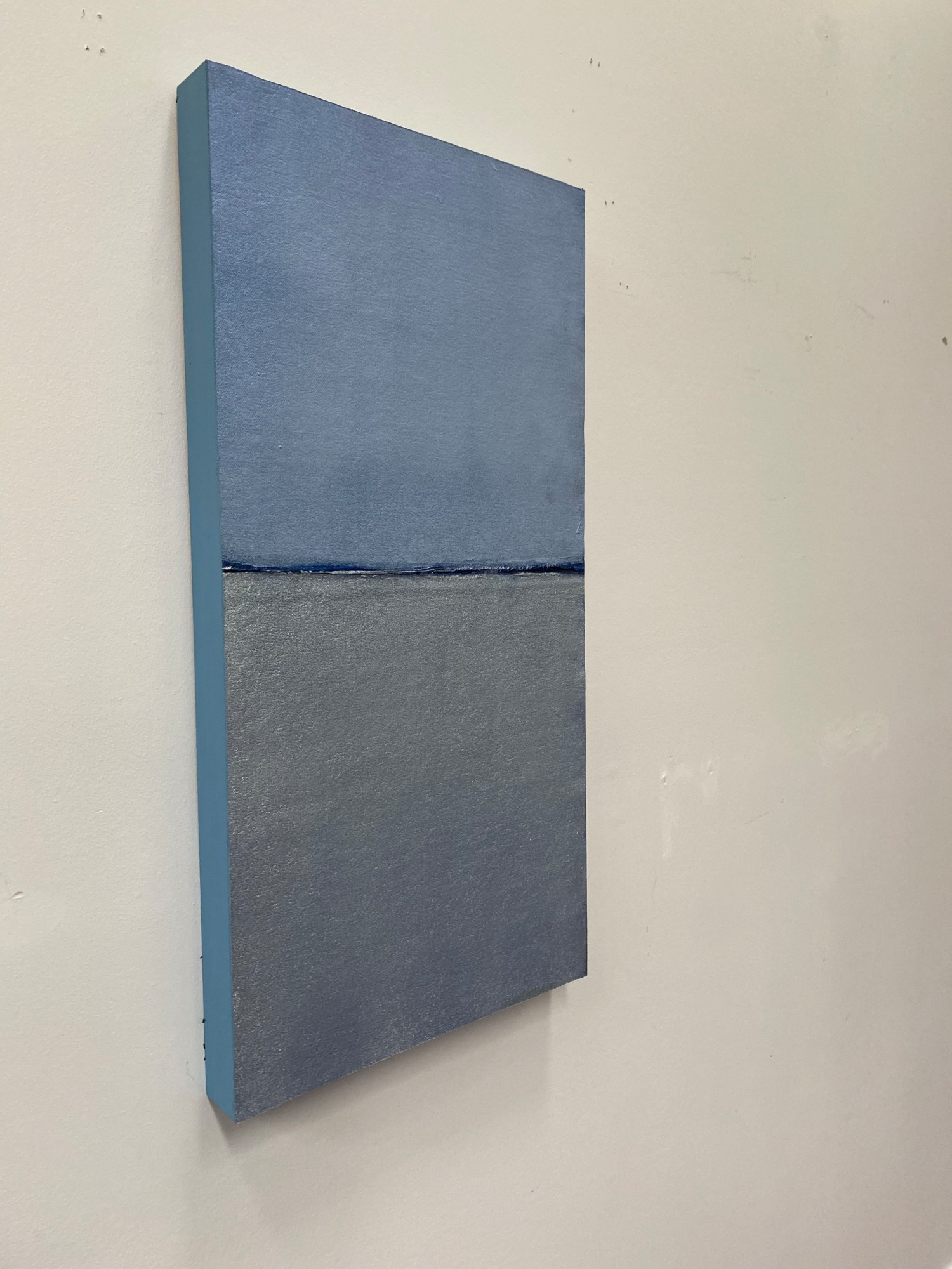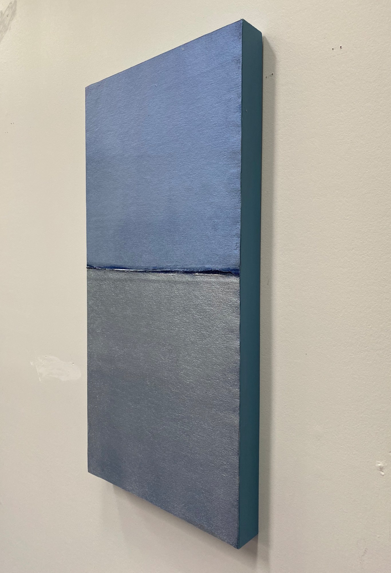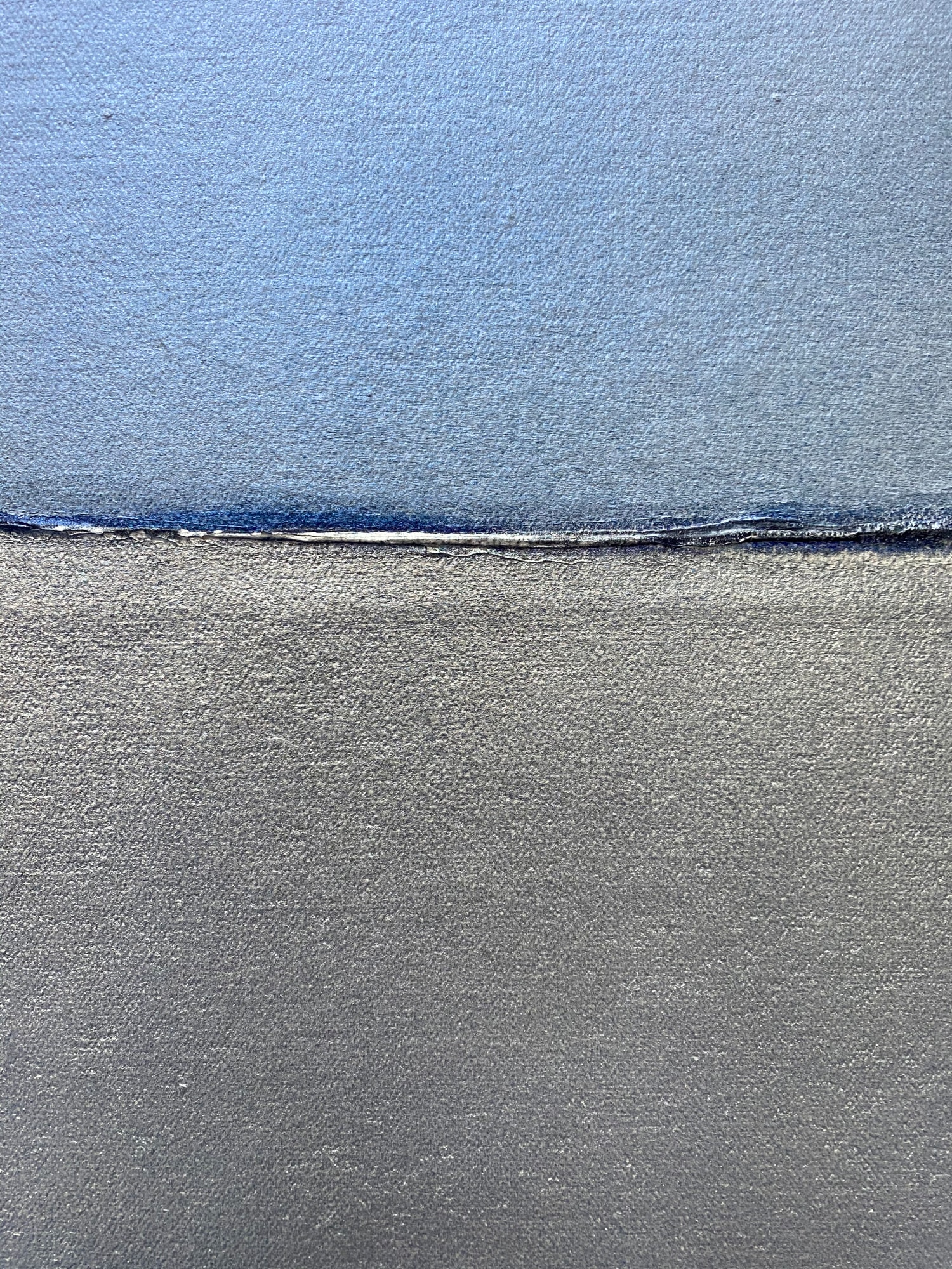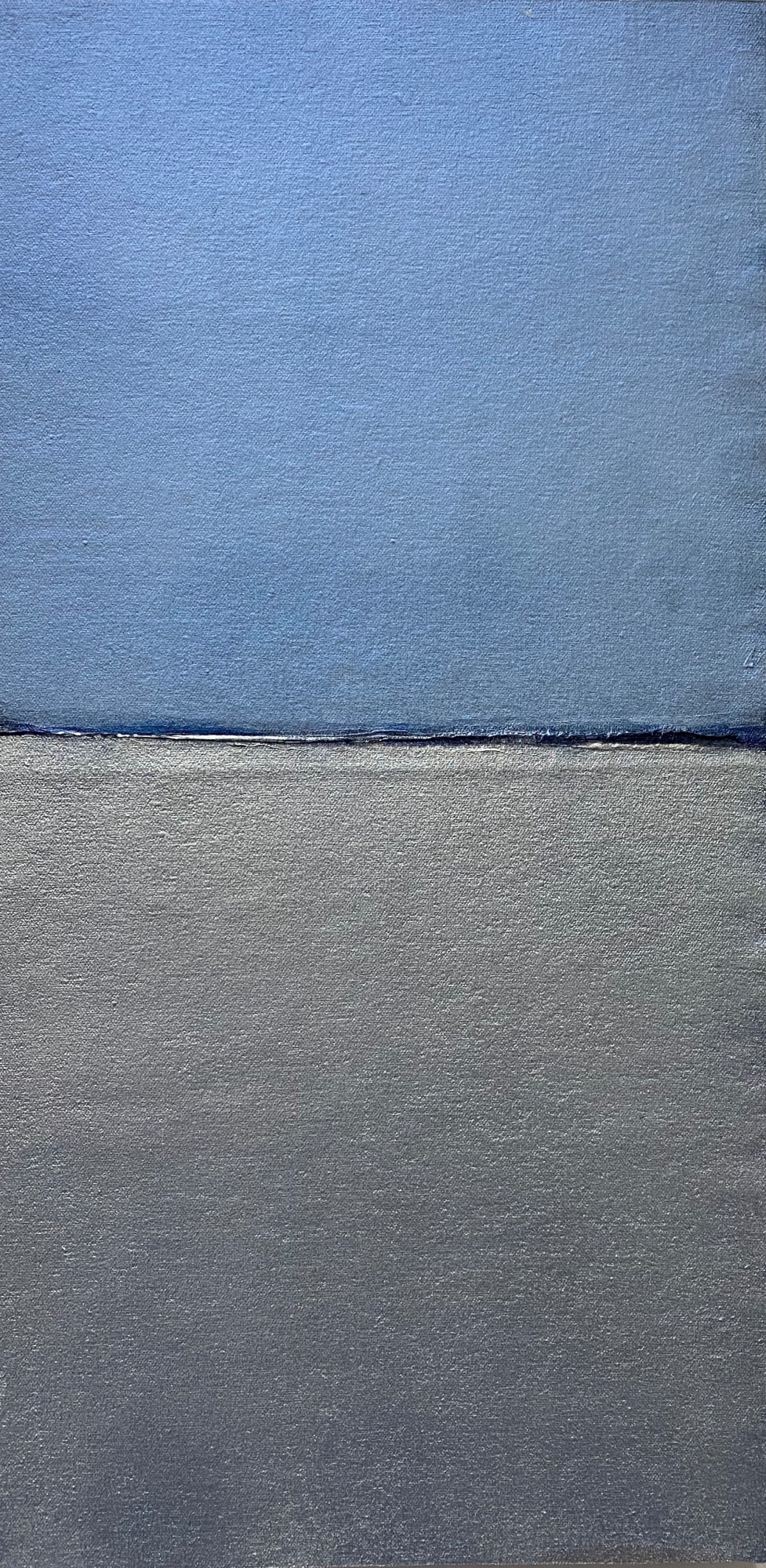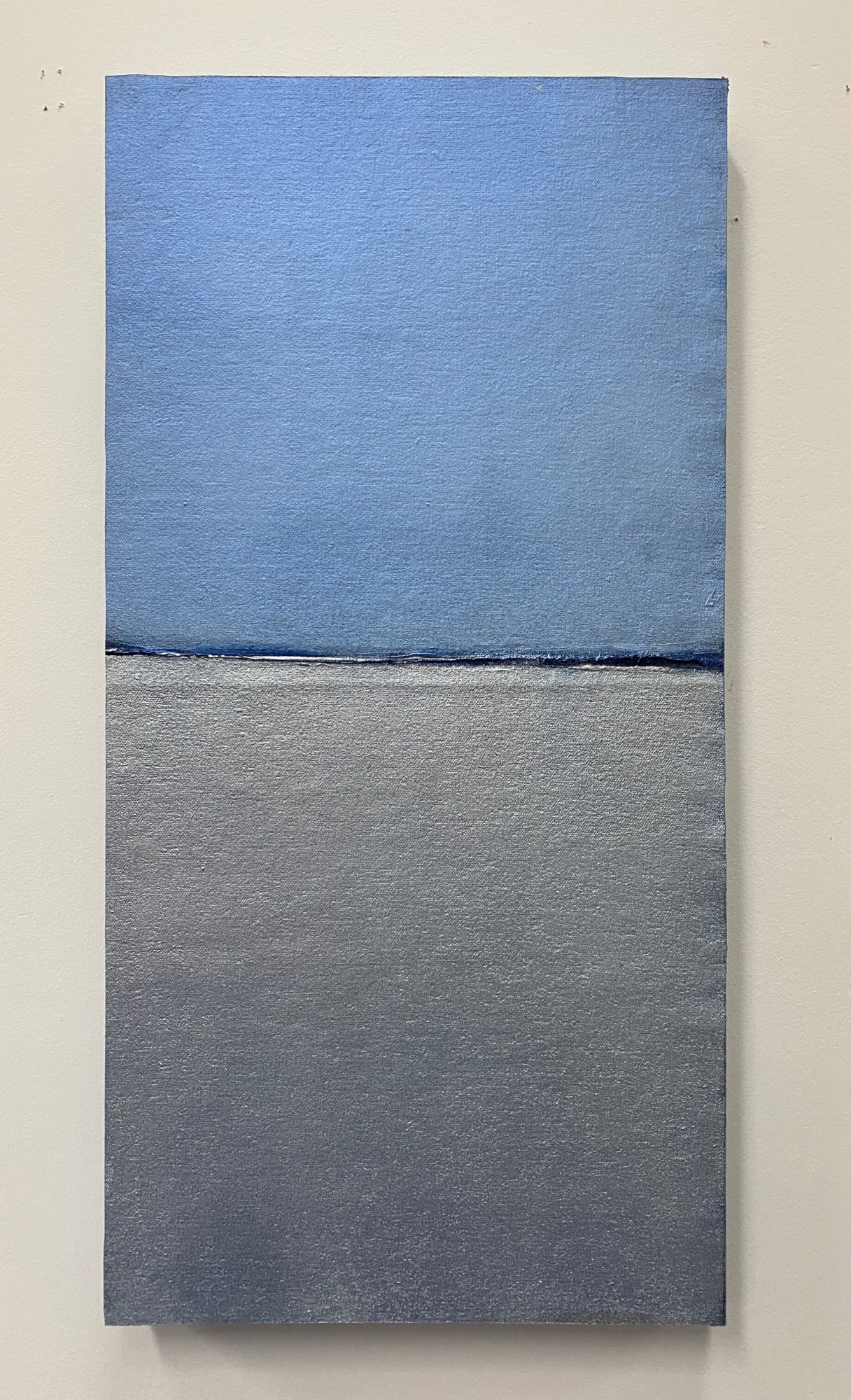 Reduced to two elemental rectangles, this minimal work explores the relationship of iridescent colors and shapes within a structural format.