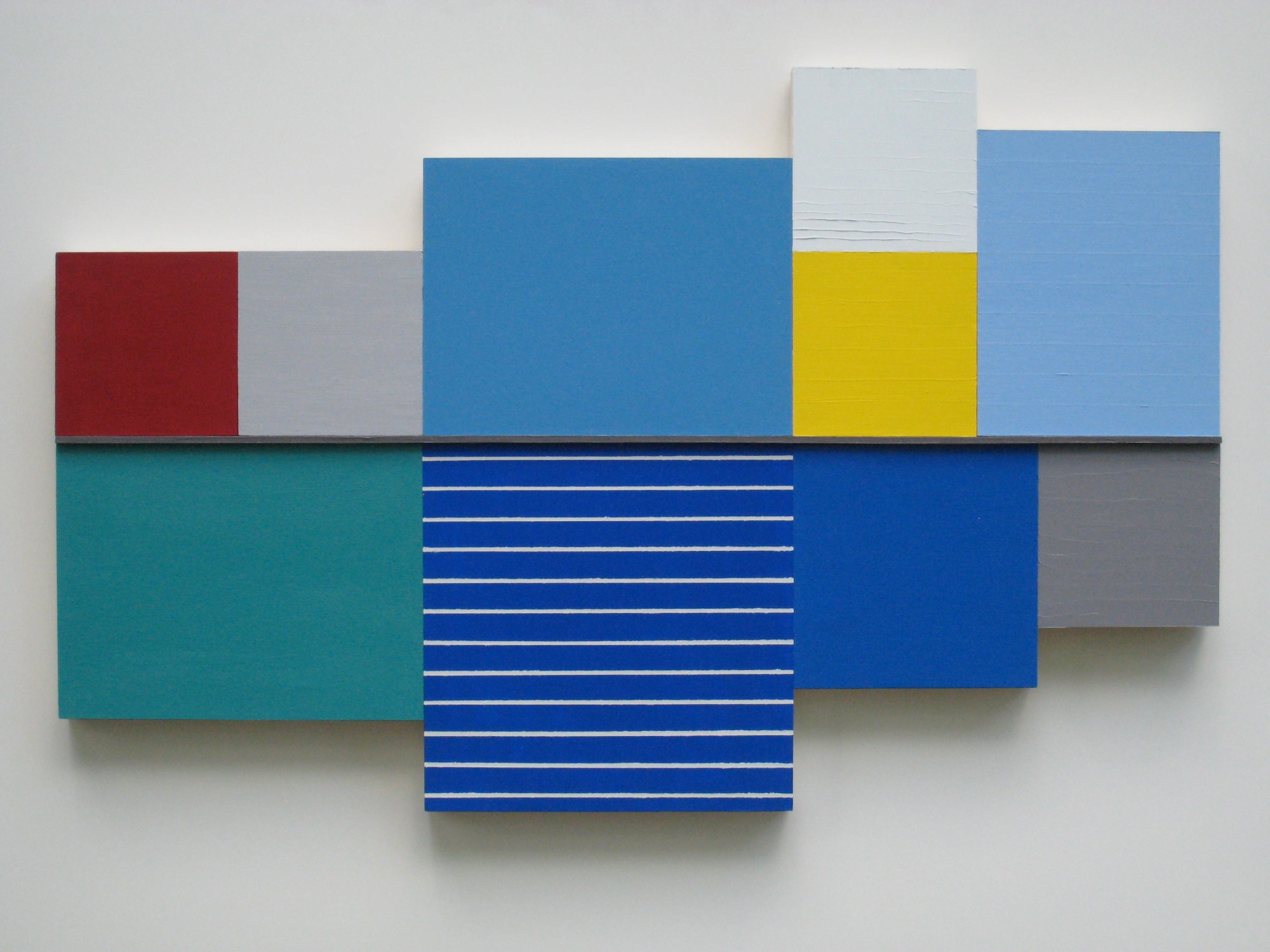 Each panel abstracts a part of this Caribbean beach. The yellow of the sun, the light blue, the sky, the red of the tile roofs and the greens and blues the colors of the water. The horizontal wood trim marks the horizon line.