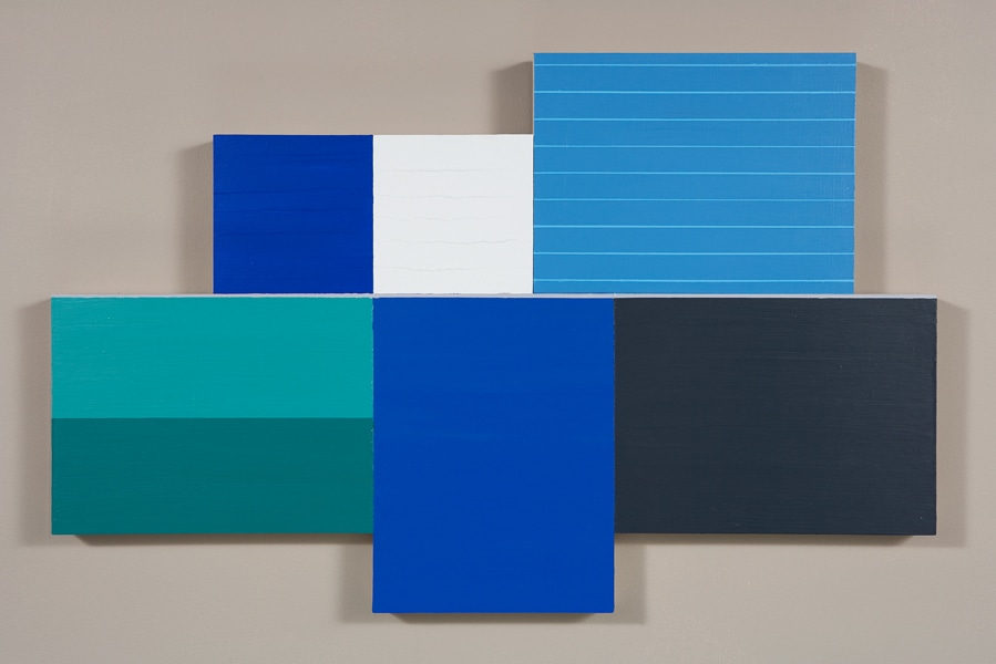 One of a series of assemblages with cool blues and greens of the water and the white of whitewashed villas evoking one of the 15 beaches on the island of Saint Barthelemy.