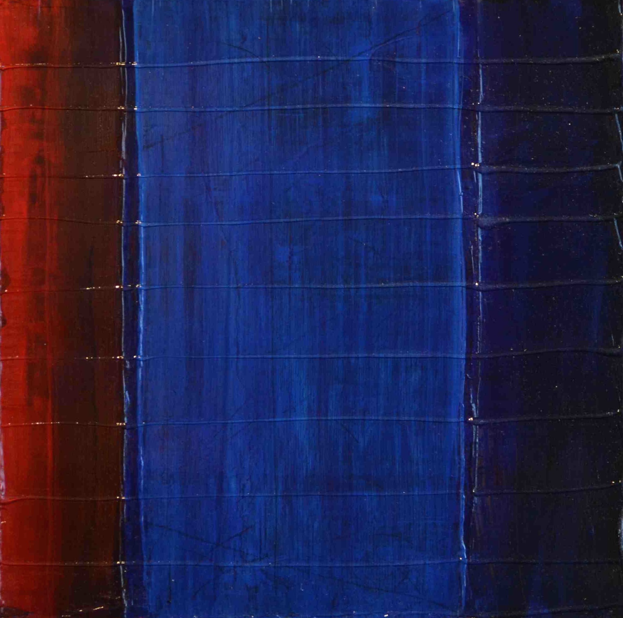 I am fascinated by looking through portals, doors or windows. This work is an abstracted window rendered in rich colors. I apply layers of thick paint in some areas and then drag a tool through it to create texture. Finally, I use glazes and related colors to create depth.
