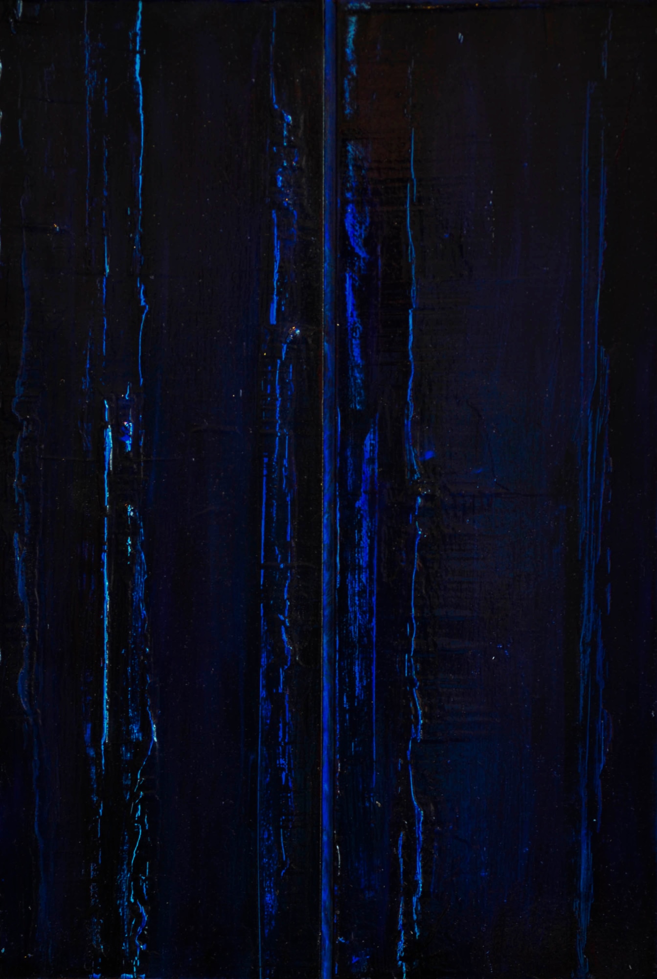 I am fascinated by looking through portals, doors or windows. This work is an abstracted window rendered in rich colors. I apply layers of thick paint in some areas and then drag a tool through it to create texture. Finally, I use glazes and related colors to create depth.