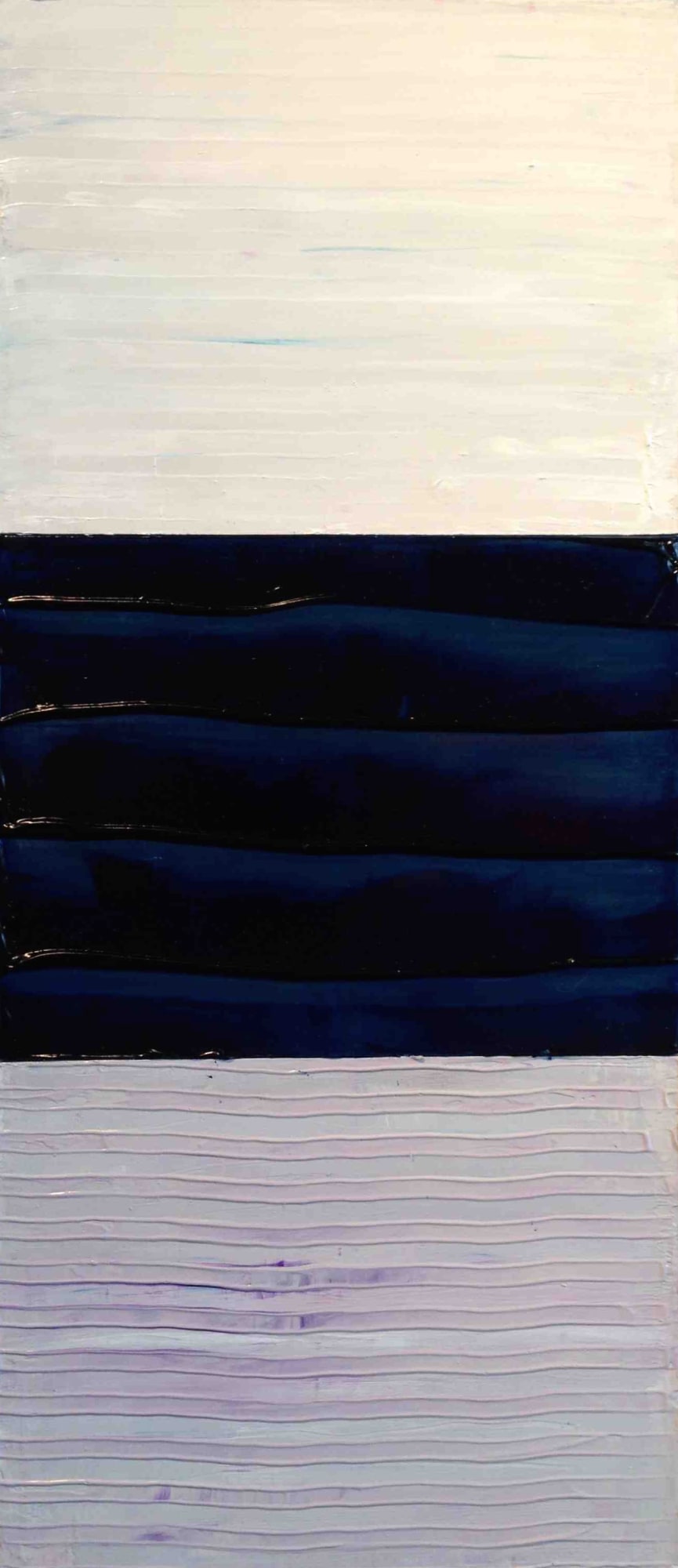 I am fascinated by looking through portals, doors or windows. This work is an abstracted window rendered in rich colors. I apply layers of thick paint in some areas and then drag a tool through it to create texture. Finally, I use glazes and related colors to create depth.