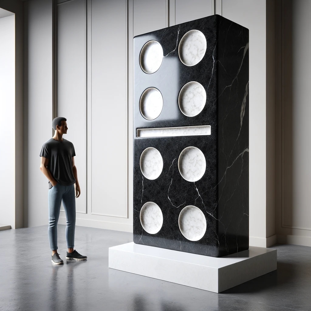 Crafted from the contrasting materials of black stone and white marble, "Domino" stands at an imposing height of 8 feet on a 1-foot tall white base, symbolizing the overwhelming force with which economic downturns can impact individual lives and entire societies. The sculpture's stature is not just a physical attribute but also a metaphor for the potential consequences of the domino effect in the economy—just as the sculpture could crush a person if it toppled over, so too can the economic waves and turmoil crush individuals and communities.