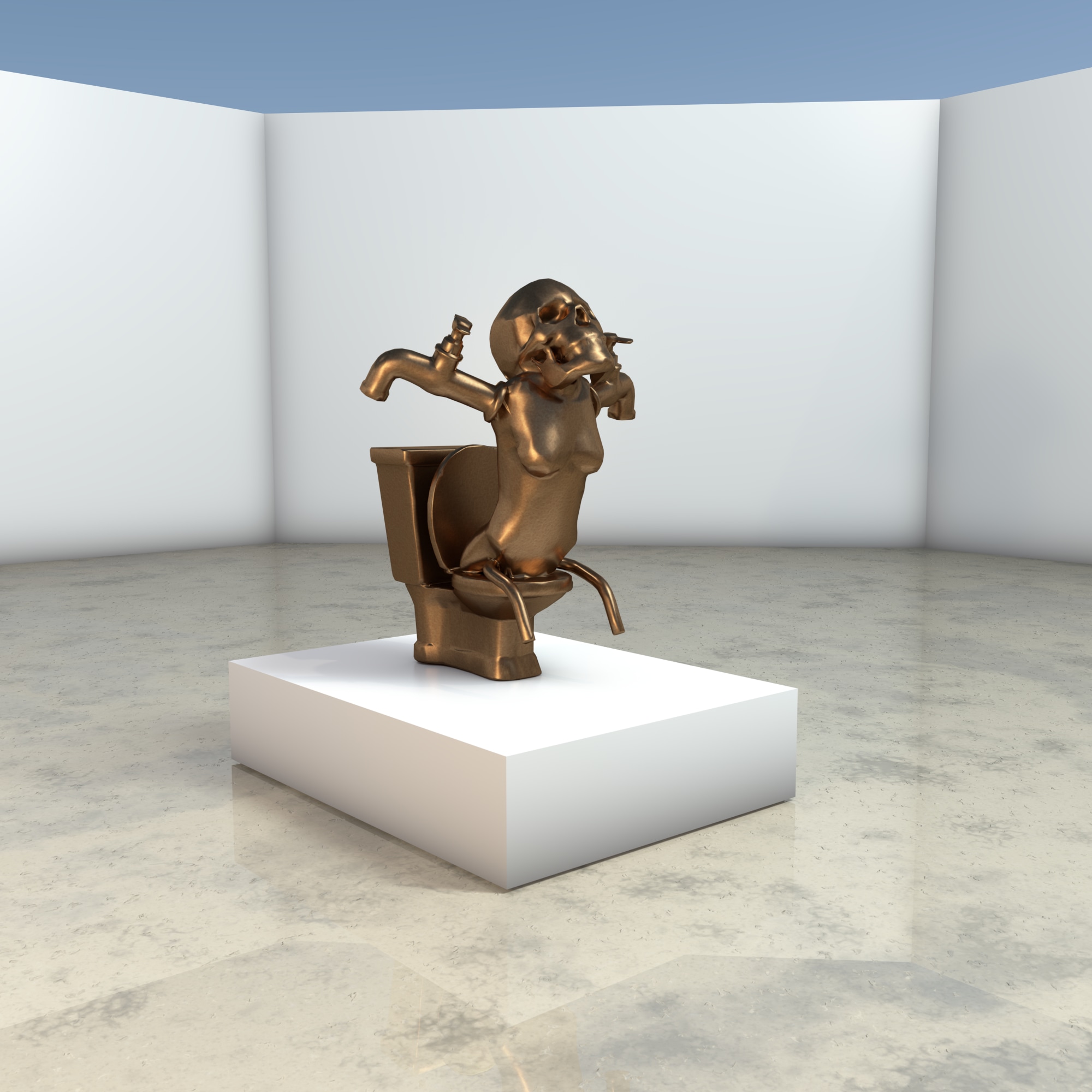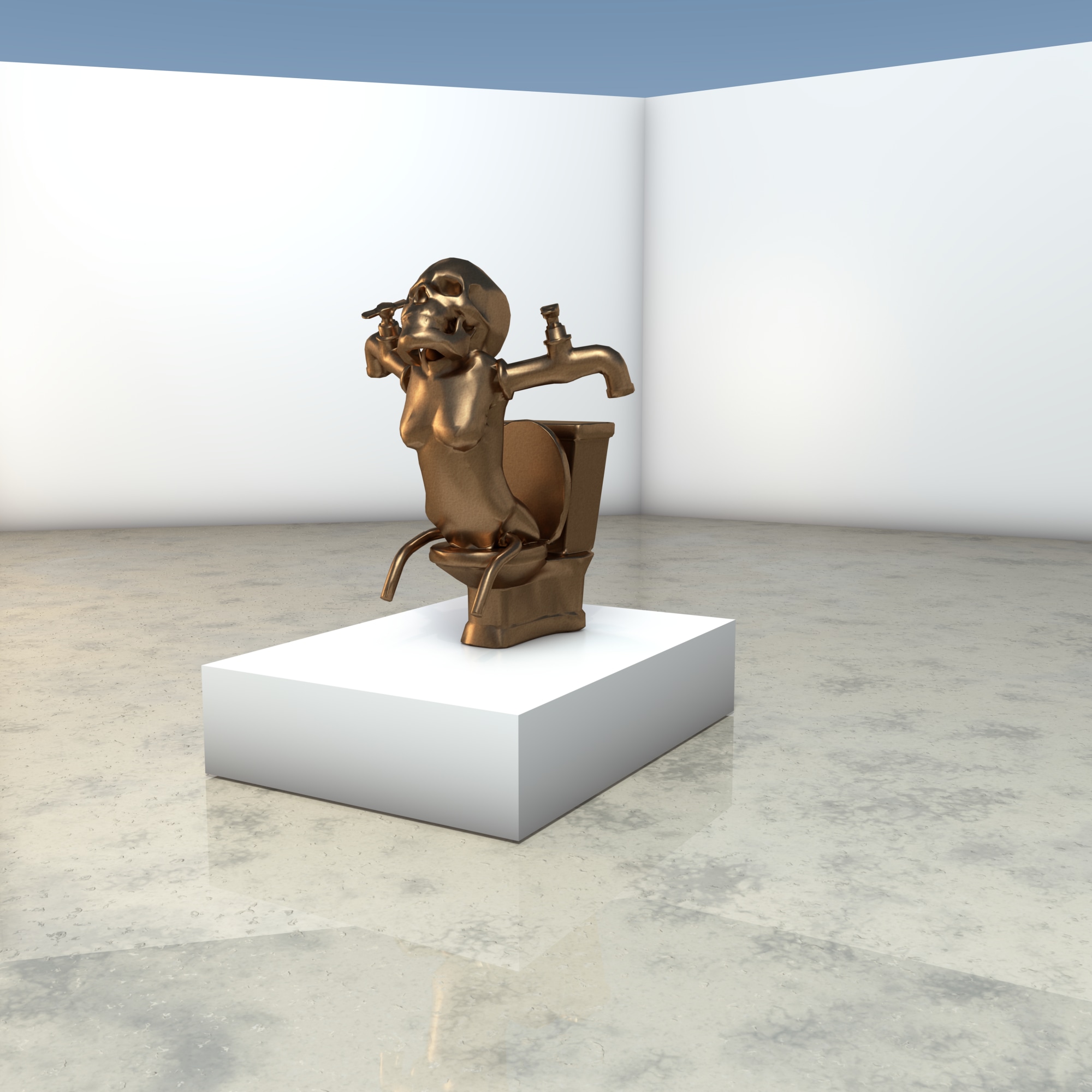 The horns that protrude from the figure are inverted echoes of Picasso’s Bull’s Head (1942), doubling as a symbol of virility and collapse. Created in March 2020, during the COVID-19 pandemic and a 30% global market crash, these horns read as an emblem of economic fragility—a bull market turned upside down. The toilet, absurd and abject, alludes not only to Duchamp’s Fountain and Cattelan’s America, but also to the infamous image of Elvis Presley’s death and Francis Bacon’s grotesque intimacies with mortality. Here, the banal becomes a site of existential reckoning.