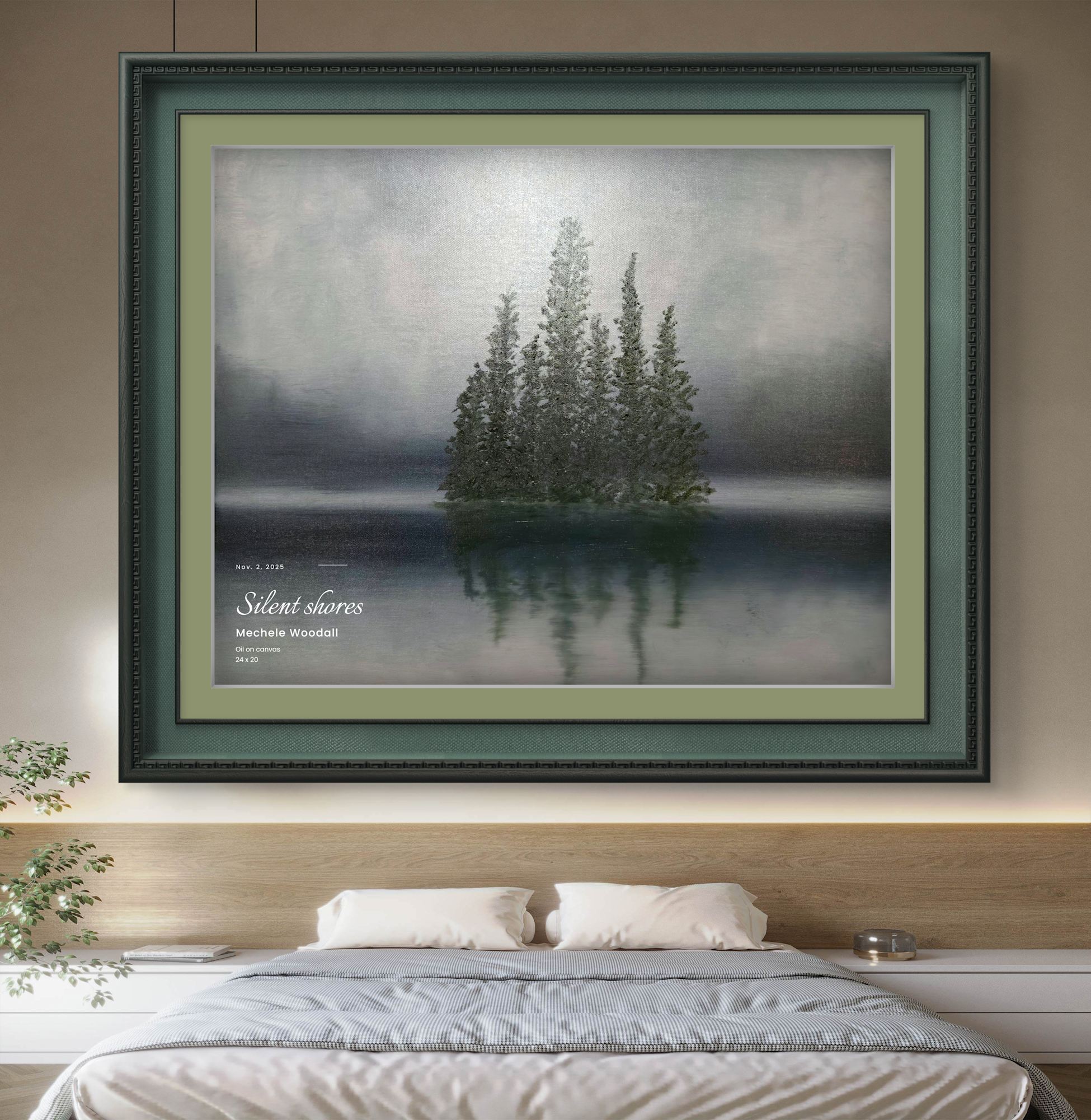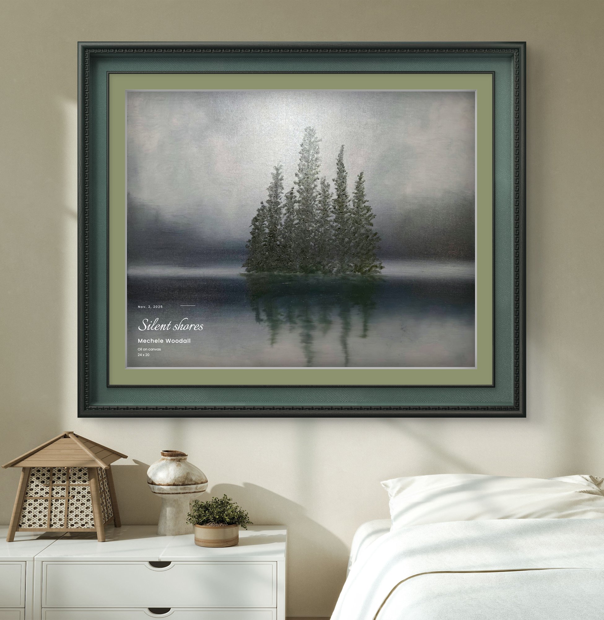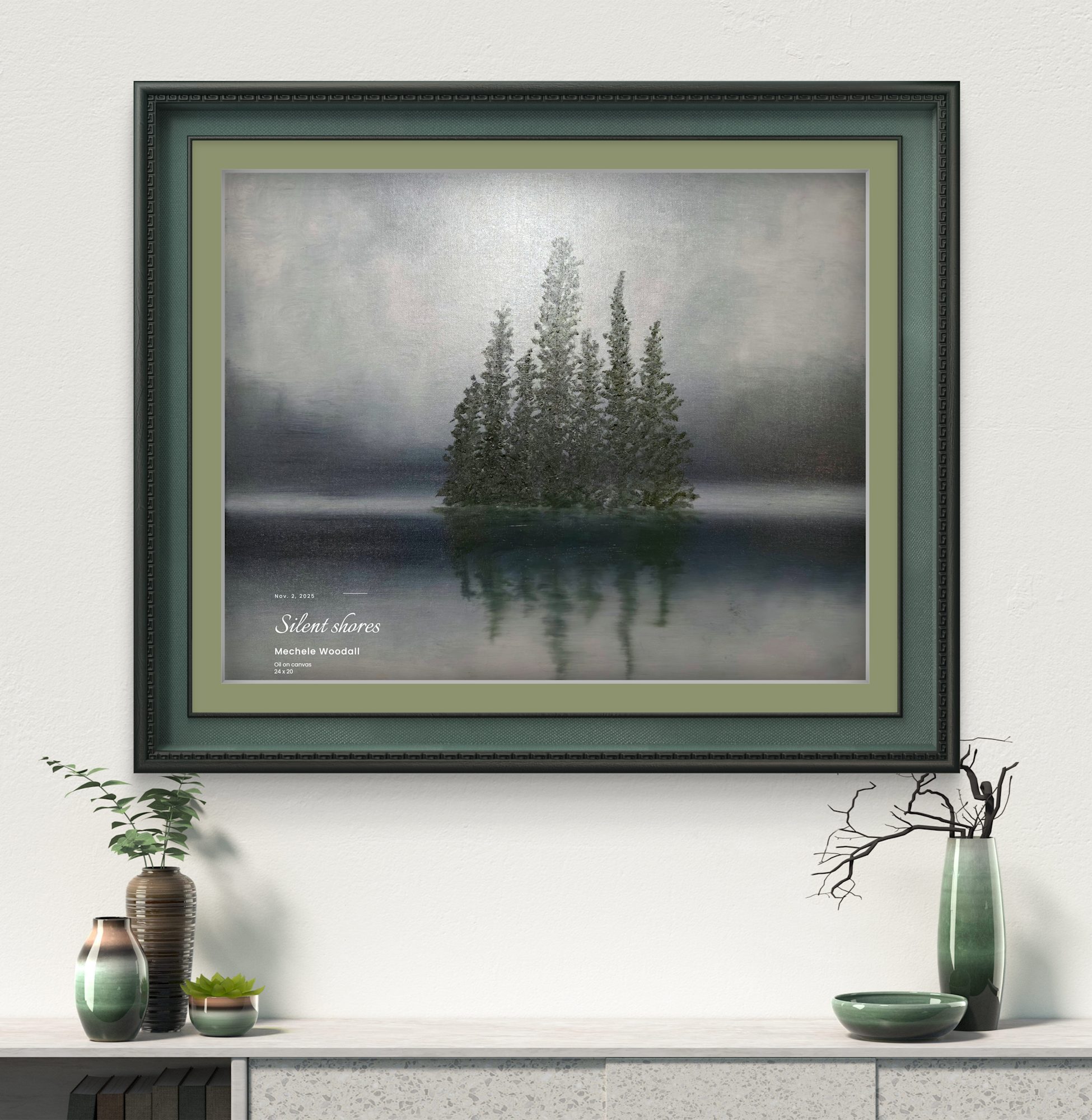 Silent Shores presents a quiet realm where stillness and subtle mystery converge. A slender group of trees rises delicately from a small, solitary island, their forms softened by a veil of mist that permeates the scene. Muted shades of blue, green, and grey blend seamlessly, folding the landscape into a hushed atmosphere that borders on the spectral. The water gently reflects the trees, enhancing the feeling of stillness and solitude. This composition evokes a poignant solitude—an invitation to pause within a space suspended between waking and dreaming, where the quietude of nature reveals both fragility and enduring presence.