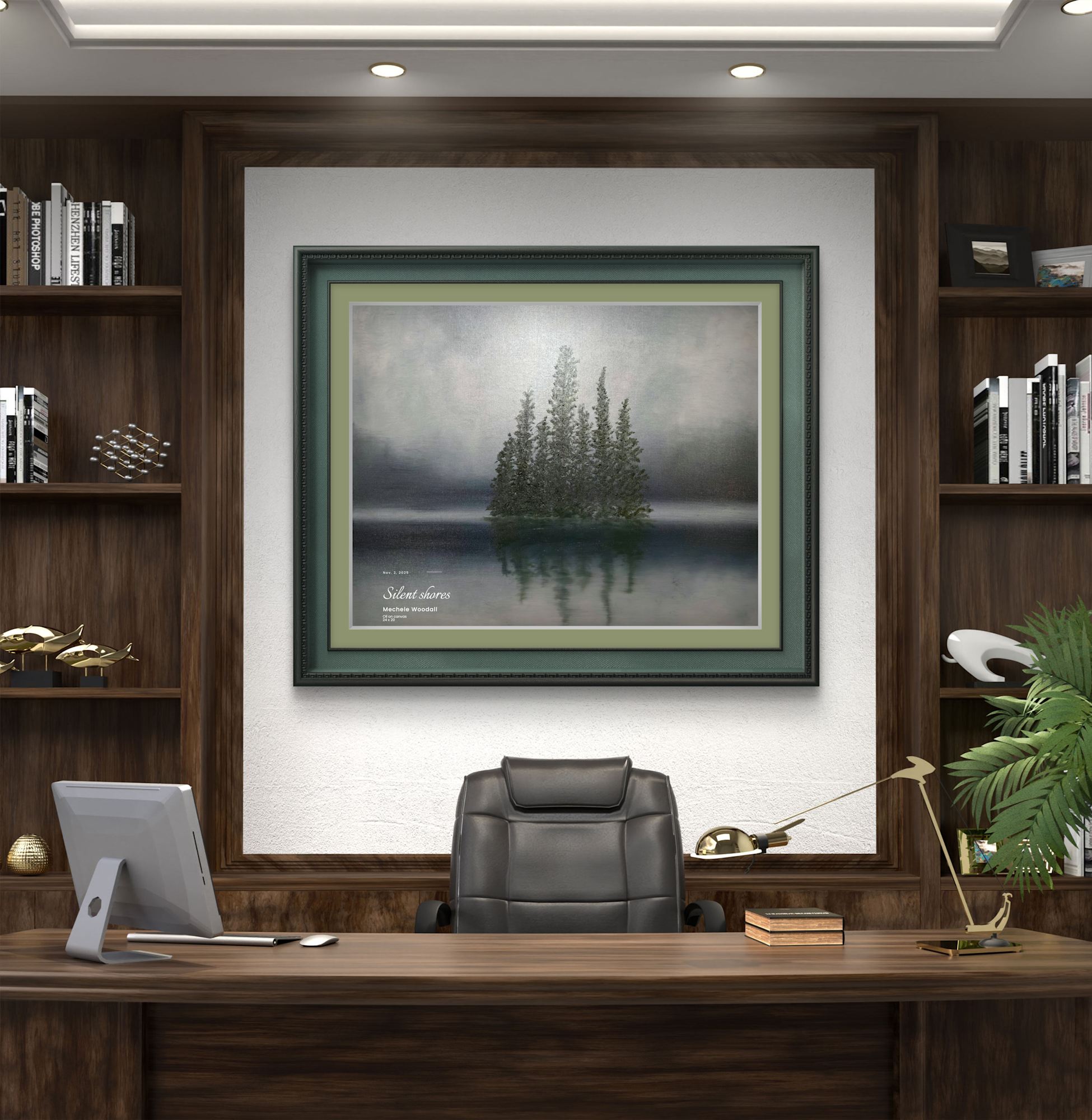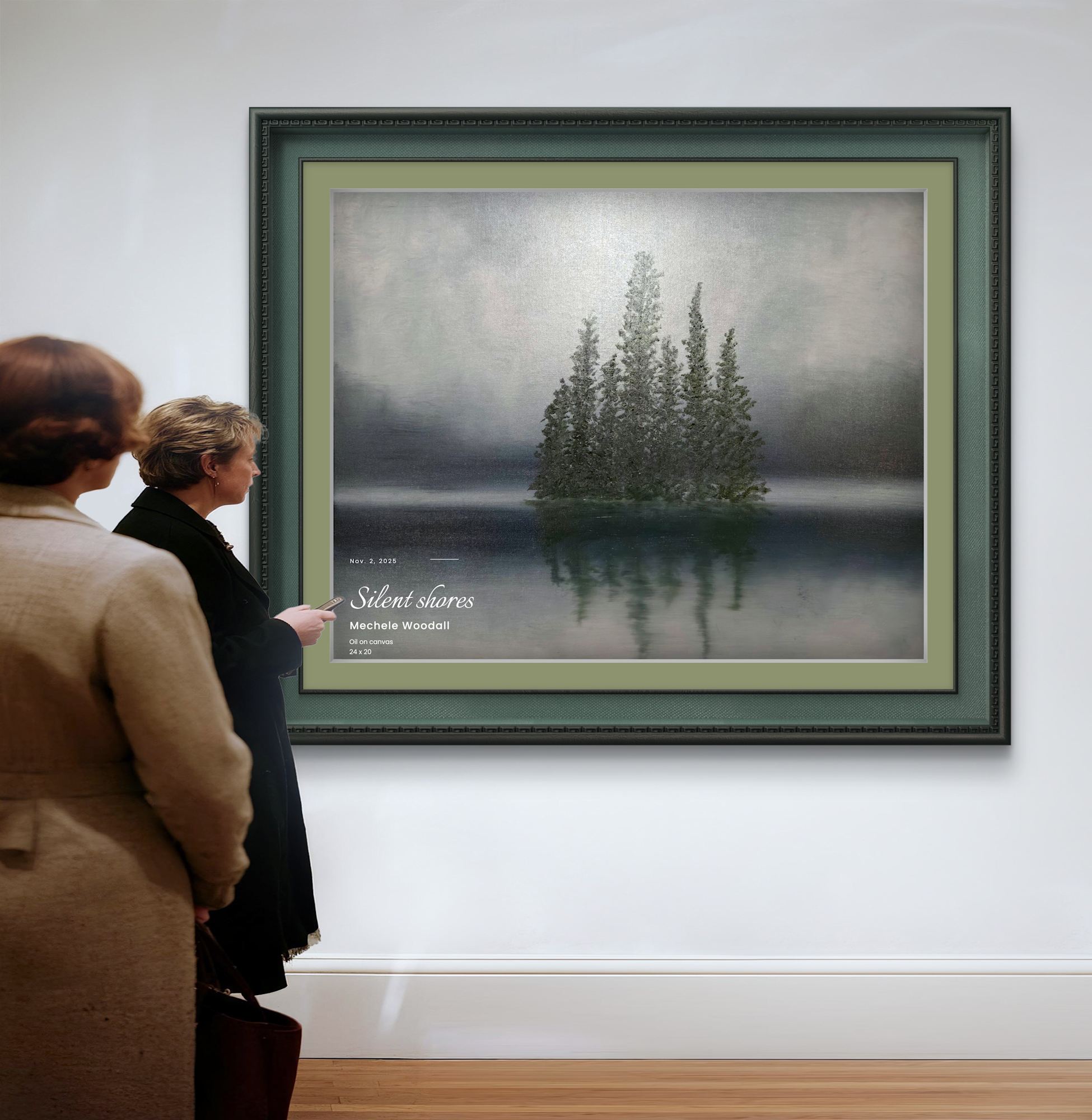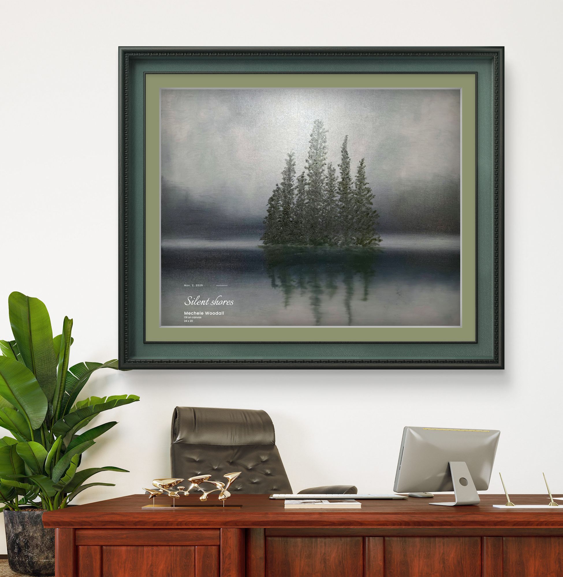 Silent Shores presents a quiet realm where stillness and subtle mystery converge. A slender group of trees rises delicately from a small, solitary island, their forms softened by a veil of mist that permeates the scene. Muted shades of blue, green, and grey blend seamlessly, folding the landscape into a hushed atmosphere that borders on the spectral. The water gently reflects the trees, enhancing the feeling of stillness and solitude. This composition evokes a poignant solitude—an invitation to pause within a space suspended between waking and dreaming, where the quietude of nature reveals both fragility and enduring presence.