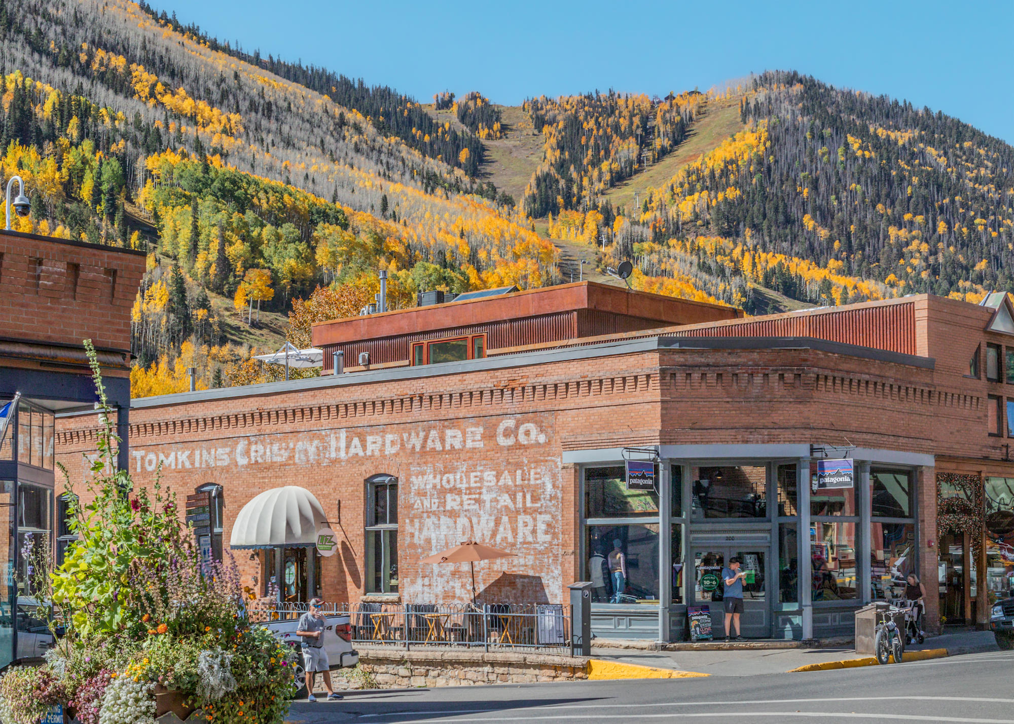 A trendy clothing store in Telluride, Colorado sports an old pharmacy billboard in brick on the side of the buildin. Trailing up from behind is the barely seen modern enclosed non-stop gondola crossing paths with an old ski lift. Telluride is an old mining town with a new tourist facelift. If it hadn't been an old mining town I don't know why every other building was originally a bank. Telluride sits in the shadow of skyscraper mountains on three sides.